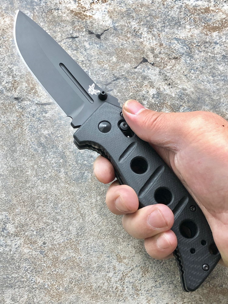 类 型: 折刀全 长: 227mm刃 长: 88mm刃 材: D2硬 度: 62HRC刃 厚: 4mm刃 宽:31mm重 量:220g 含套253g产 地: 美国蝴蝶的275 Adamas系列作品是由定制刀匠Shane Sibert与美国军方代表Major Jeff Strueker所共同合作的战术作品。Major Strueker在1987-2011年期间服役于美国陆军,其大多数时间隶属于第75游骑兵团(The 75th Ranger Regiment),此外他还是蝴蝶刀具的忠实粉丝。Adamas系列作品尺寸和分量感十足,适合把握且破坏力十足,完全符合战术需求。 这把275BK 是由D2工具钢锻造的水滴头折刃,在野外环境下能提供出色的切削能力和易打磨能力。D2钢的全刃刀身切削性能出色,钢材的强度和较大尺寸让刀具更加适合劈砍,为了更好的保障刃部的完整性,刃身的减压血槽可以有效的将刃部受力进行分散。刃身表面使用黑色涂层处理,更加防锈也更符合战术使用。 刀柄拥有黑色涂层的不锈钢内衬,有效的保障的柄部强度,外部使用黑色G-10材质贴附以提供出色的手感。刀柄部分使用镂空切割技术刻有减重/排汗孔,既能有效减轻刀具重量也能在长时间握持后也不易出现手部出汗的情况。刀柄尺寸非常适合手握,在戴手套情况下也能舒适握持。刀具使用刀根出的双头拇指螺柱推开,柄使用蝴蝶著名的轴索机制收刀。刀具还配备一个可换边安装的黑色刀夹和拥有携行装置的黑色重型尼龙刃鞘。