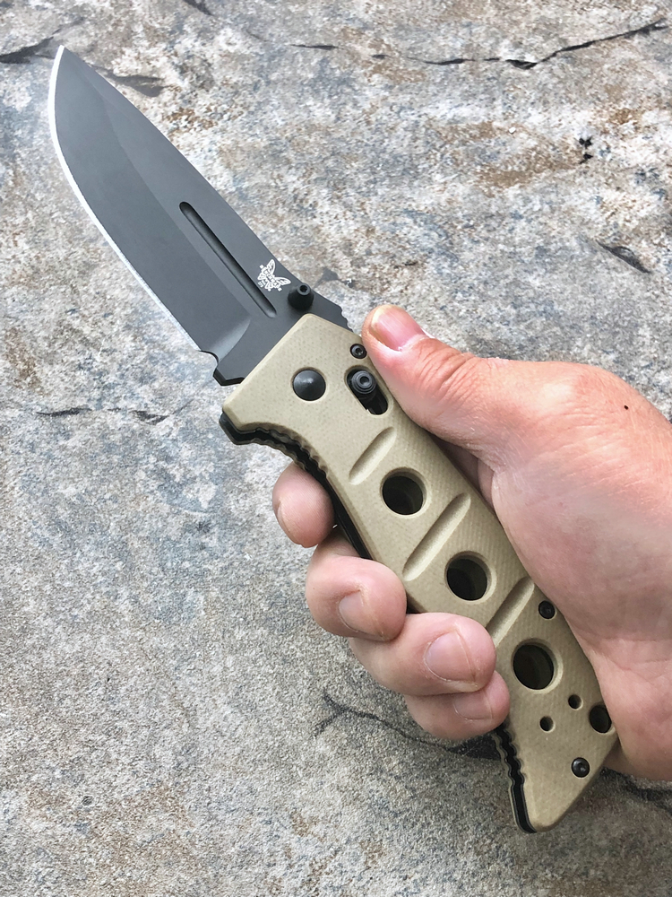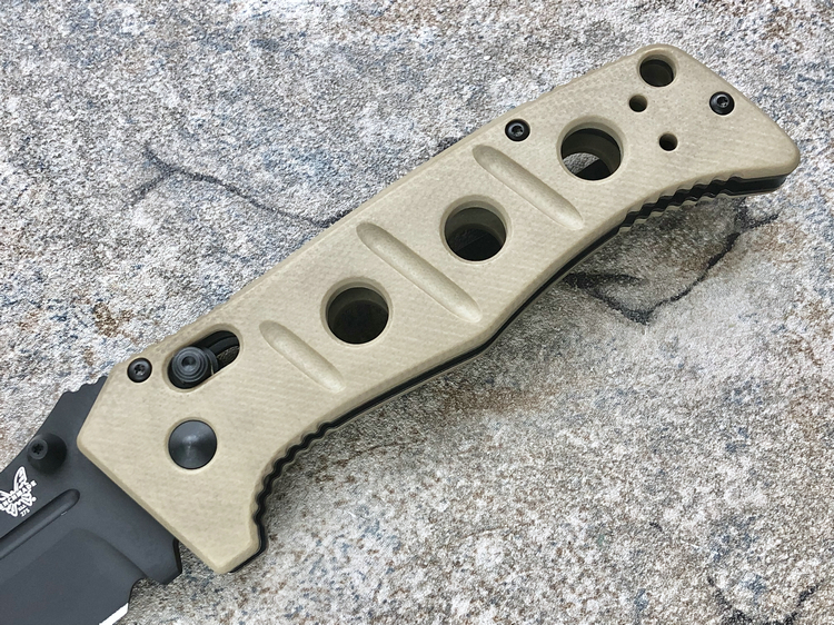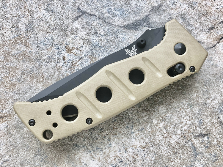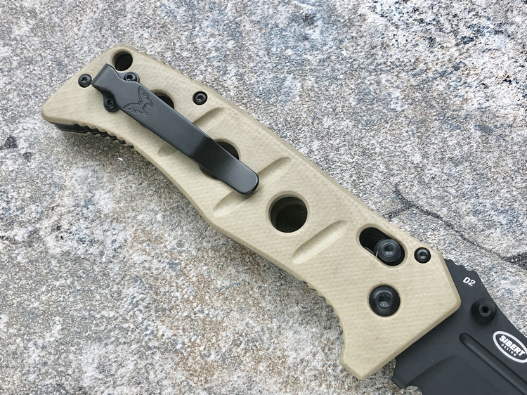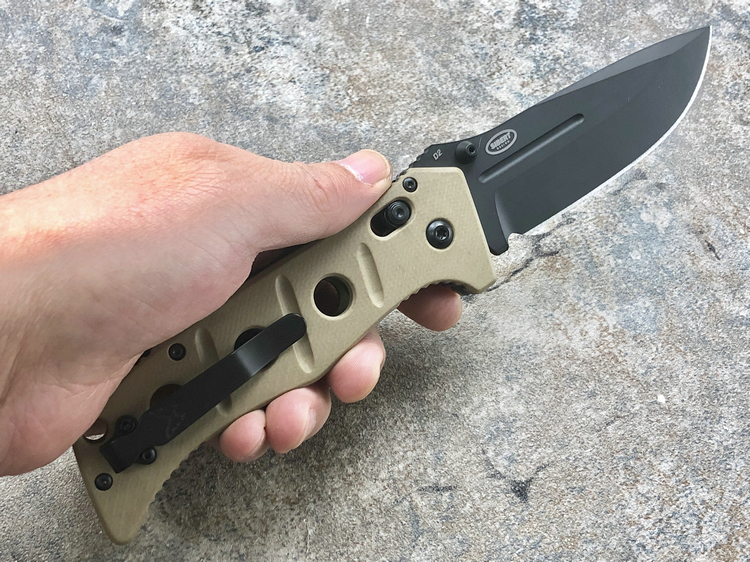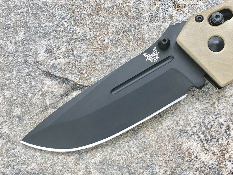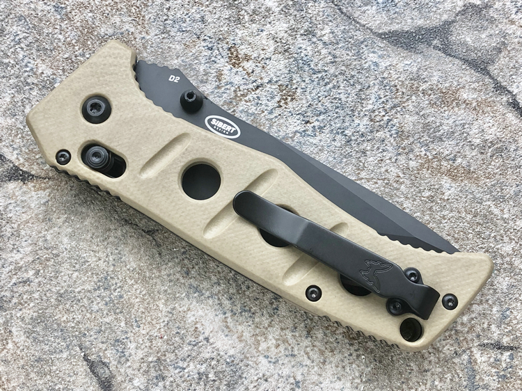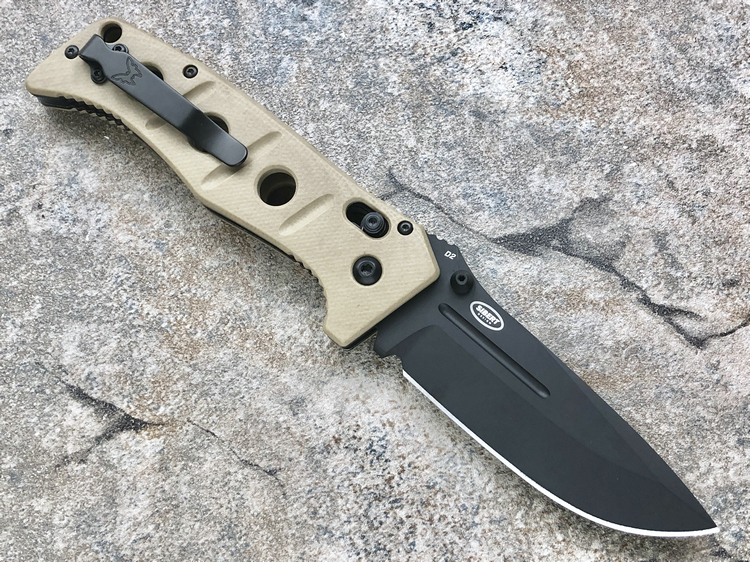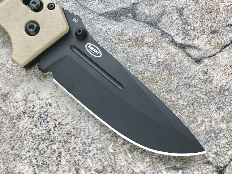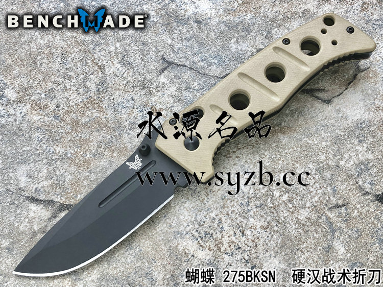 类 型: 折刀全 长: 227mm刃 长: 88mm刃 材: D2硬 度: 62HRC刃 厚: 4mm刃 宽:31mm重 量:220g 含套253g产 地: 美国蝴蝶的275 Adamas系列作品是由定制刀匠Shane Sibert与美国军方代表Major Jeff Strueker所共同合作的战术作品。Major Strueker在1987-2011年期间服役于美国陆军,其大多数时间隶属于第75游骑兵团(The 75th Ranger Regiment),此外他还是蝴蝶刀具的忠实粉丝。Adamas系列作品尺寸和分量感十足,适合把握且破坏力十足,完全符合战术需求。 这把275BKSN 是由D2工具钢锻造的水滴头折刃,在野外环境下能提供出色的切削能力和易打磨能力。D2钢的全刃刀身切削性能出色,钢材的强度和较大尺寸让刀具更加适合劈砍,为了更好的保障刃部的完整性,刃身的减压血槽可以有效的将刃部受力进行分散。刃身表面使用黑色涂层处理,更加防锈也更符合战术使用。 刀柄拥有黑色涂层的不锈钢内衬,有效的保障的柄部强度,外部使用黑色G-10材质贴附以提供出色的手感。刀柄部分使用镂空切割技术刻有减重/排汗孔,既能有效减轻刀具重量也能在长时间握持后也不易出现手部出汗的情况。刀柄尺寸非常适合手握,在戴手套情况下也能舒适握持。刀具使用刀根出的双头拇指螺柱推开,柄使用蝴蝶著名的轴索机制收刀。刀具还配备一个可换边安装的黑色刀夹和拥有携行装置的黑色重型尼龙刃鞘。