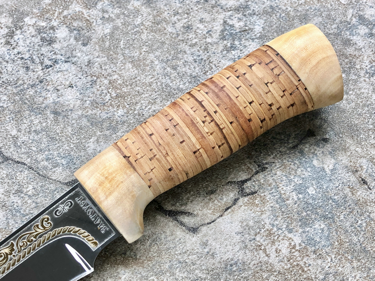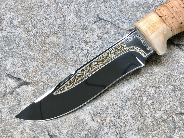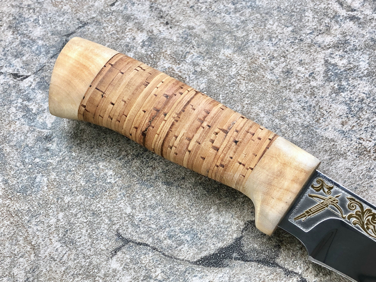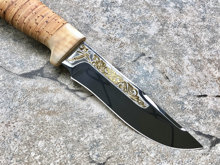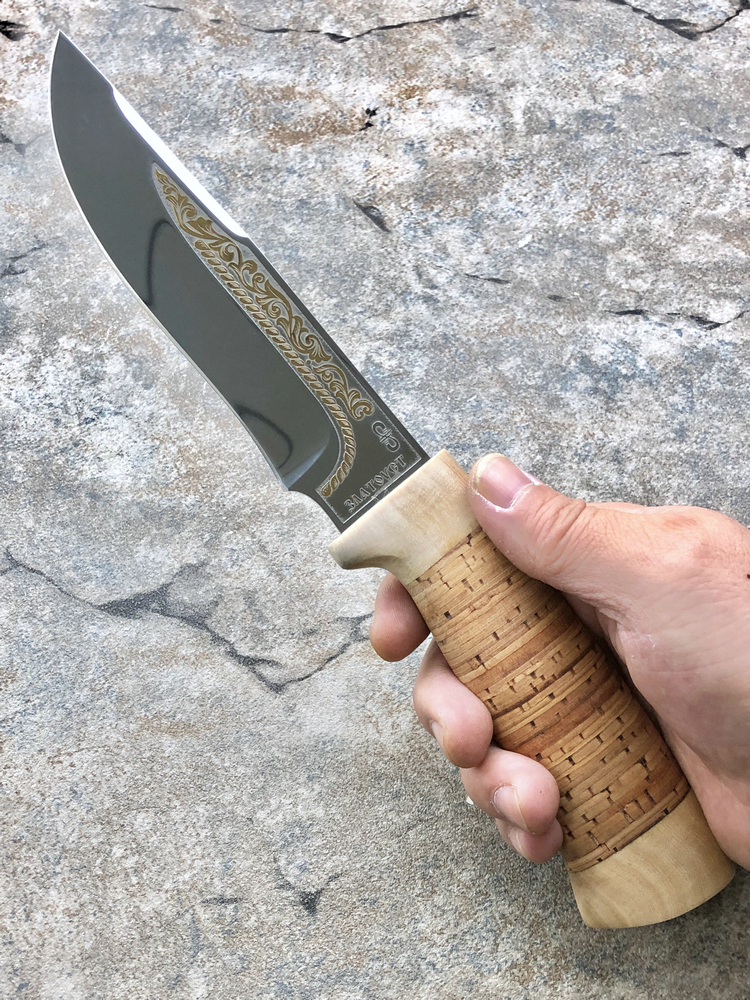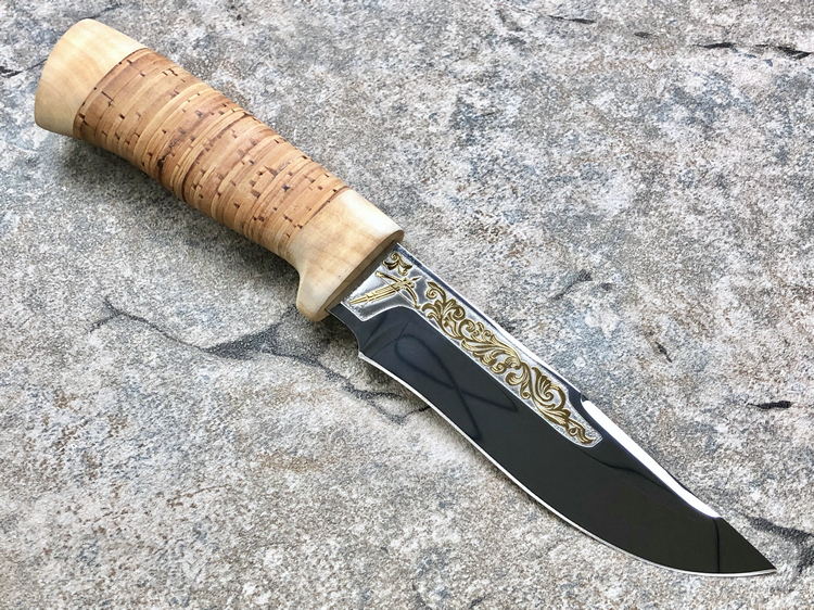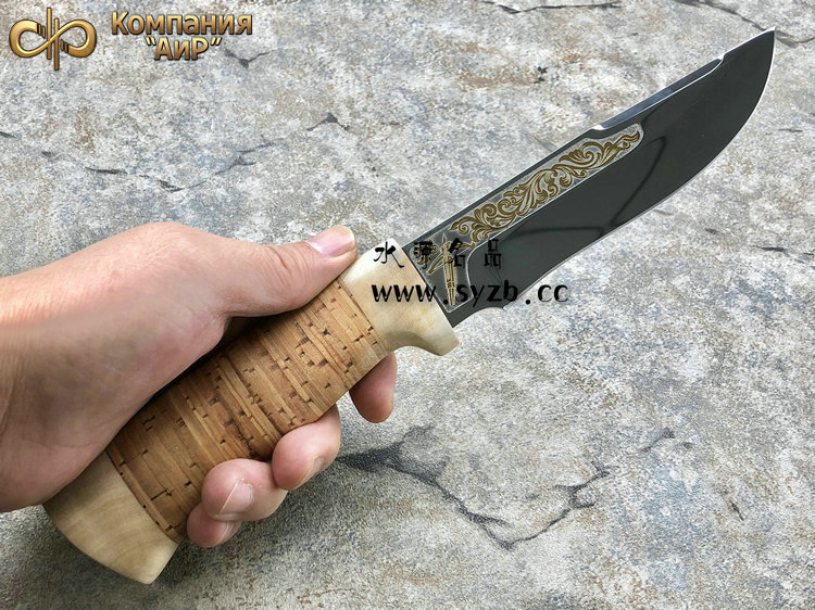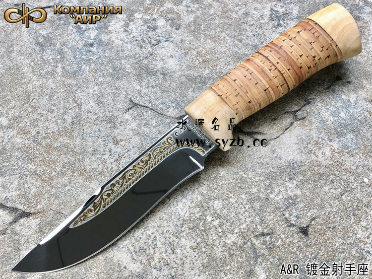 类 型: 直刀全长:265mm刃长:141mm刃厚:2.5mm刃材:40X10C2M硬度:60HRC 贵金属涂层:金(999.9°) - 1微米柄材:桦树皮重量:131g产 地: 俄罗斯