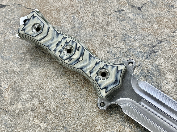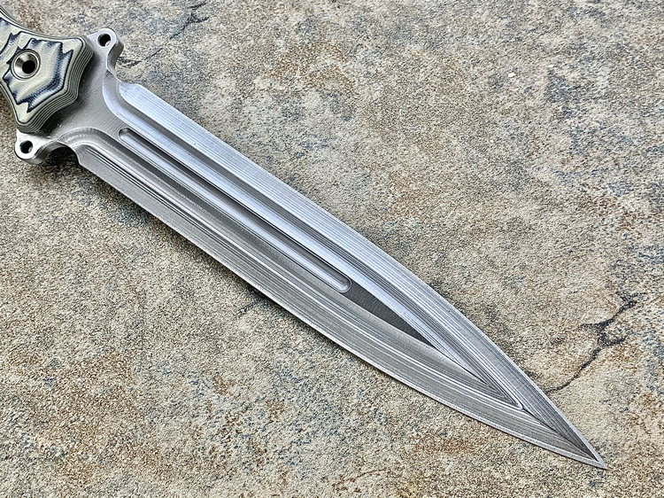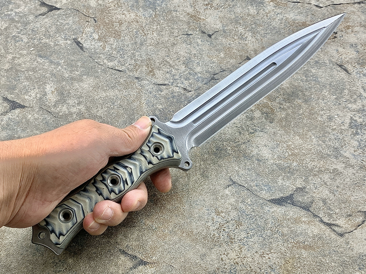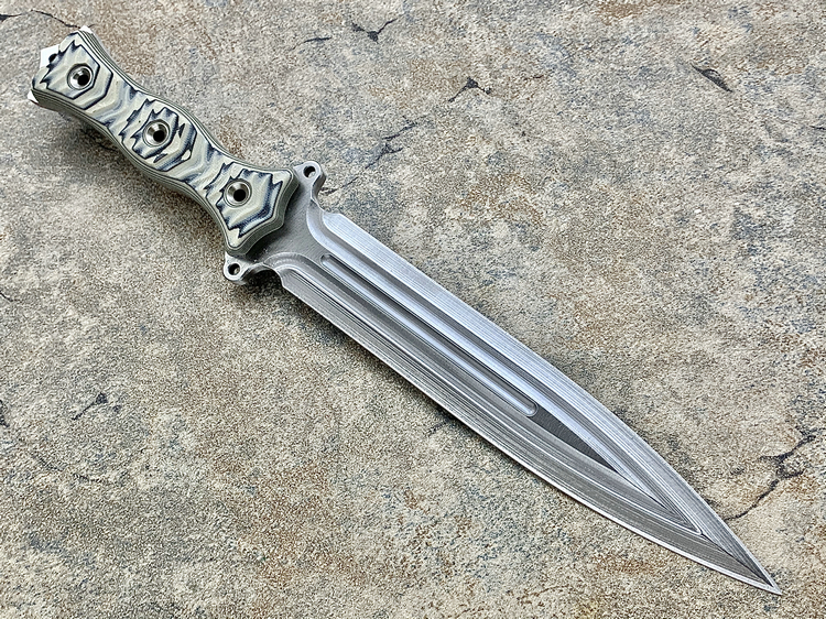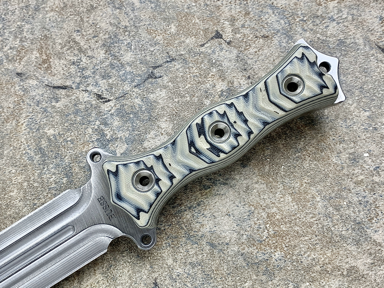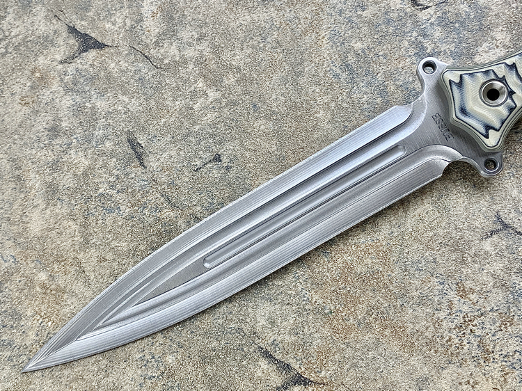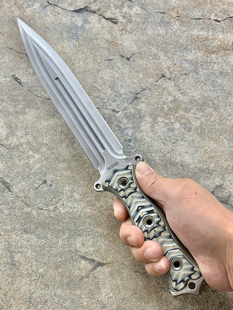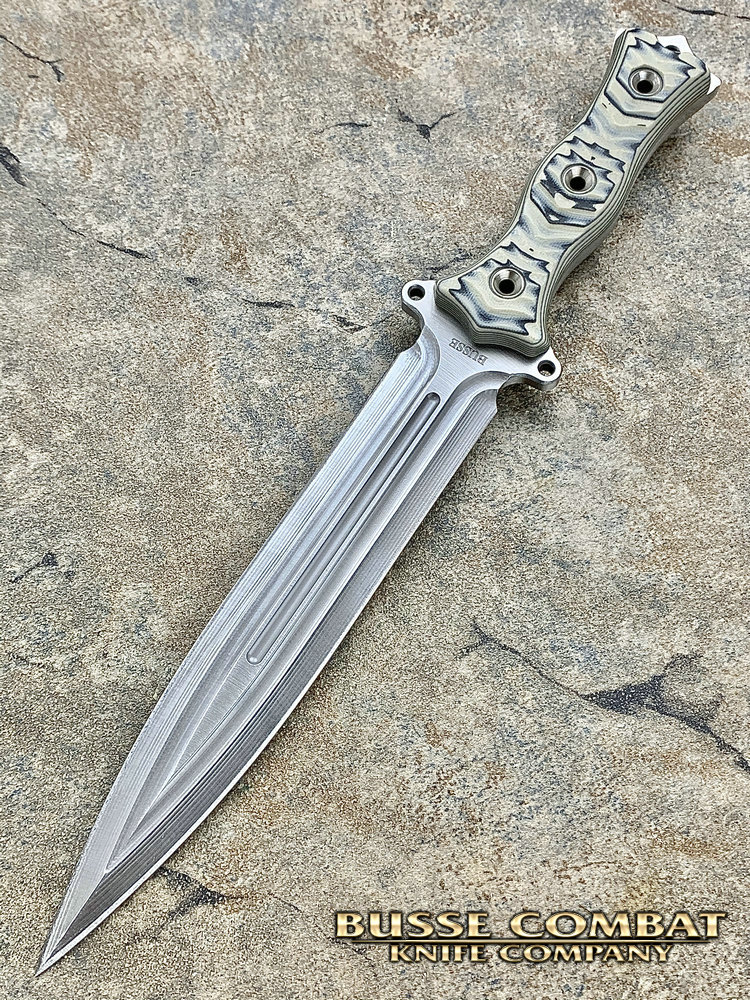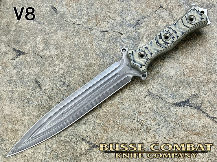 全长:338mm 刃长:195mm 刃厚:6.1mm 刃宽:34mm 刃材:INFI 硬度:61HRC 原产地:美国 刀鞘:无(注:Busse原厂均无鞘) Busse 巴斯 定制版 V8 短剑匕首 INFI 刃材 V8是为严酷的重型战斗而设计。其特点是采用Busse的专利波纹斜角技术的8英寸刀身。到目前为止,这种设计是匕首世界里“最疯狂的设计”,线条流畅自如,即使静止不动,V8看起来也在运动。鞘