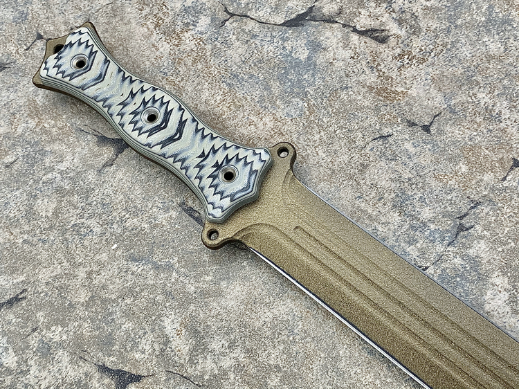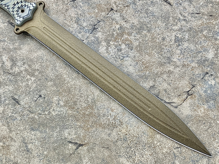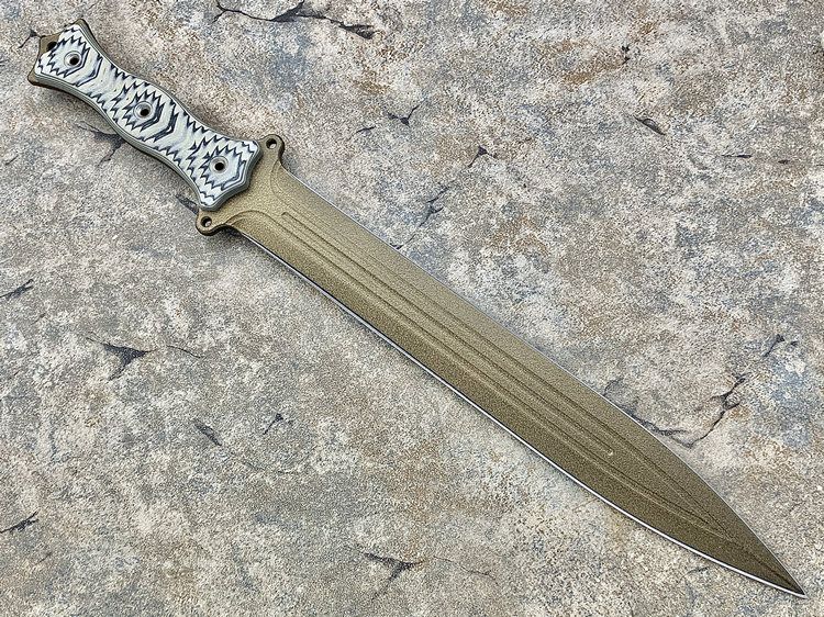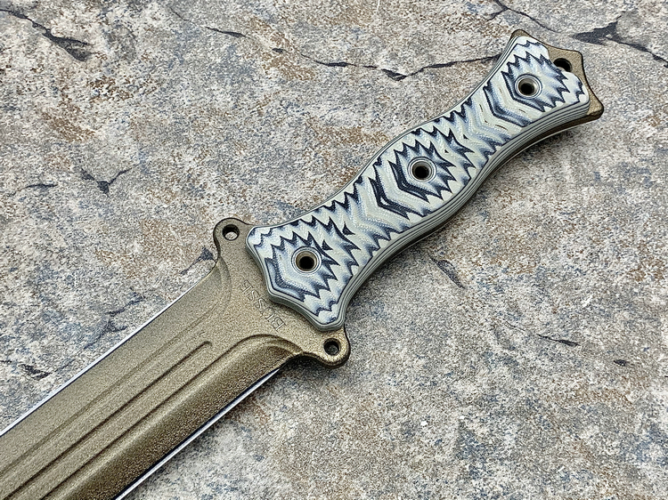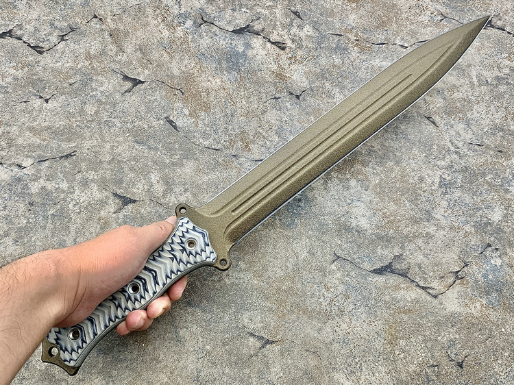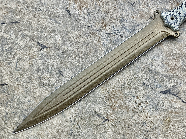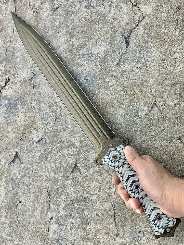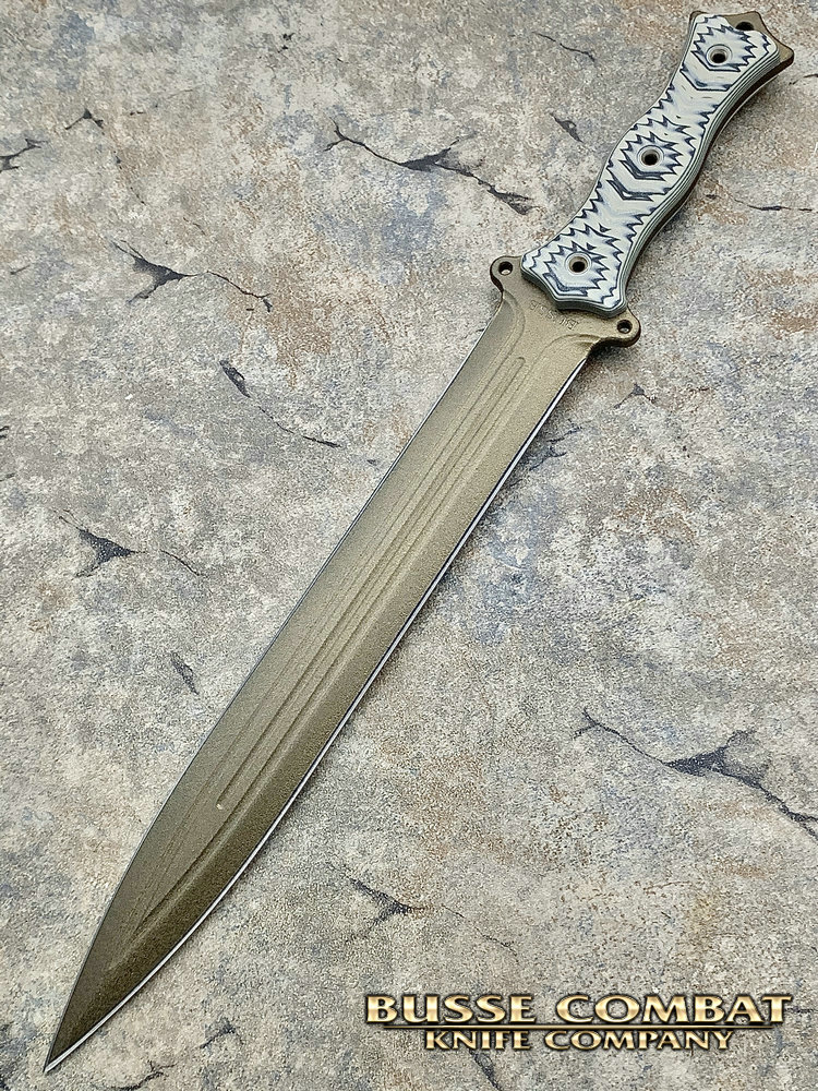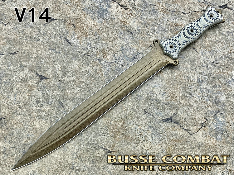 全长:525mm 刃长:359mm 刃宽:44mm刃厚:6.5mm 刃材:INFI 硬度:61HRC 柄长:166mm 重量:928g 原产地:美国 刀鞘:无(注:Busse原厂均无鞘) Busse 巴斯 定制版 V14 短剑匕首 INFI 刃材 V14是为严酷的重型战斗而设计。其特点是采用Busse的专利波纹斜角技术的14英寸刀身。到目前为止,这种设计是匕首世界里“最疯狂的设计”,线条流畅自如,即使静止不动,V14看起来也在运动。鞘