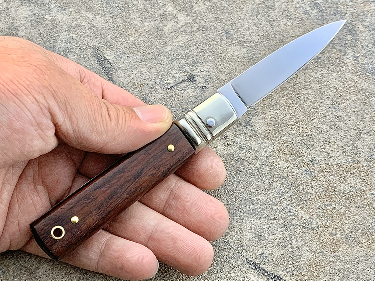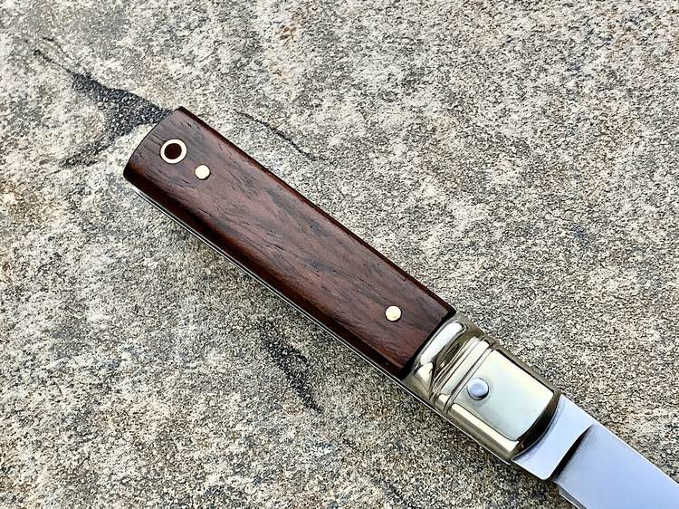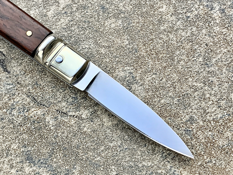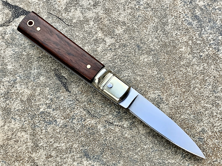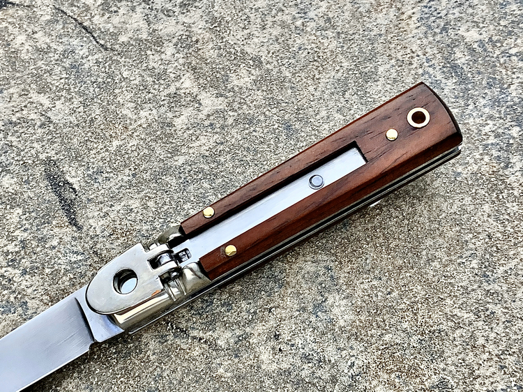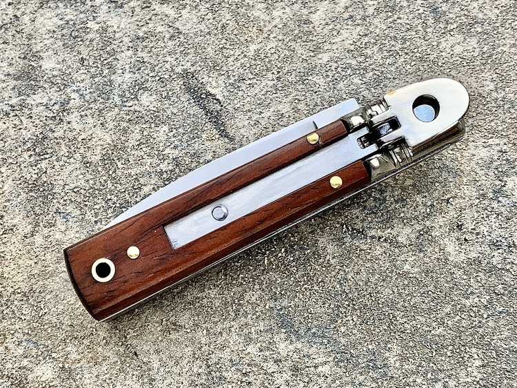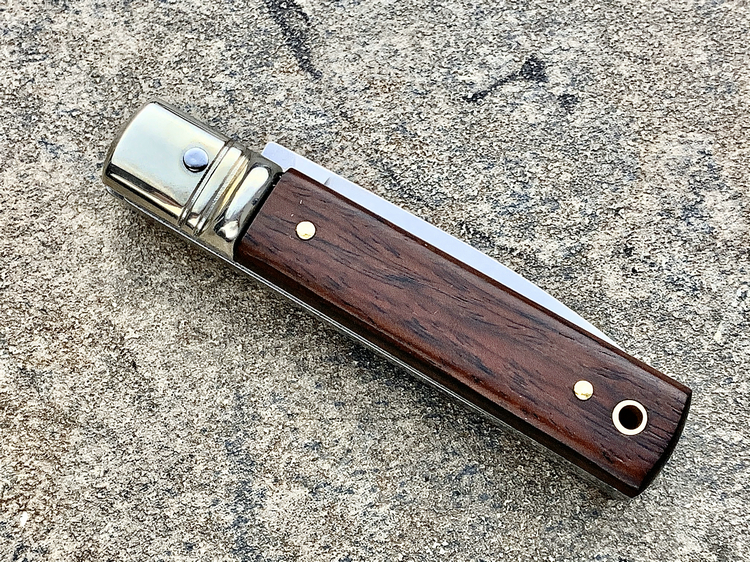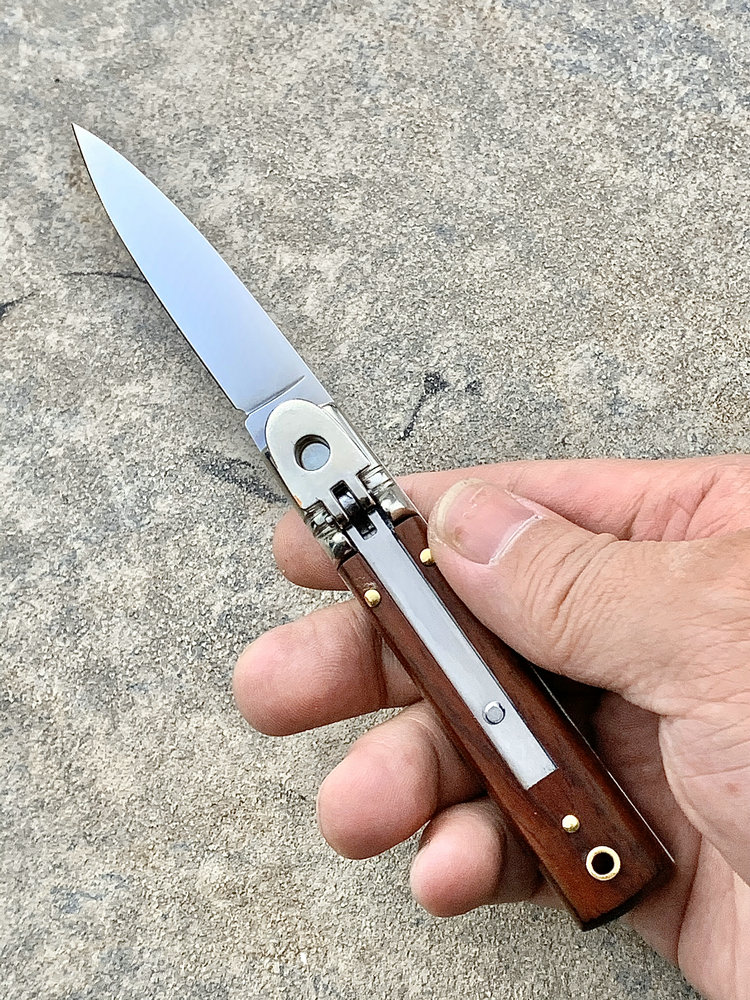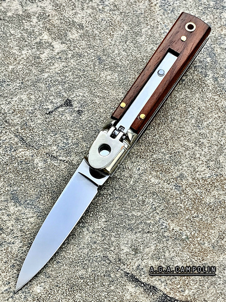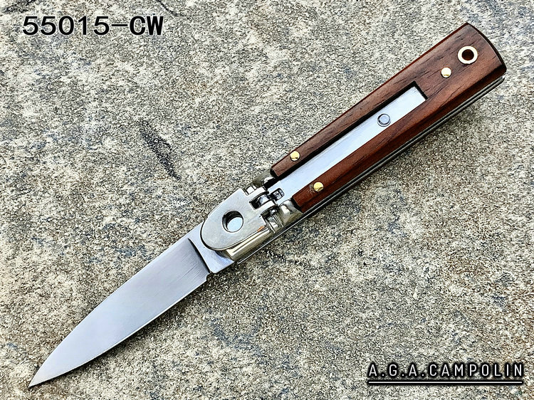 全长:152mm 刃长:62.5mm 刃厚:3mm 刃材:440A 硬度:58HRC 闭合:90mm 产地:意大利 重量:75g老安杰洛·坎波林(Angelo Campolin Sr. )1923年出生于意大利的马尼亚戈(Maniago)。二战前,他致力于完善他的制刀技术,并在这个时候制作了他的第一把刀片。战后,1947年,他创办了自己的公司,制作了30支标有“安杰洛·坎波林”的细高跟鞋(经典意大利侧跳)。虽然路程很远,他还是骑自行车去威尼斯卖。几年后,他开始与毛罗马里奥(Mauro Mario)建立合作关系,后者为许多美国进口商制造刀具,如Rosco、C.G.刀具、B.Svoboda、C.C.C刀具和其他美国市场刀具。而且,威尼斯和的里雅斯特的游客们也为这个“”讨厌“”的玩具而疯狂!安吉洛为38厘米和45厘米的大尺寸高跟鞋制作了工具。起初,这些是撬锁细高跟鞋,后来改为旋转垫片样式。在二战后的时代,坎波林是唯一一家生产这种尺寸的工厂。其他尺寸过去和现在都是由其他制造商生产的。20世纪60年代,他开始引入其他机制,包括锁回式。起初,这些都是用在切刀狩猎刀,然后也有一些细高跟鞋。它成为最流行的自动折叠猎刀。 20世纪70年代,安吉洛的儿子詹尼(Gianni ))开始在这家公司工作,他们专门为位于德国索林根的罗伯特·克拉斯公司(Robert Klaas company)折叠猎刀和手工折叠高跟鞋,上面有他们的吻鹤印记。这是猎鹰刀的开始,至今仍在营业。1999年,小安杰洛(Angelo Jr. ))21岁开始在公司工作。他第一次到美国去俄勒冈州参加刀展,展出了许多质量上乘的猎鹰折叠刀。他还喜欢快开刀,从这次展会和通过互联网与许多美国收藏家建立了关系和友谊。他开了自己的公司专门经营自动刀。有些是老安吉洛做的,有些是其他有独家协议的狂热工匠做的。这是他的公司AKC(Automatic Knives Creations, or Angelo Knives Campolin)的开始。 我们的目标是使用老刀工技术和传统提供高品质的自动刀。ANGELO CAMPOLIN JR.