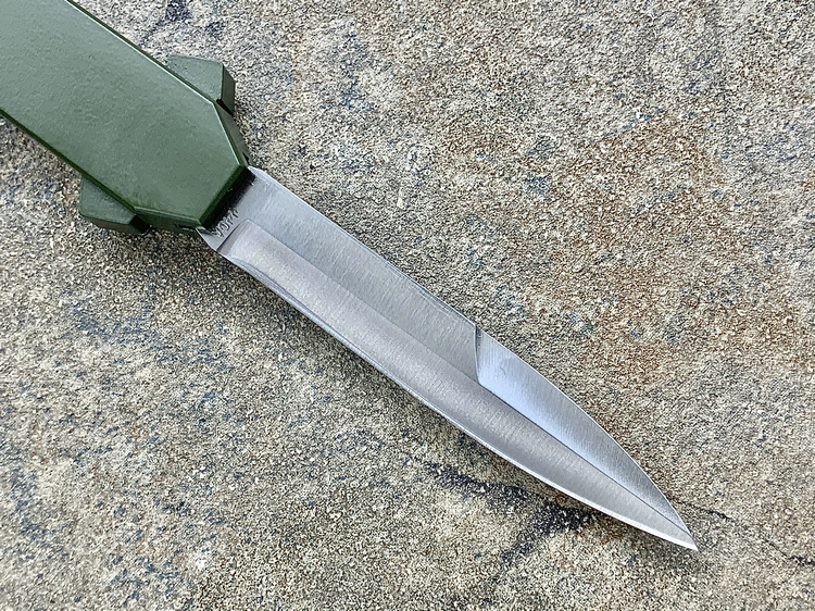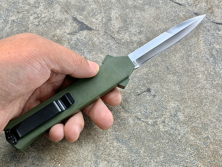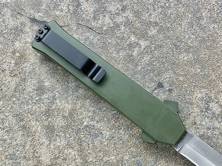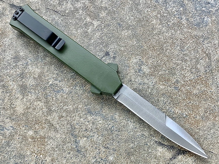 简单描述: 意大利AKC F-16 绿色铝合金柄 嵌磨贴片 钢本色刺刀型 单锋直跳
