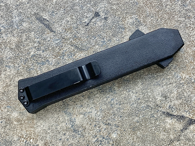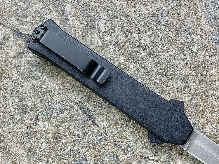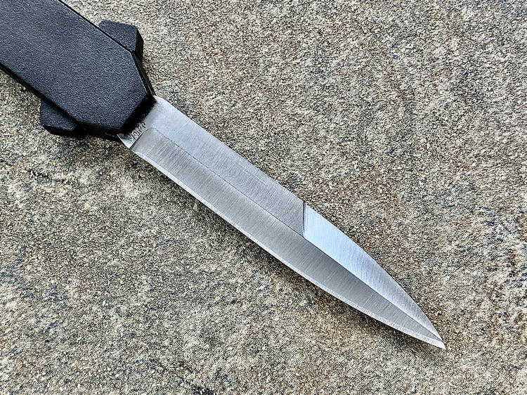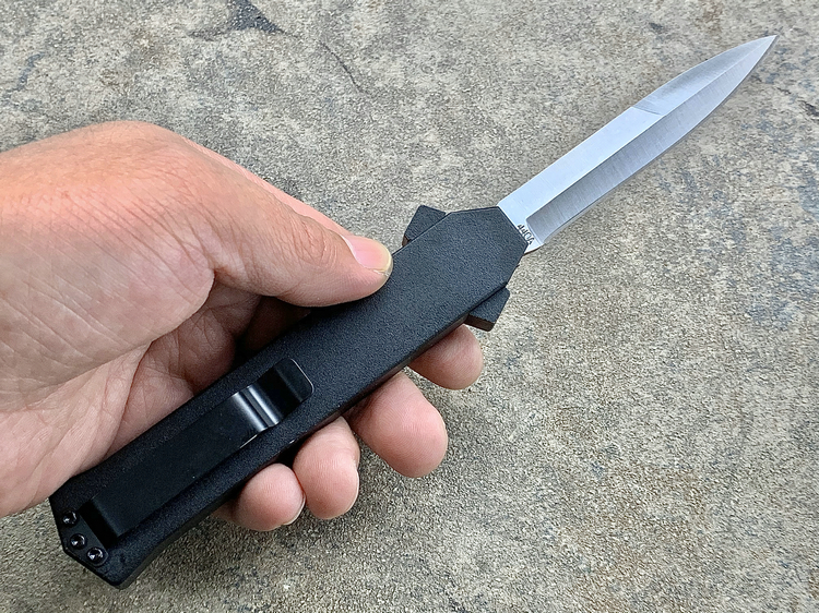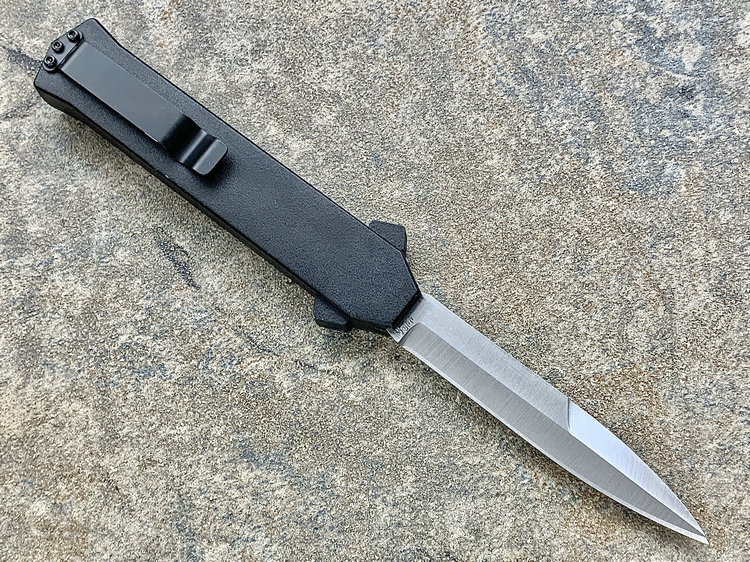 简单描述: 意大利AKC F-16 黑色铝合金柄 嵌磨贴片 钢本色刺刀型 单锋直跳