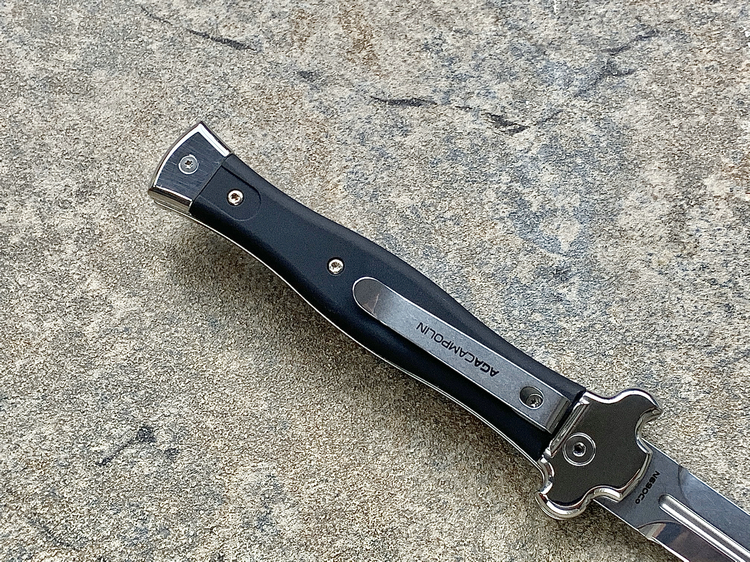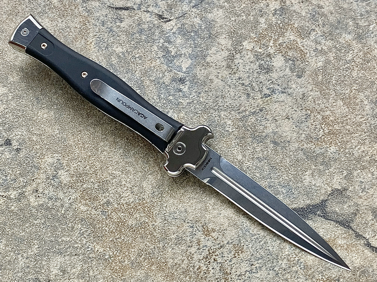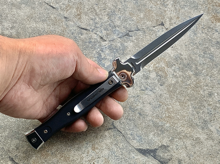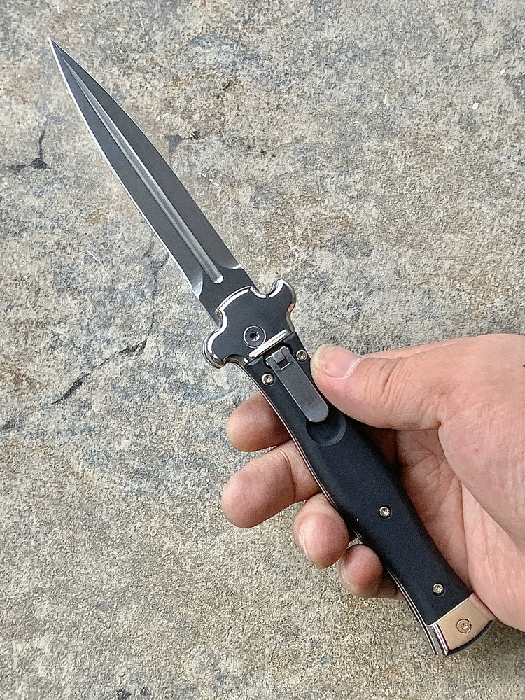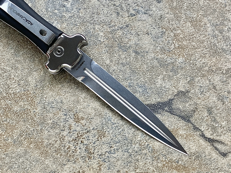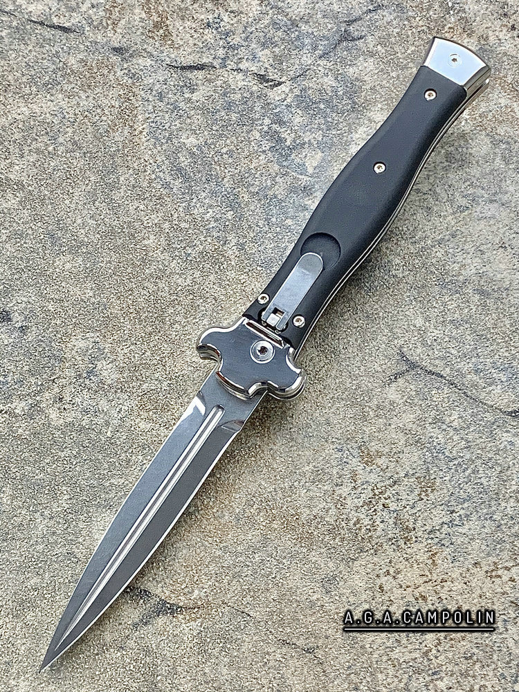 全长:219mm 刃长:93mm 刃厚:2.8mm 刃宽:16.5mm 刃材:N690Co 硬度:60HRC 闭合:125.5mm 产地:意大利 重量:171g 老安杰洛·坎波林(Angelo Campolin Sr. )1923年出生于意大利的马尼亚戈(Maniago)。二战前,他致力于完善他的制刀技术,并在这个时候制作了他的第一把刀片。战后,1947年,他创办了自己的公司,制作了30支标有“安杰洛·坎波林”的细高跟鞋(经典意大利侧跳)。虽然路程很远,他还是骑自行车去威尼斯卖。几年后,他开始与毛罗马里奥(Mauro Mario)建立合作关系,后者为许多美国进口商制造刀具,如Rosco、C.G.刀具、B.Svoboda、C.C.C刀具和其他美国市场刀具。而且,威尼斯和的里雅斯特的游客们也为这个“”讨厌“”的玩具而疯狂!安吉洛为38厘米和45厘米的大尺寸高跟鞋制作了工具。起初,这些是撬锁细高跟鞋,后来改为旋转垫片样式。在二战后的时代,坎波林是唯一一家生产这种尺寸的工厂。其他尺寸过去和现在都是由其他制造商生产的。20世纪60年代,他开始引入其他机制,包括锁回式。起初,这些都是用在切刀狩猎刀,然后也有一些细高跟鞋。它成为最流行的自动折叠猎刀。 20世纪70年代,安吉洛的儿子詹尼(Gianni ))开始在这家公司工作,他们专门为位于德国索林根的罗伯特·克拉斯公司(Robert Klaas company)折叠猎刀和手工折叠高跟鞋,上面有他们的吻鹤印记。这是猎鹰刀的开始,至今仍在营业。1999年,小安杰洛(Angelo Jr. ))21岁开始在公司工作。他第一次到美国去俄勒冈州参加刀展,展出了许多质量上乘的猎鹰折叠刀。他还喜欢快开刀,从这次展会和通过互联网与许多美国收藏家建立了关系和友谊。他开了自己的公司专门经营自动刀。有些是老安吉洛做的,有些是其他有独家协议的狂热工匠做的。这是他的公司AKC(Automatic Knives Creations, or Angelo Knives Campolin)的开始。 我们的目标是使用老刀工技术和传统提供高品质的自动刀。ANGELO CAMPOLIN JR.