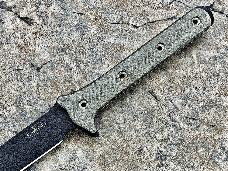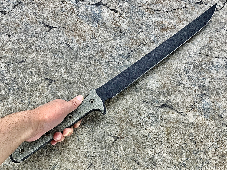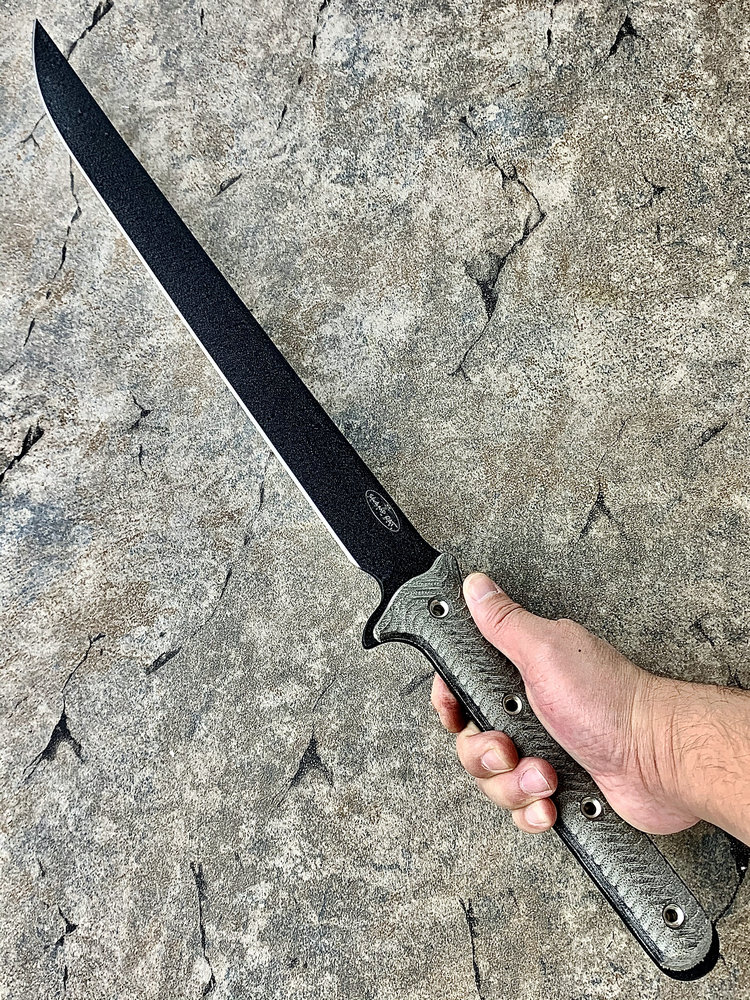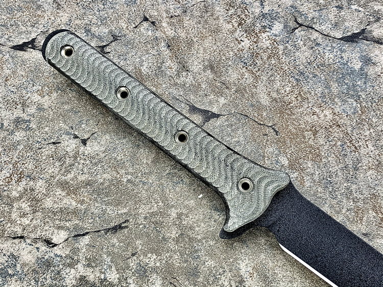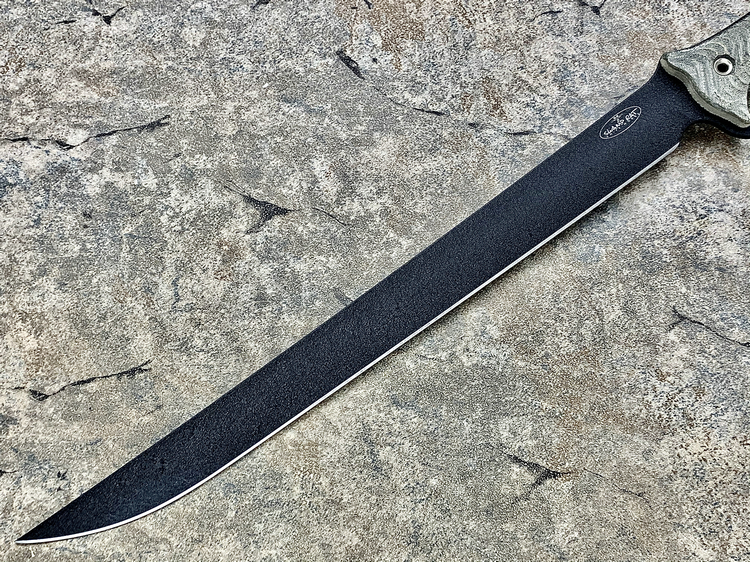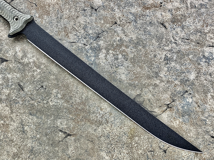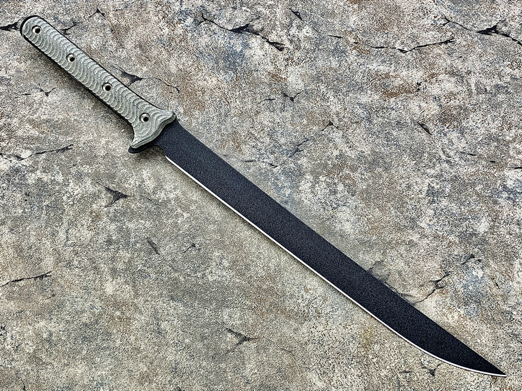全长: 598mm 刃长: 376mm 刃材: SR101 硬度: 58-60HRC 表面:黑色涂层 刃厚: 5mm 刃宽: 35mm 柄材: 米卡塔 重量:776g 刀鞘:无 (Busse原厂均无鞘) 产地:美国