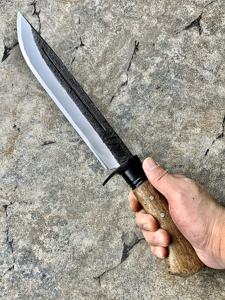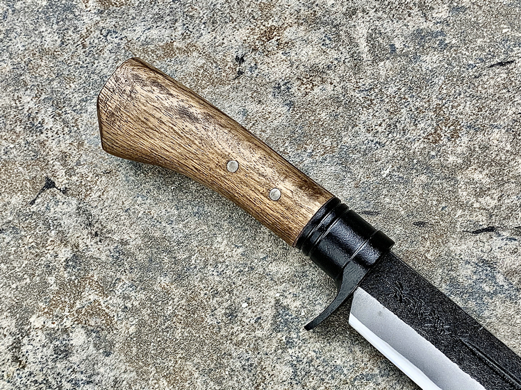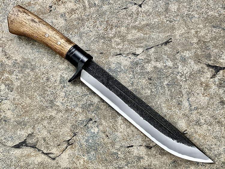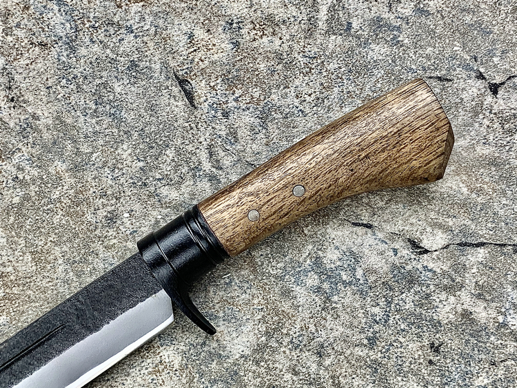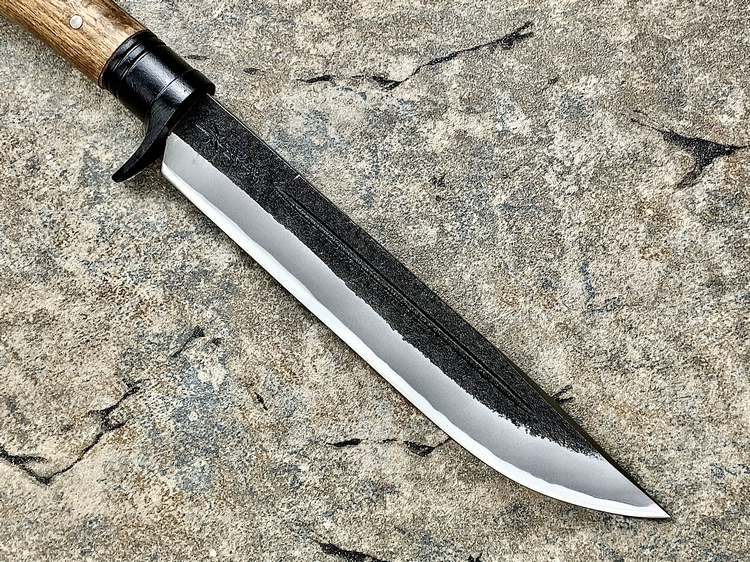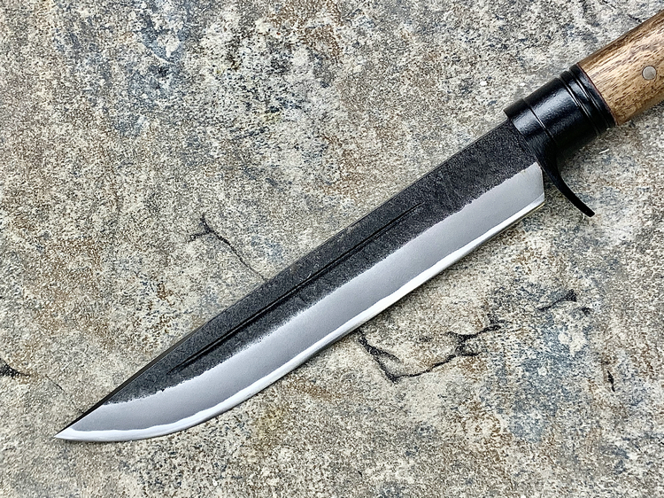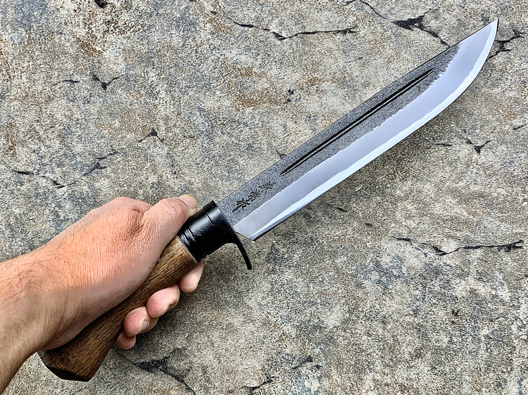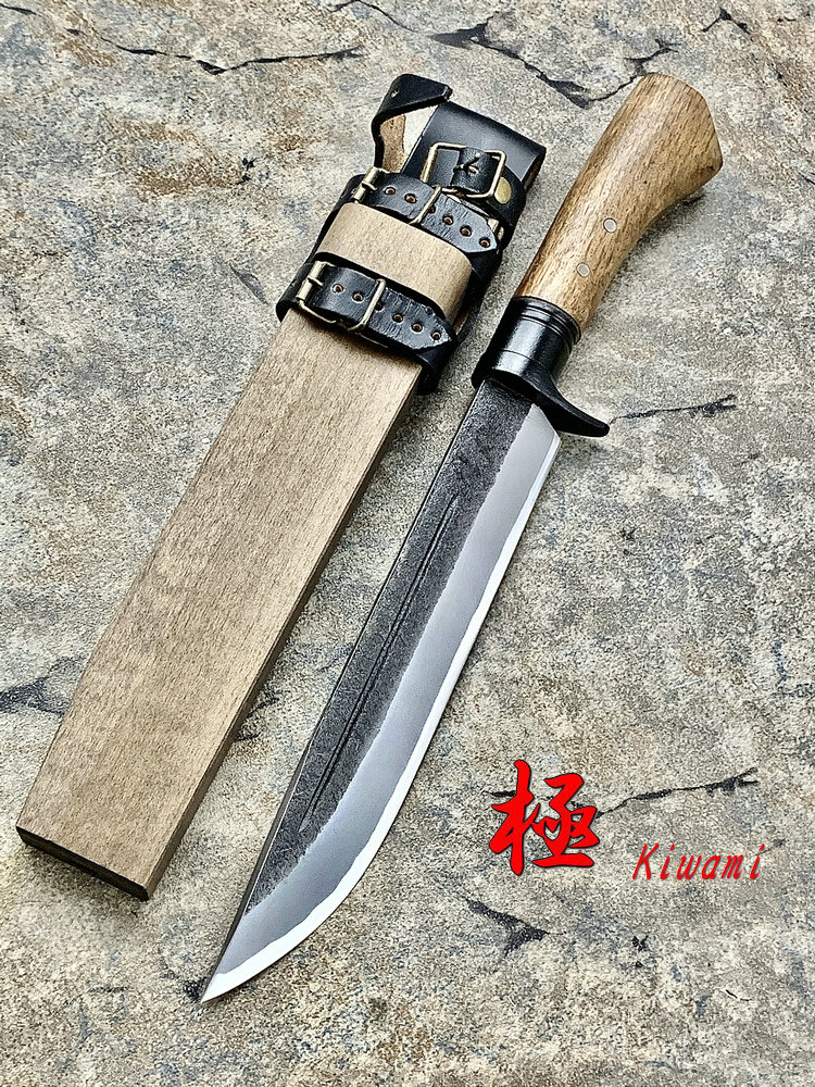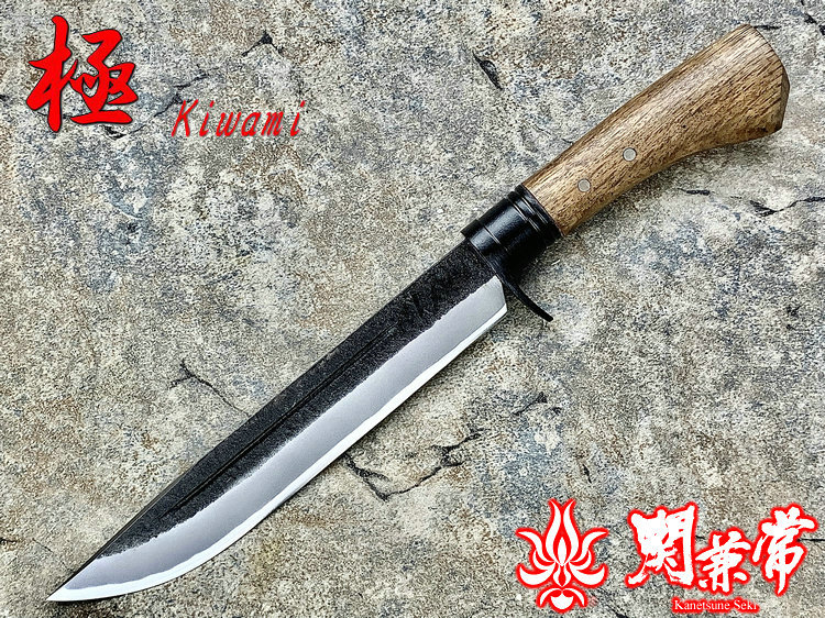 全长:350mm 刃长:216mm 刃厚:6.5mm 刃宽:34mm 刃材:Super Blue Steel 超级青纸钢 硬度:62-63HRC 重量:434g 原产地:日本日本岐阜县关市自谦仓时期以来就以制刃闻名于世,日名刃匠关兼常即传承此一传统制刃技术及风格,复以自身苦习,融合传统现代之技术,制作了闻名世界之刃款,凡用刃或搜刃之人莫不以拥有关兼长之刃为傲,凡是刃上有“关兼常作”就是品质与实用的保证。过去数百年来,日本猎人在艰困环境中狩猎以维持生活,靠的就是制作精良的刃具。时至今日,狩猎刃的制作融入许多现代技术,品质更加优异,而这也是关兼常作品的最擅长处。以日本法打造的猎刃,采铁与钢相结合,拥有三样特征:(一)拥有良好切割性,及平衡手感;(二)钢材部分硬而薄,包夹在铁里的钢,会顺着磨刃的角度,依序往上露出,永保刃口锋利;(三)经水淬火刃口形成波浪纹路,甚至起微妙的晶化而泛蓝光,浑然天成的美感实欧美刃具无法比拟。