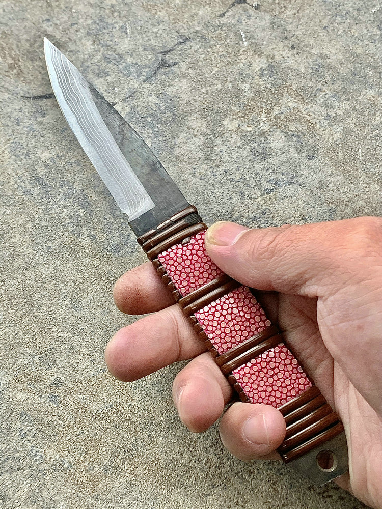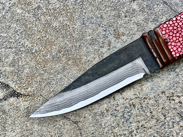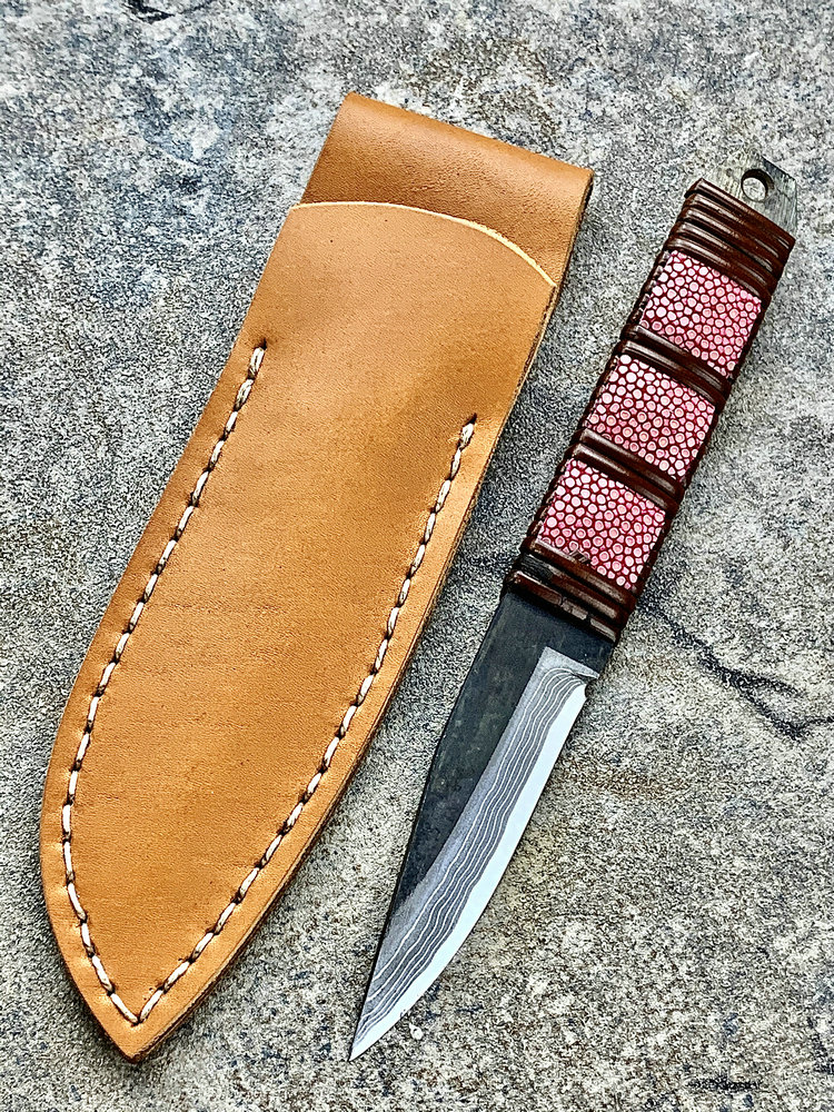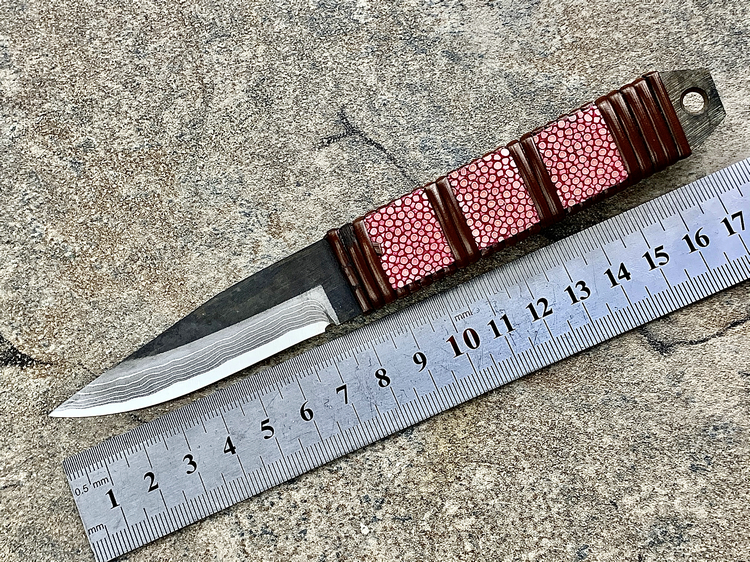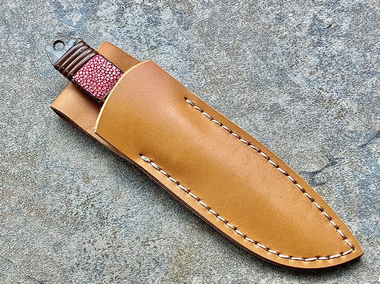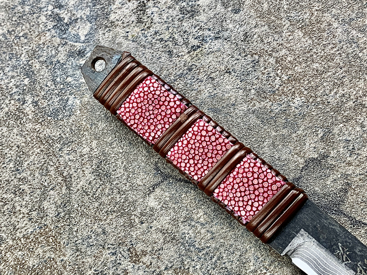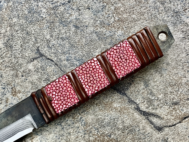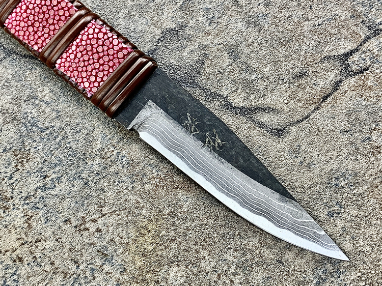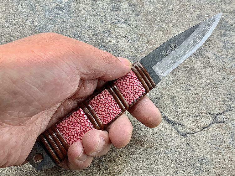 简单描述: Takeshi Saji 佐治武士 378-PK一心 白纸多层钢 缠藤 粉色鱼皮柄小猎刀
