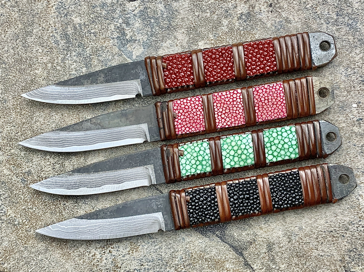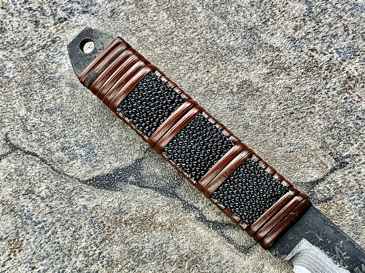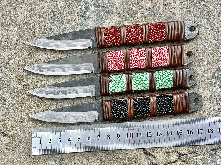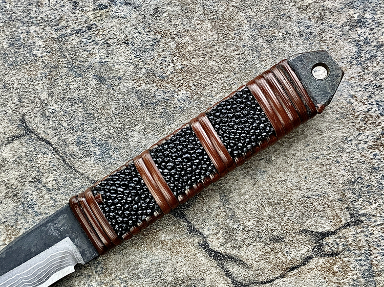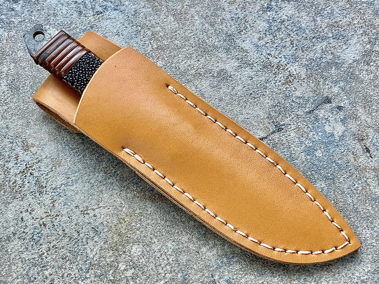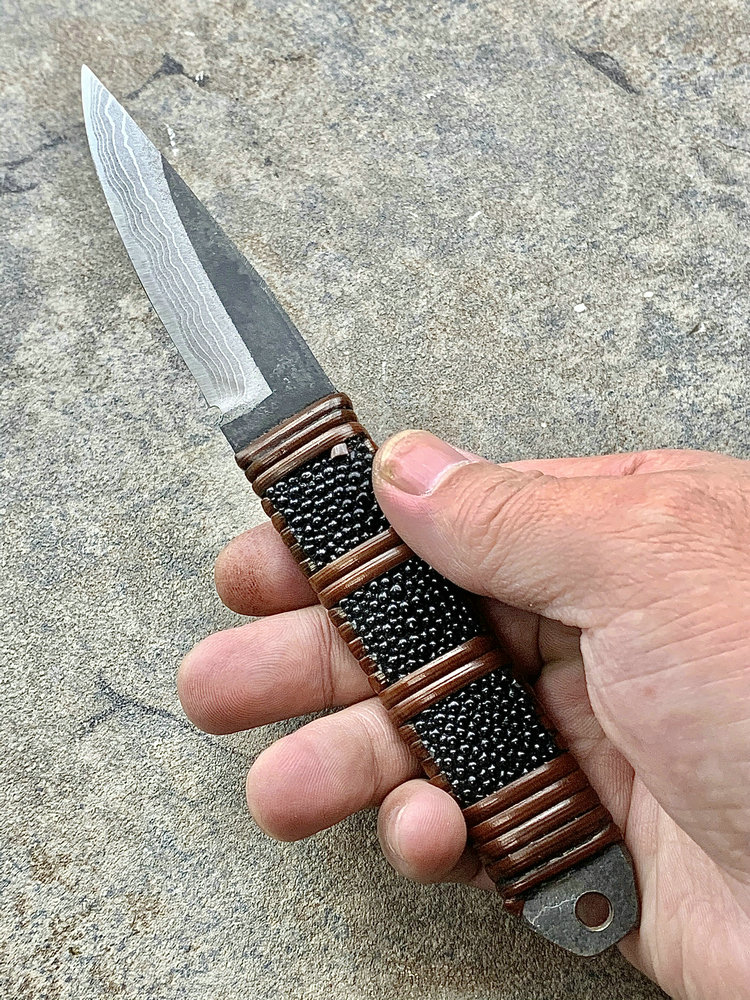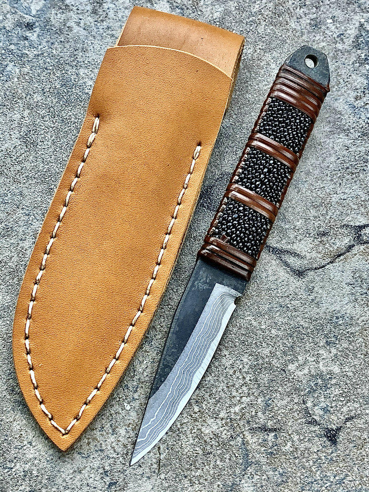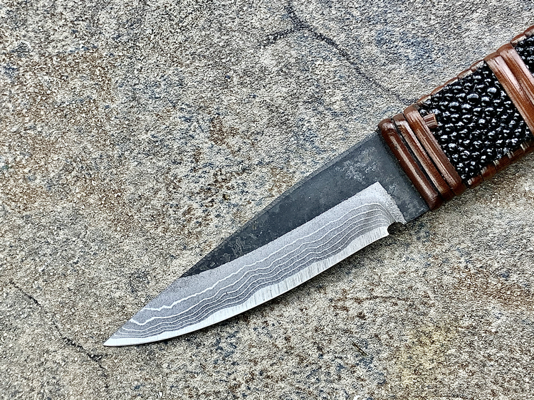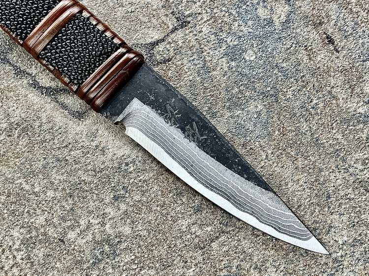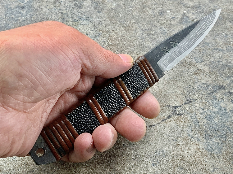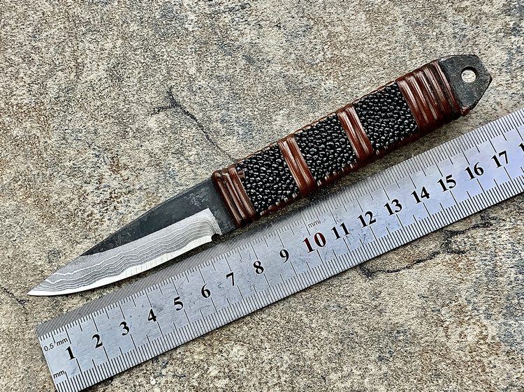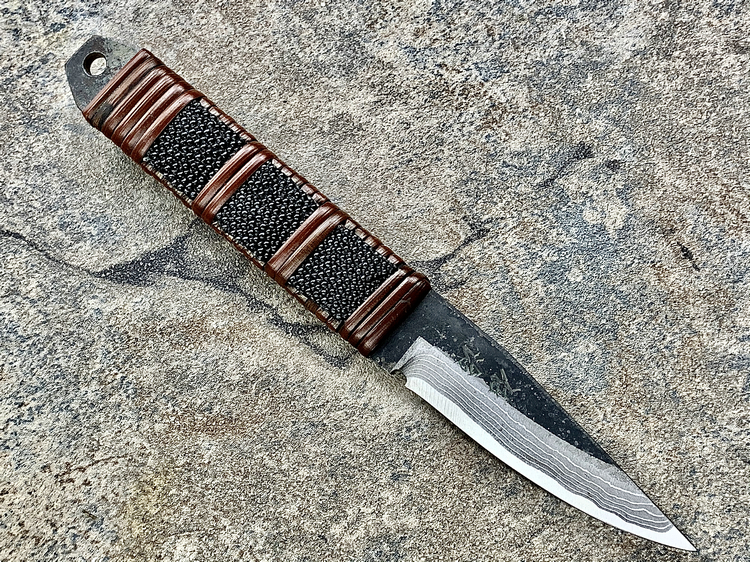 全长:177mm 刃长:70mm 刃厚:3.8mm 刃材:白纸多层钢(大马士革) 硬度:60HRC 柄材:鱼皮缠藤 重量:83g 产地:日本 佐治武士,日本越前武生人士(现福井县),这个地方在幕府时代就是兵器的生产区,今日以佐治武士工坊为代表. 1994年获得日本国家传统工艺师大奖(当时全日本只有2个人获此殊荣) 刀具制造方法坚守越前派传统锻造,第三代传人,从事锻炼具三十年经验,传统刀具制作的典范,也会制造美式刀具,因此融合东、西方两大不同制造方法于一体,各取所长,创造出佐治武士无人能及的独特风格,知名度誉满全球,他的作品特色是突出优越的切割性能以及坚固耐用的特性,获颁国家授予的“传统工艺师”头衔。 他的作品除了重视科学性与功能性外,造型上与名称上也颇具个人强烈色彩。如武藏、海贼、鬼武者、三日月、山贼等都兼备野外求生,狩猎与格斗的特殊性能。