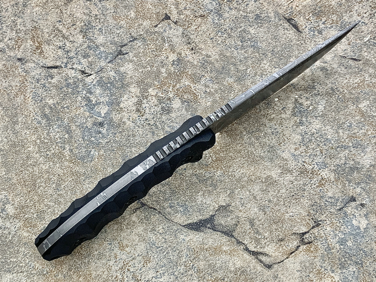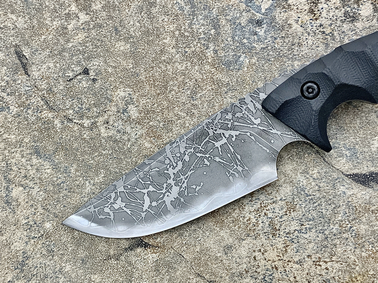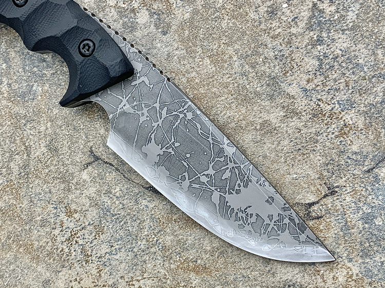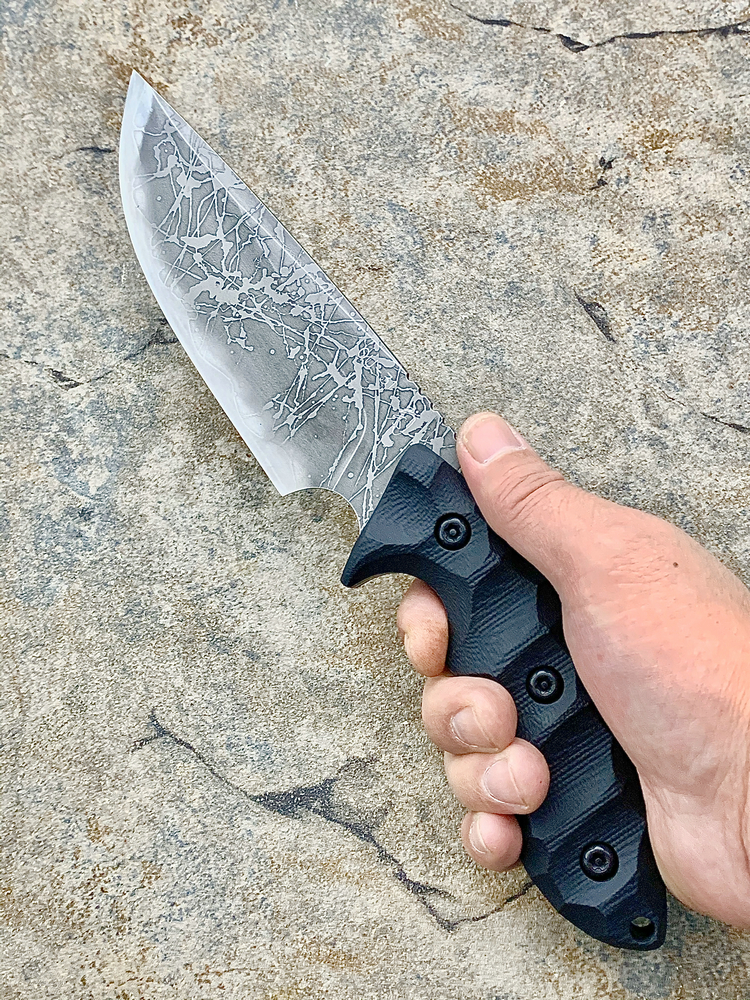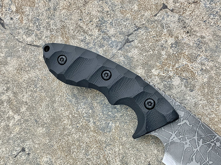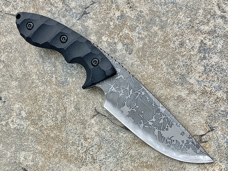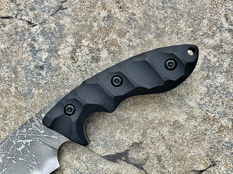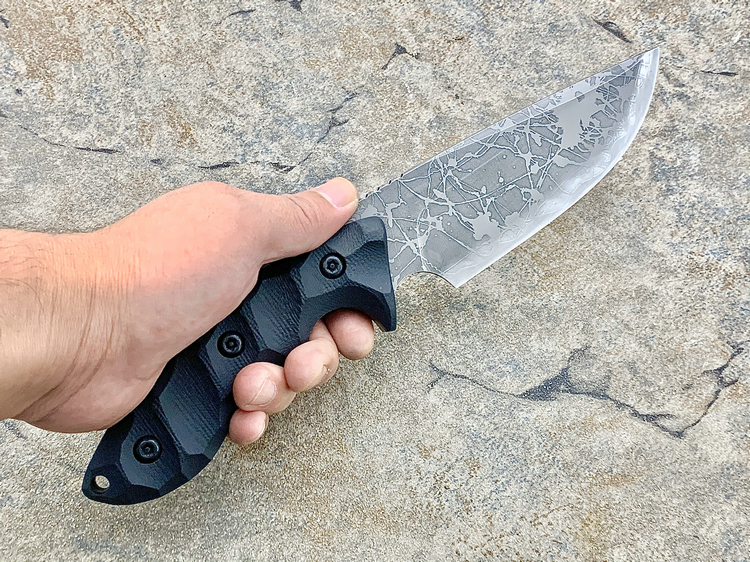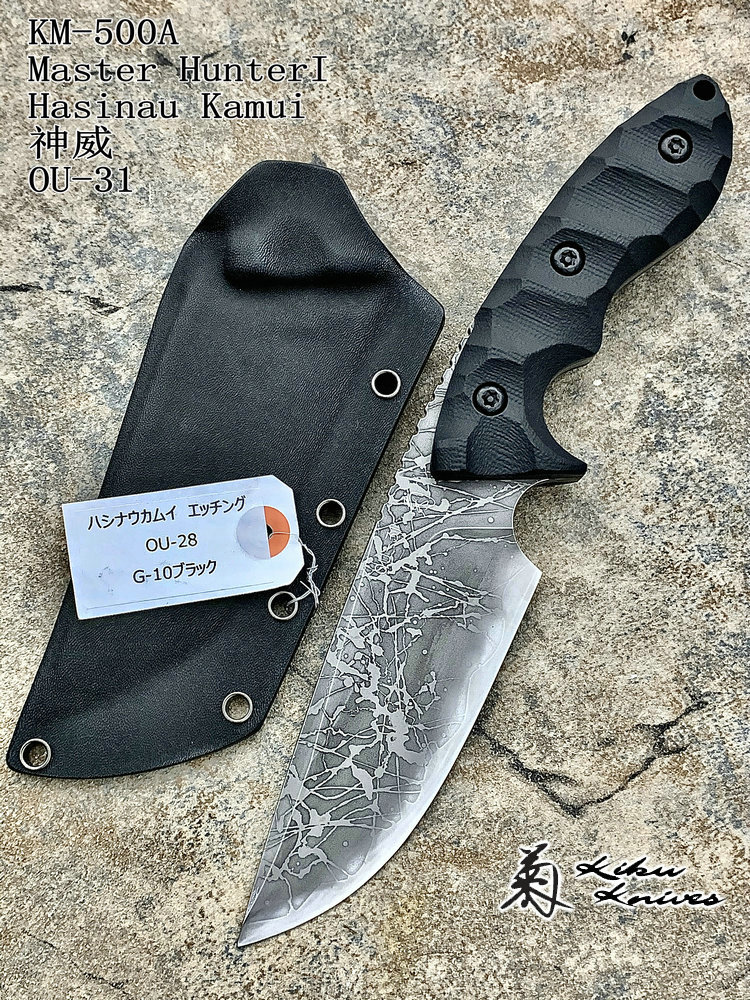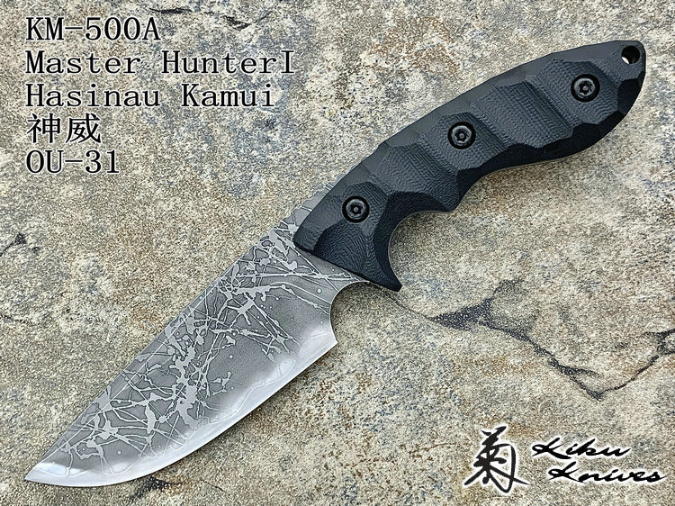 全长:263mm 刃长:120mm 刃厚:5.5mm 刃宽:45.5mm 刃材:OU-31 硬度:62HRC 柄材:G-10 重量:395g 原产地:日本 神威(Master Hunter I Hasinau Kamui),是由位于北海道的日本知名猎人Chujyo先生设计的一把出色的猎刀,263mm长,45.5mm宽的蛤刃刀身的背侧拥有一条假刃,靠近刀柄处的刀背上拥有拇指凹槽,这把刀拥有极佳的实用性,是一把出色的剥皮刀。手波状的黑色G-10手柄为使用者提供了一种安全和舒适的感觉。