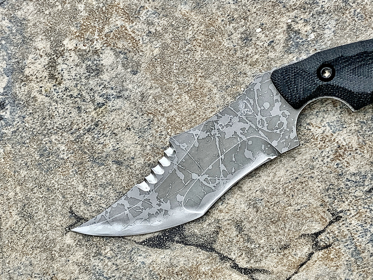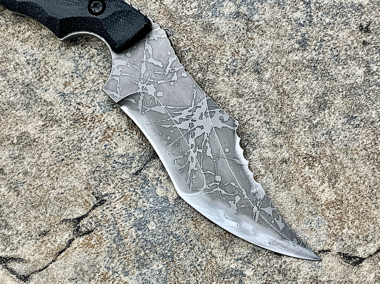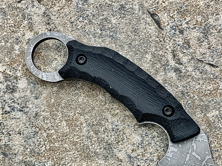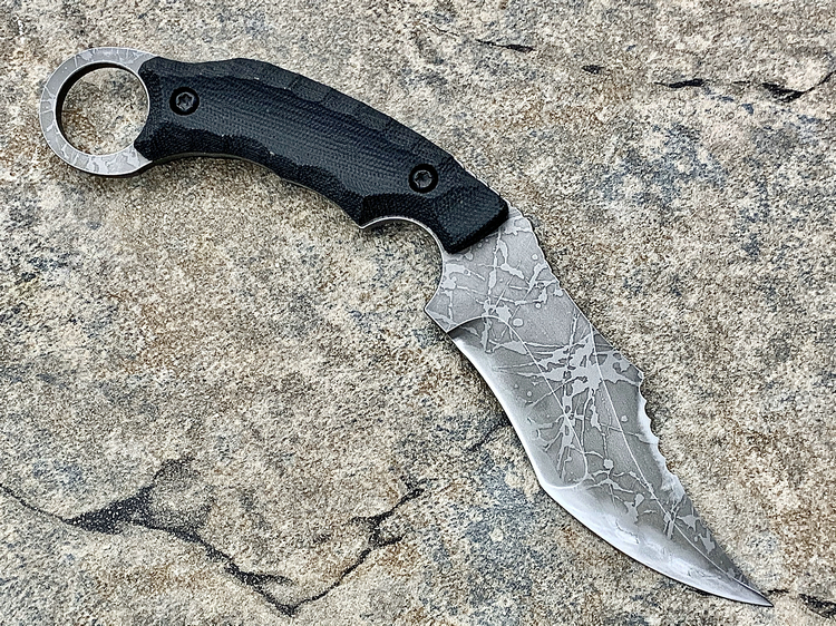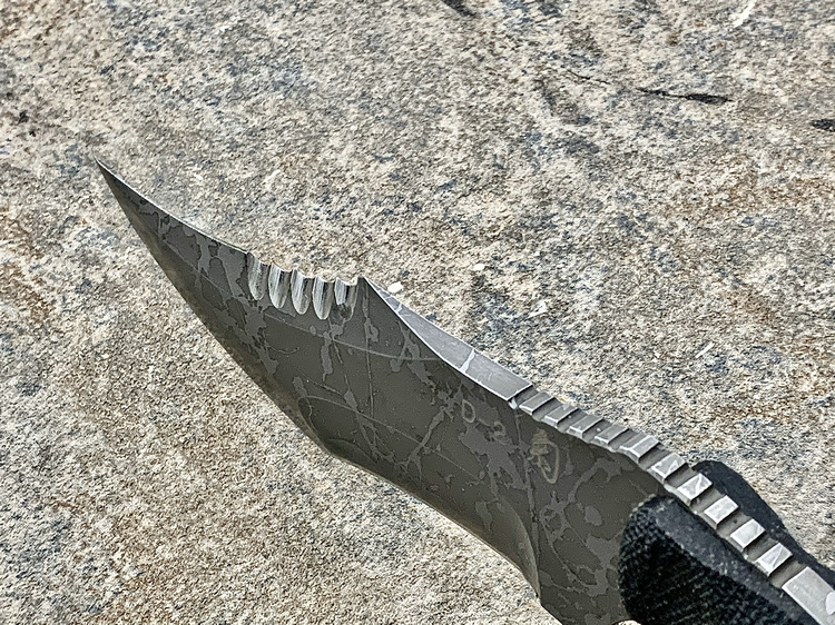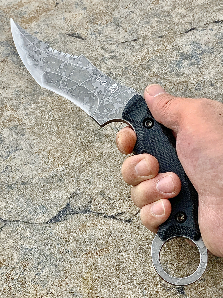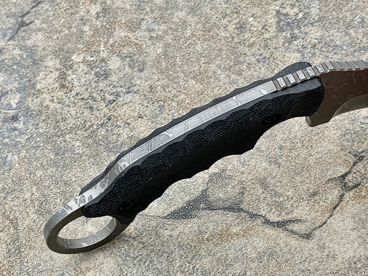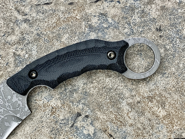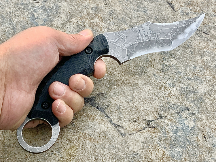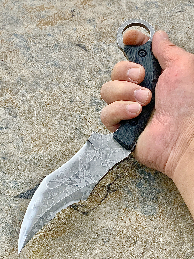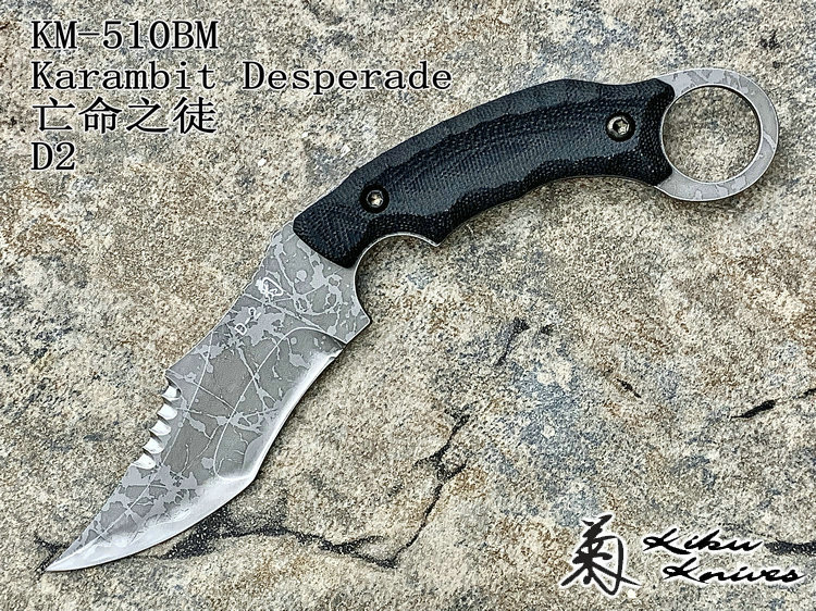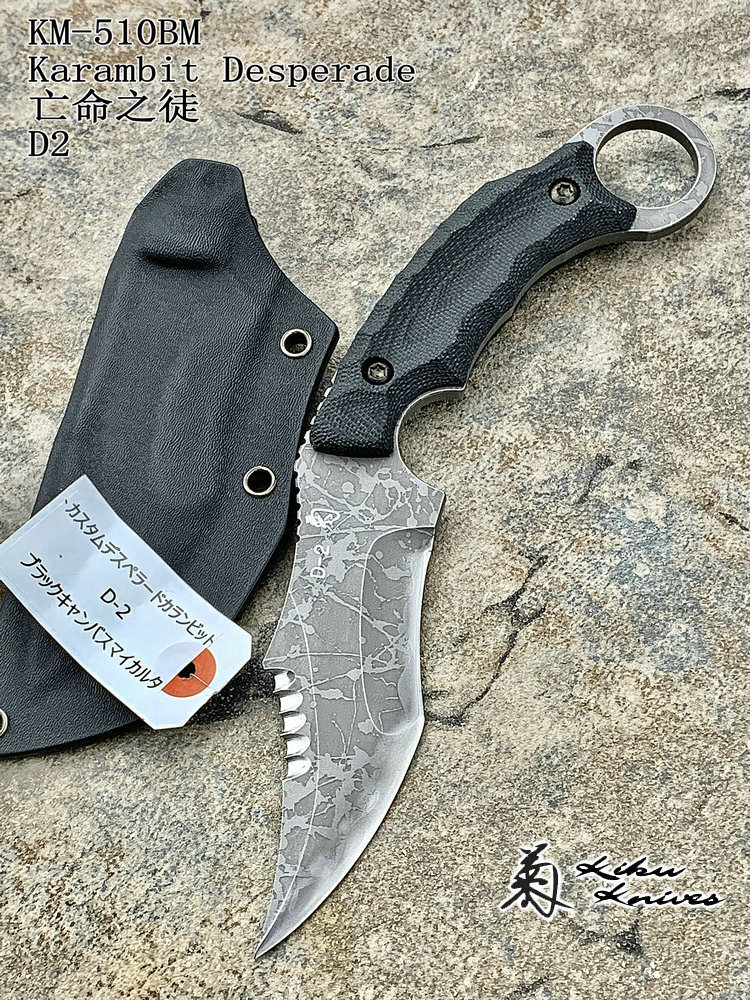 全长:231mm 刃长:102mm 刃厚:5mm 刃材:D2 硬度:62HRC 柄材:米卡塔 重量:208g 原产地:日本 黑色限定款KikuMatsuda 松田菊男 KM-510BM龙爪这把爪刀由D2钢材质制成,并使用多重研磨面打磨手法处理。刀头至刀尖处采用凸磨手法进行处理,让刀头部分特别强壮,如同神龙之爪一般,轻松摧毁任何抵抗。刀腹部位采用内弯式凹磨技术,进行切割时非常顺畅。刀背开有齿刃,仅从视觉上看起来,就绝非好惹的一把刀!