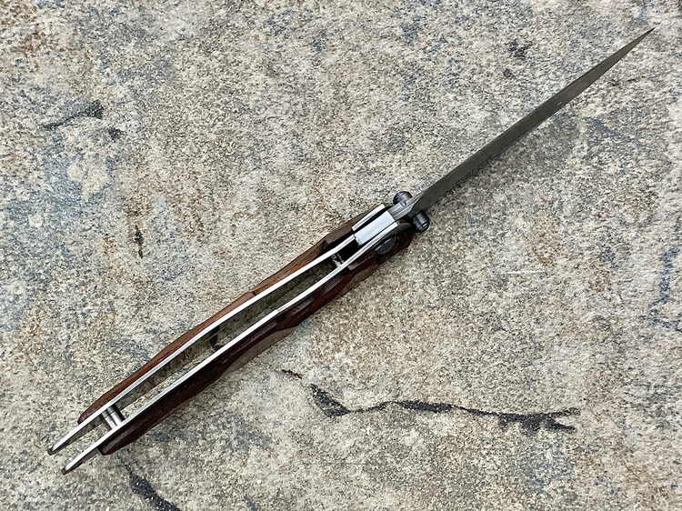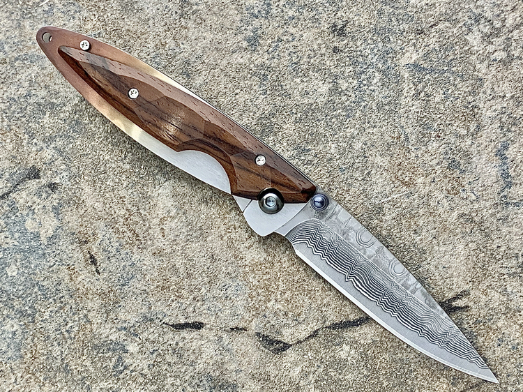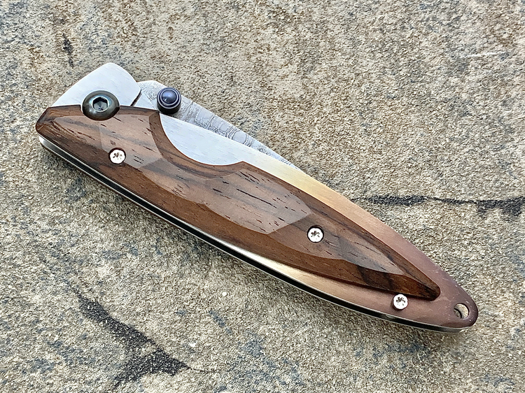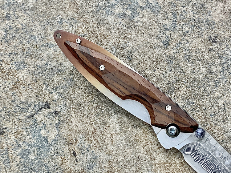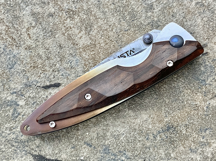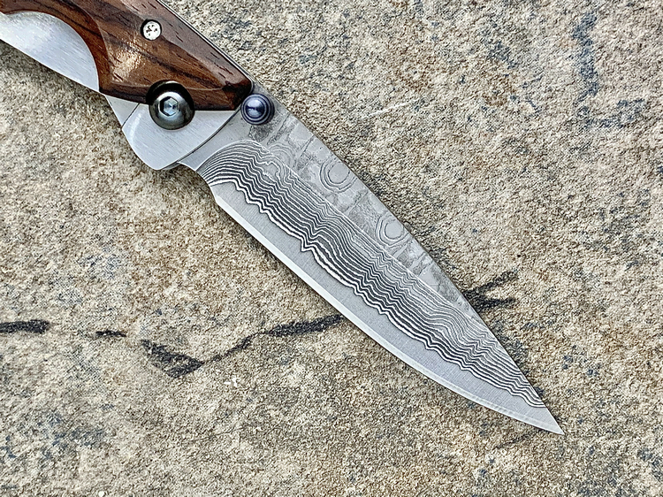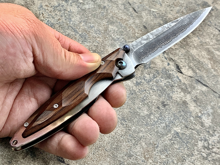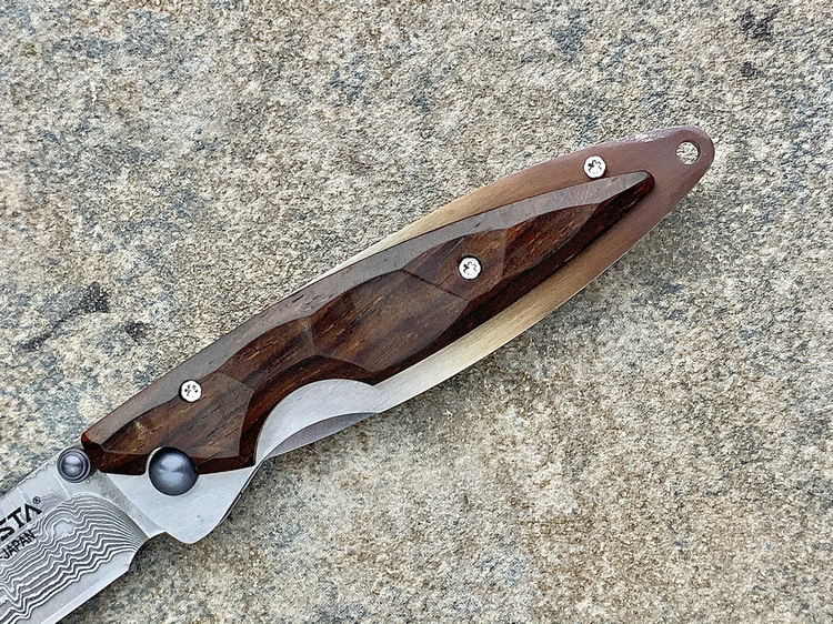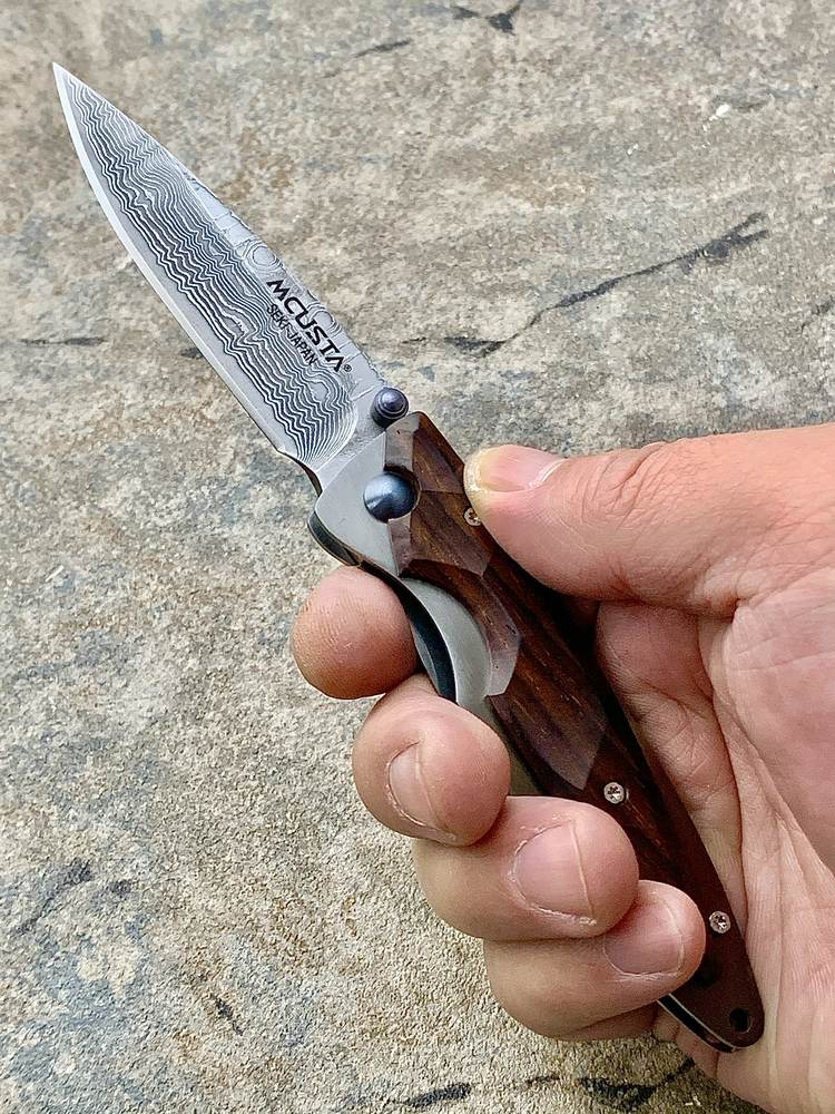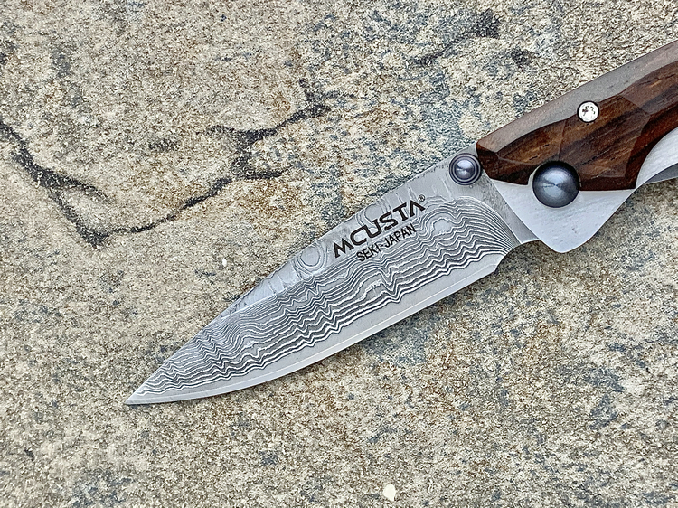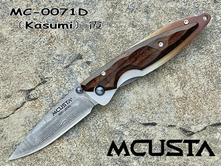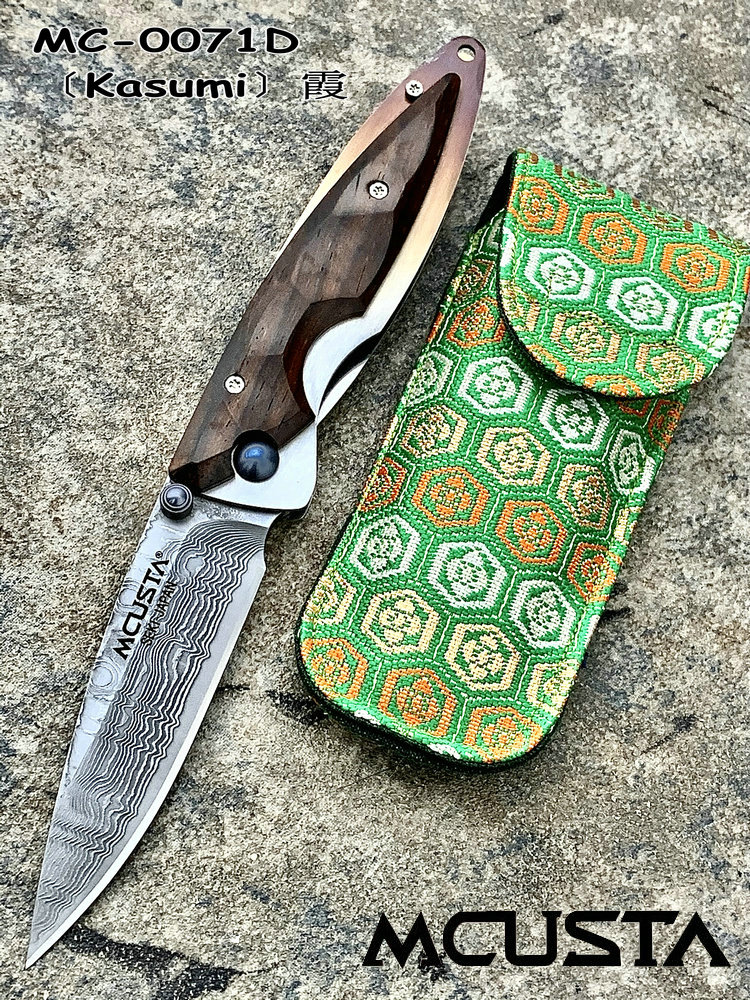 丸章工业出品的大马士革绅士折刀MC-0071D的发音为 Kasumi ,中文意思是(霞),形容的就是刀柄尾端以特殊处理过产生的渐变色彩。镶嵌的Cocobolo wood代表的就是天空中的云层,往尾段延伸,就是色彩美不胜收的晚霞景色。 这系列折刀,刀刃使用拥有曲折细纹VG-10核心大马士革钢;刀柄部份则使用Cocobolo wood藉着自然的纹路质感,来增添更浓厚的古典风味。而轴承则採用特氟隆垫片(Telfon washer),使其开合更顺畅。 另外值得一提的部份,就是随刀附赠的西阵织绢丝刀套。所谓的西阵织,为日本古代贵族、上流社会专用的丝绸织品,色彩豔丽、图桉丰富。刀套背面缝有腰带环,可以穿在皮带上便于携带。有了西阵织刀套,更加衬托刀子的美。 MCUSTA为日本关市的丸章工业株式会社所创立的新品牌.它的名称是由 “Machine Custom”所延伸出来,意思就是结合日本传统工艺,杰出人员技术以及高科技制造机械等,来生产更加精良的刀品。 MCUSTA品牌风格融合东西方元素,刀品结构简单,易于使用。丸章工业坚持所出品的刀款必须具有高品质、高艺术价值,但是以平易近人的价格贩卖,让爱刀人士能轻易的收集到心目中最好的刀。