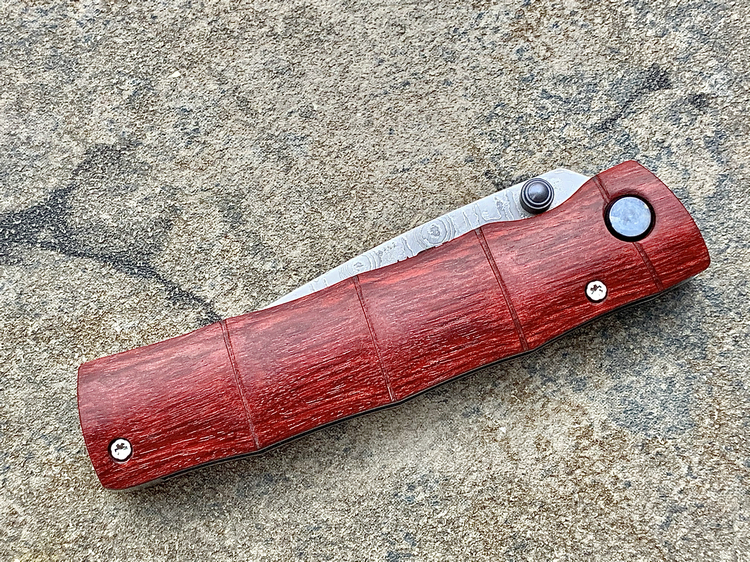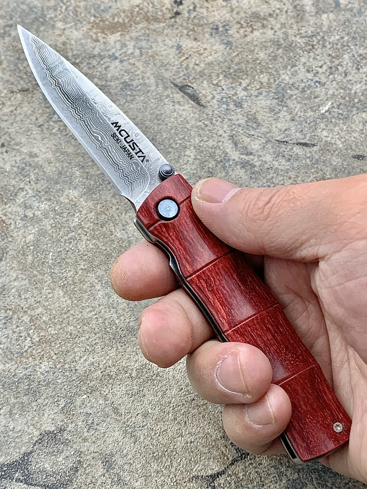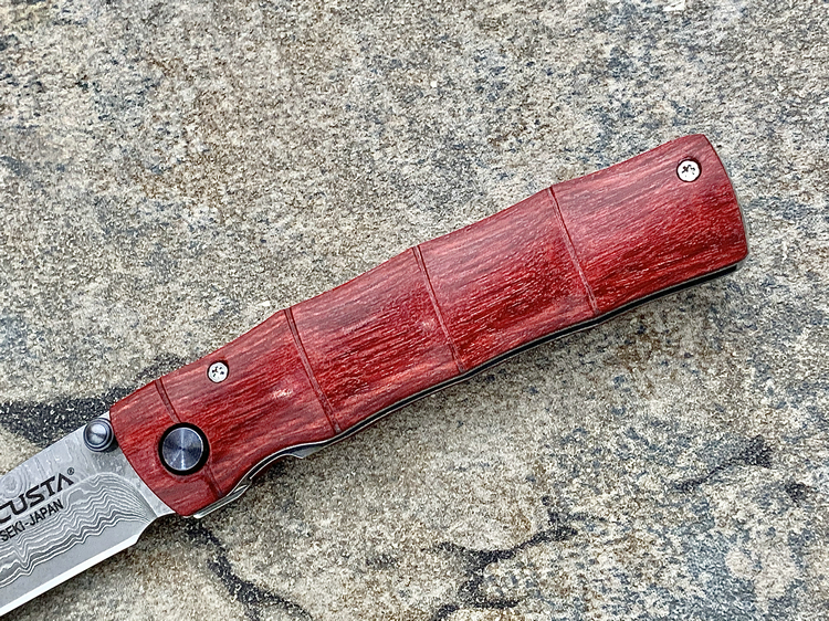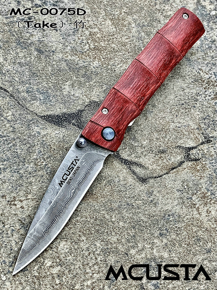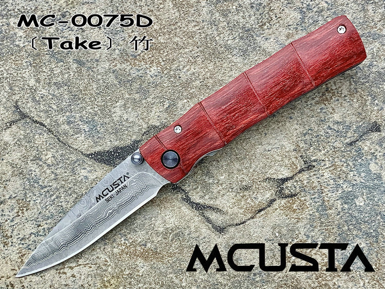 MC-0075D的名称为「竹(Take)」,发音为 Takei,中文意思是「竹」。刀匠使用Staminawood来做刀柄,并磨刻出竹节外型,纹路逼真细膩,不能不赞叹制刀者的工艺。 另外值得一提的部份,就是随刀附赠的西阵织绢丝刀套。所谓的西阵织,为日本古代贵族、上流社会专用的丝绸织品,色彩豔丽、图桉丰富。刀套背面缝有腰带环,可以穿在皮带上便于携带。有了西阵织刀套,更加衬托刀子的美。 MCUSTA为日本关市的丸章工业株式会社所创立的新品牌.它的名称是由 “Machine Custom”所延伸出来,意思就是结合日本传统工艺,杰出人员技术以及高科技制造机械等,来生产更加精良的刀品。 MCUSTA品牌风格融合东西方元素,刀品结构简单,易于使用。丸章工业坚持所出品的刀款必须具有高品质、高艺术价值,但是以平易近人的价格贩卖,让爱刀人士能轻易的收集到心目中最好的刀。