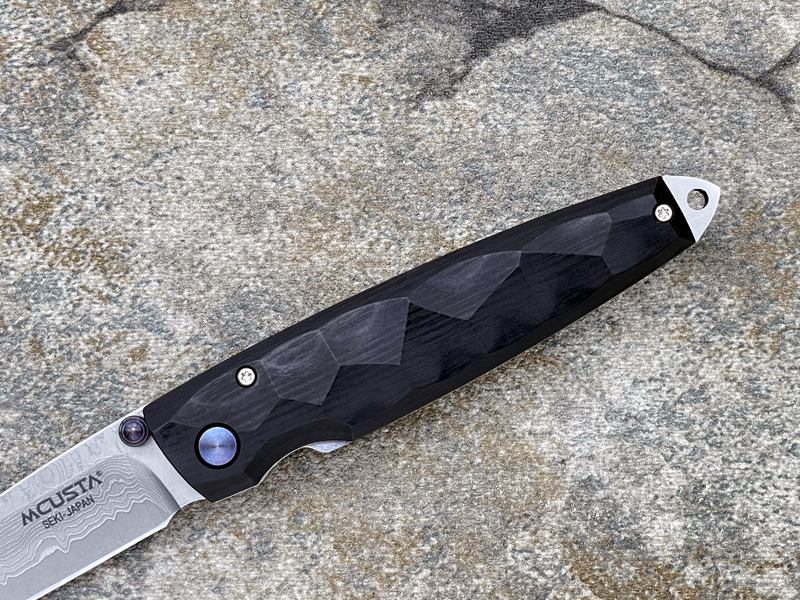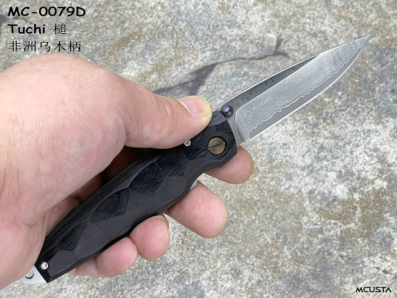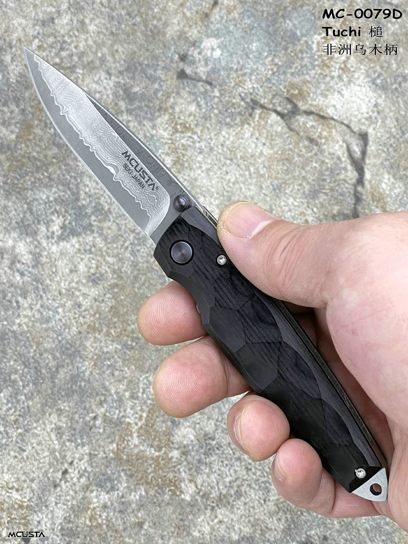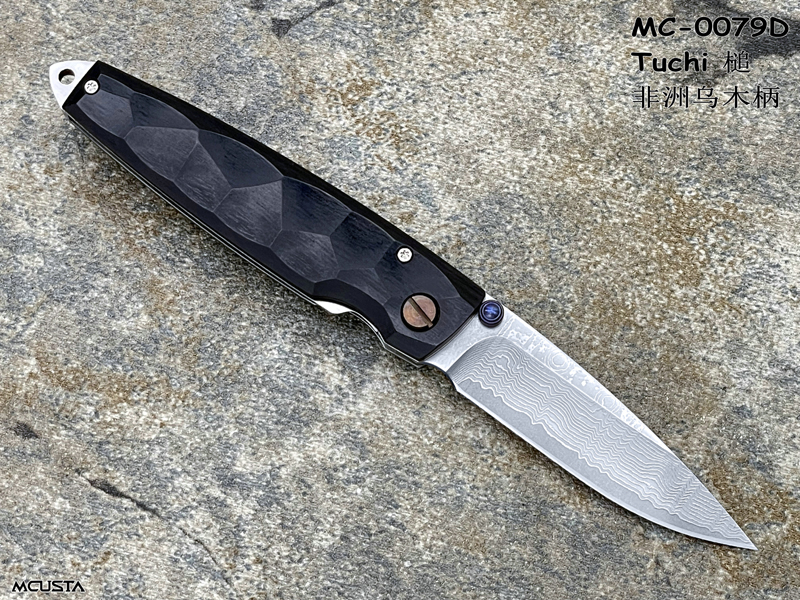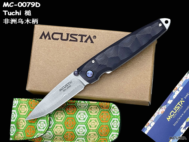 MC-0079D的名称发音为 Tsuchi,中文意思是「槌」。非洲乌木柄,经过打磨,犹如经过大锤使力敲打,产生自然的凹痕。凹凸不平的柄面,配合大马士革钢的渐层,传递着雄厚的阳刚气势。 另外值得一提的部份,就是随刀附赠的西阵织绢丝刀套。所谓的西阵织,为日本古代贵族、上流社会专用的丝绸织品,色彩豔丽、图桉丰富。刀套背面缝有腰带环,可以穿在皮带上便于携带。有了西阵织刀套,更加衬托刀子的美。 MCUSTA为日本关市的丸章工业株式会社所创立的新品牌.它的名称是由 “Machine Custom”所延伸出来,意思就是结合日本传统工艺,杰出人员技术以及高科技制造机械等,来生产更加精良的刀品。 MCUSTA品牌风格融合东西方元素,刀品结构简单,易于使用。丸章工业坚持所出品的刀款必须具有高品质、高艺术价值,但是以平易近人的价格贩卖,让爱刀人士能轻易的收集到心目中最好的刀。