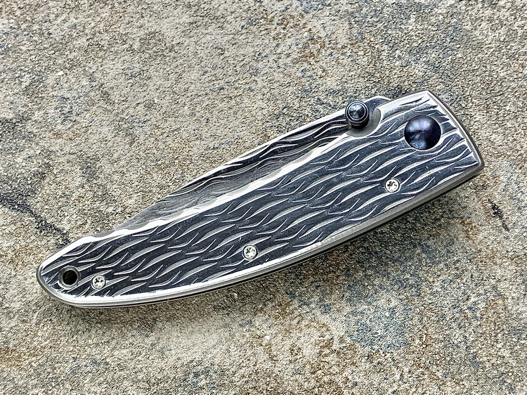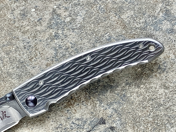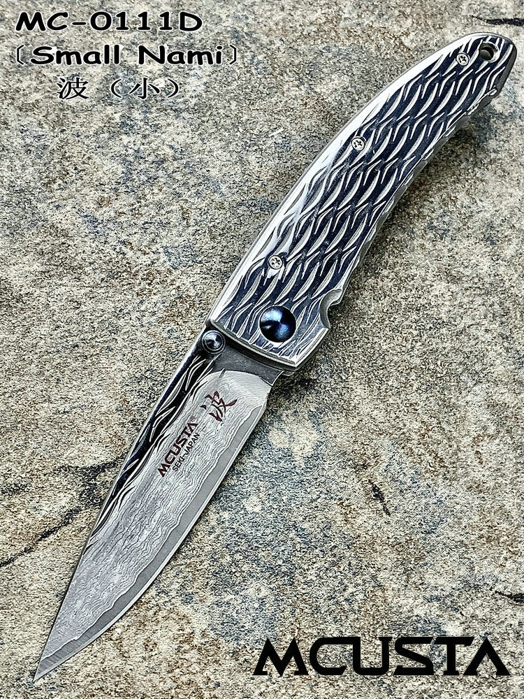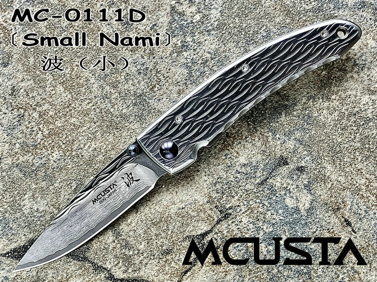 MC-0112D及MC-0111D的名称为「波」,发音为” Nami”,中文意思是「波」。420J2钢柄,经过特殊的塑型压工,产生如水波般的纹理,产生自然的凹痕。凹凸不平的柄面,配合大马士革刀刃,散发出优美流畅的气息。