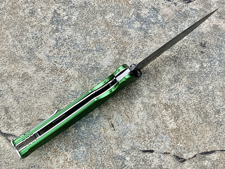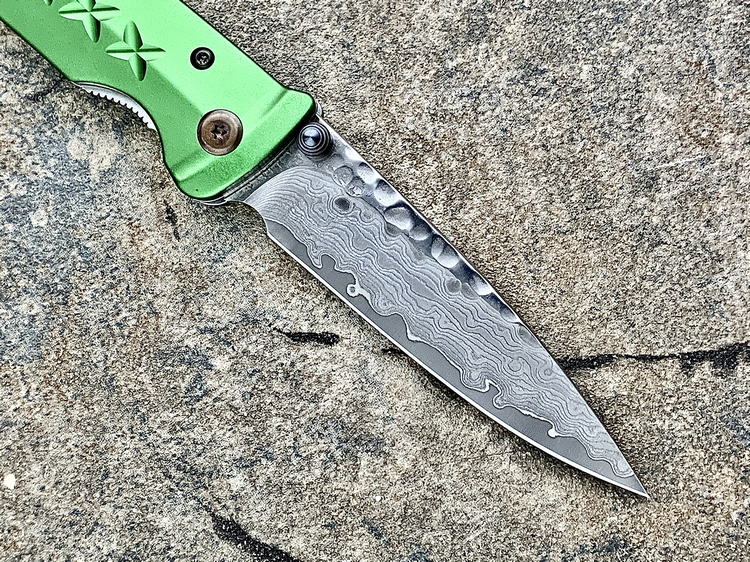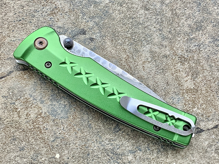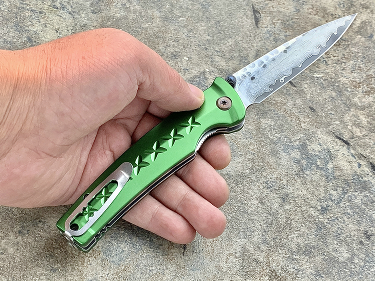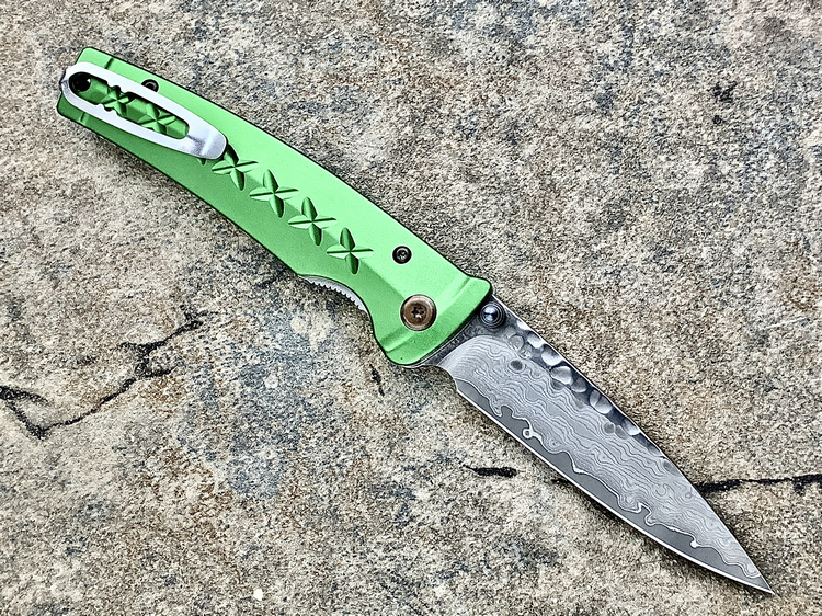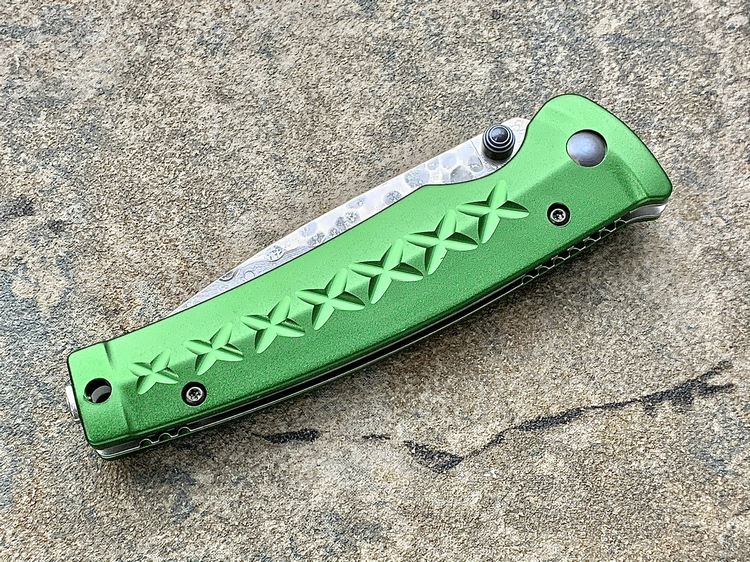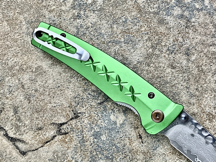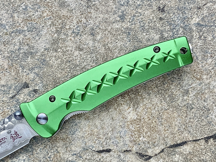 鎚,犹如经过大锤敲打,镐地呈现凹凸不平,配合大马士革钢刀身(VG-10核心)呈现出传统武士刀烧刃纹的外观,传递着钢中带柔的气势。柄采铝合金制成并刻上图纹,除增加美观外并大幅降低重量,整体看起来高贵典雅;背夹设计??便于携带。