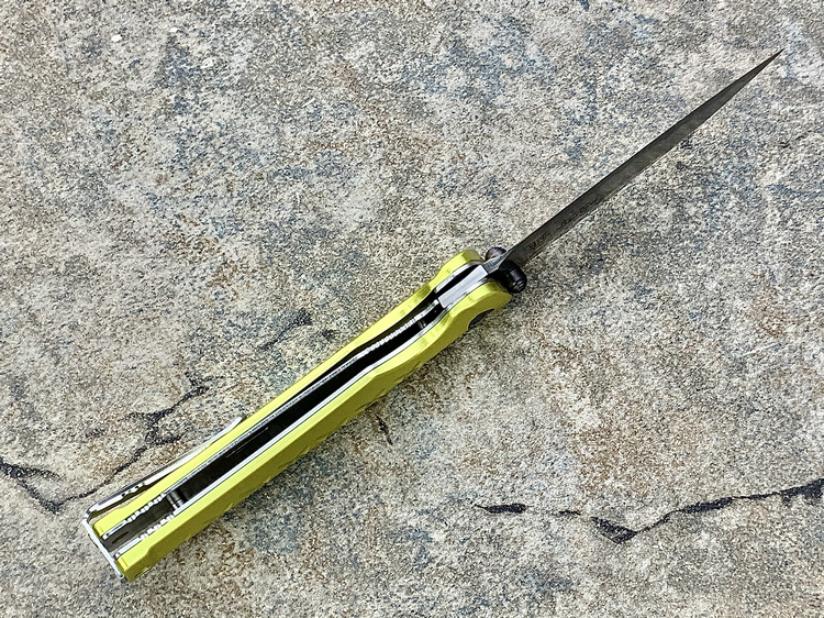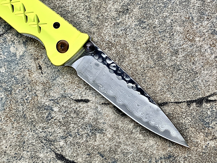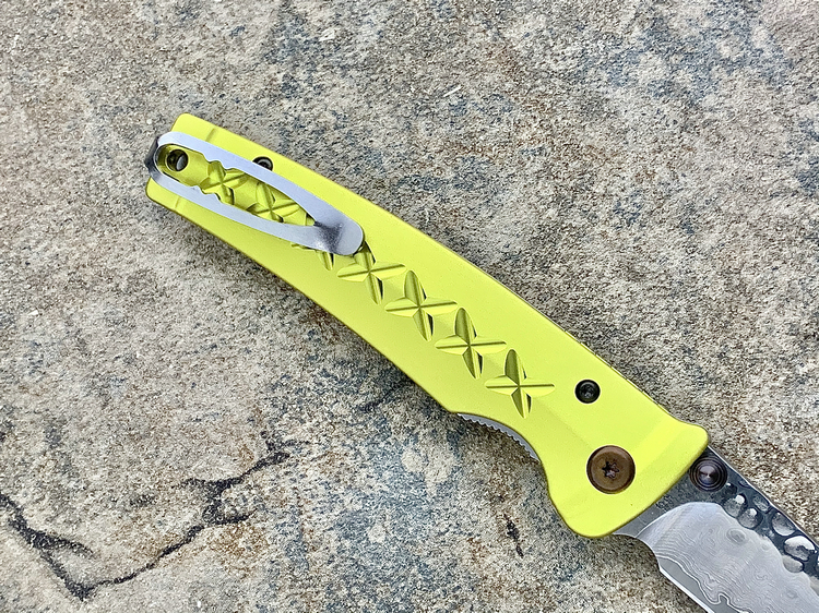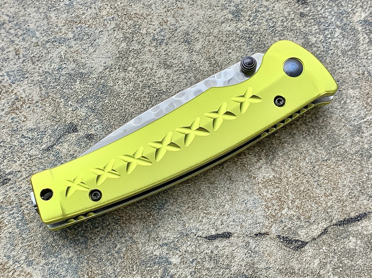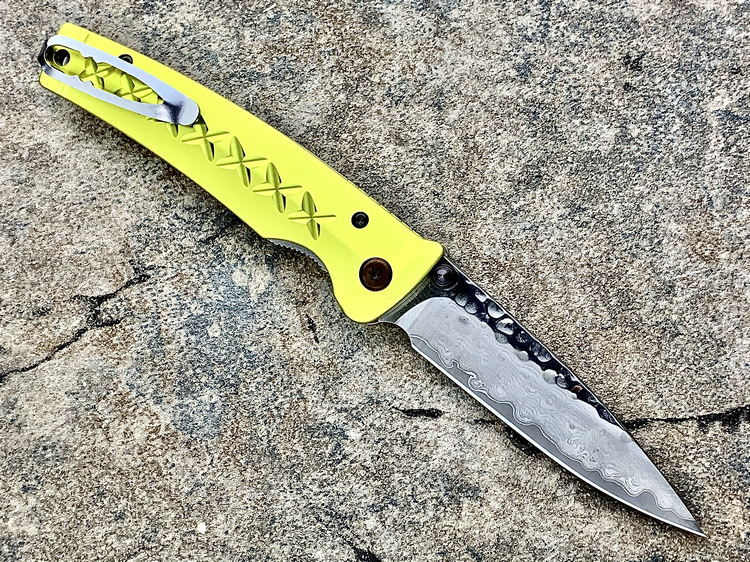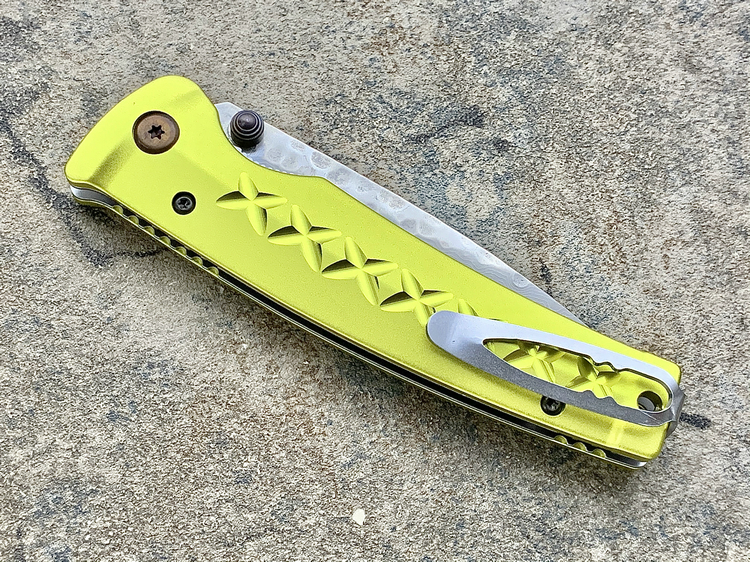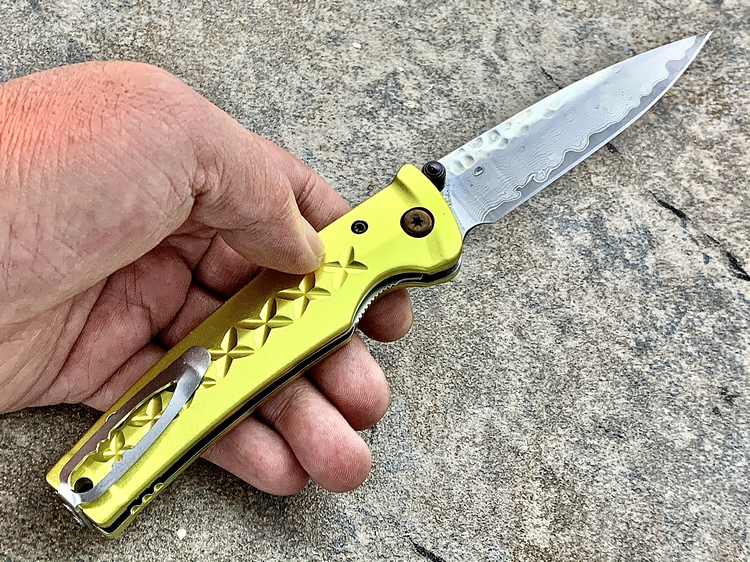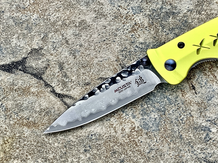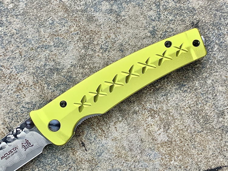 鎚,犹如经过大锤敲打,镐地呈现凹凸不平,配合大马士革钢刀身(VG-10核心)呈现出传统武士刀烧刃纹的外观,传递着钢中带柔的气势。柄采铝合金制成并刻上图纹,除增加美观外并大幅降低重量,整体看起来高贵典雅;背夹设计??便于携带。