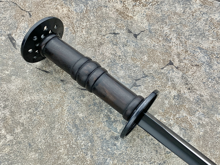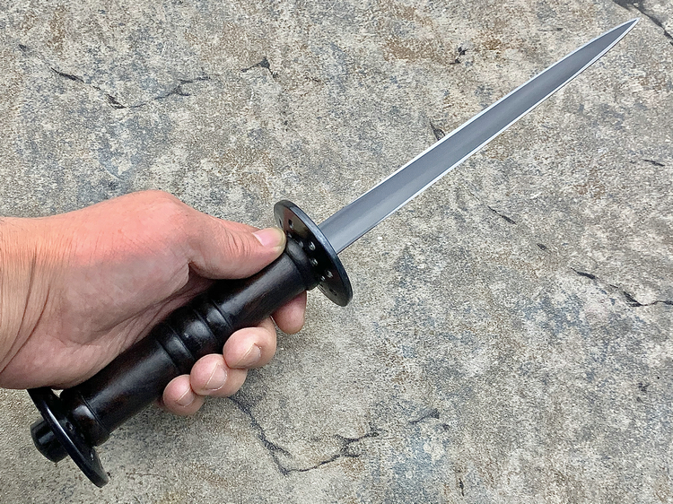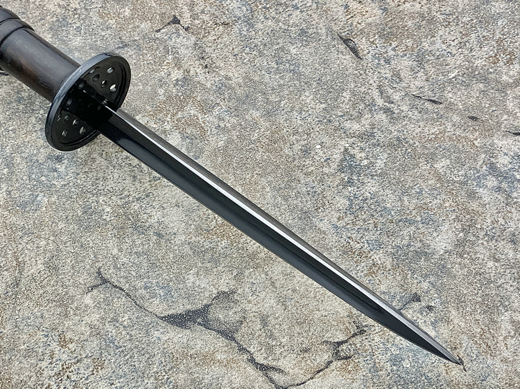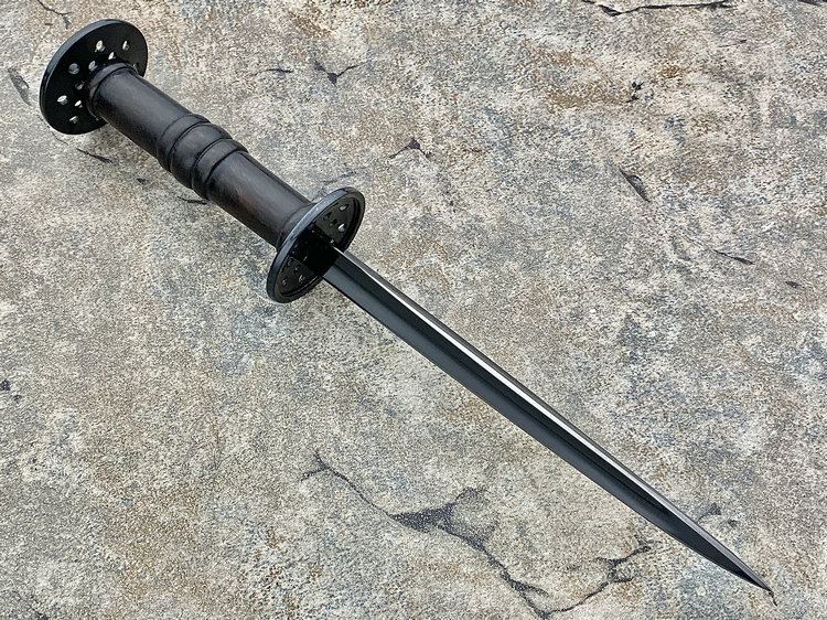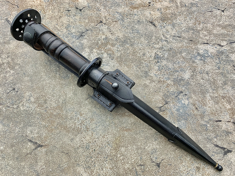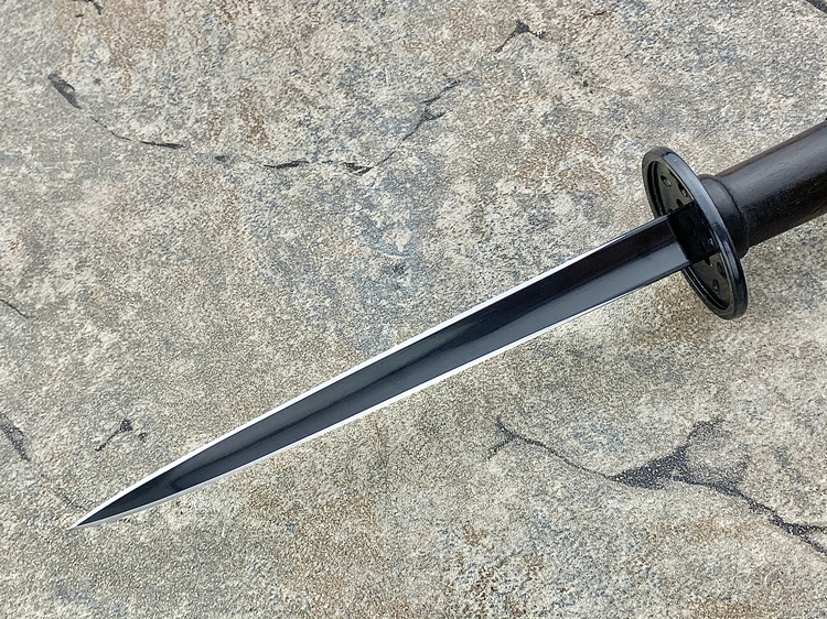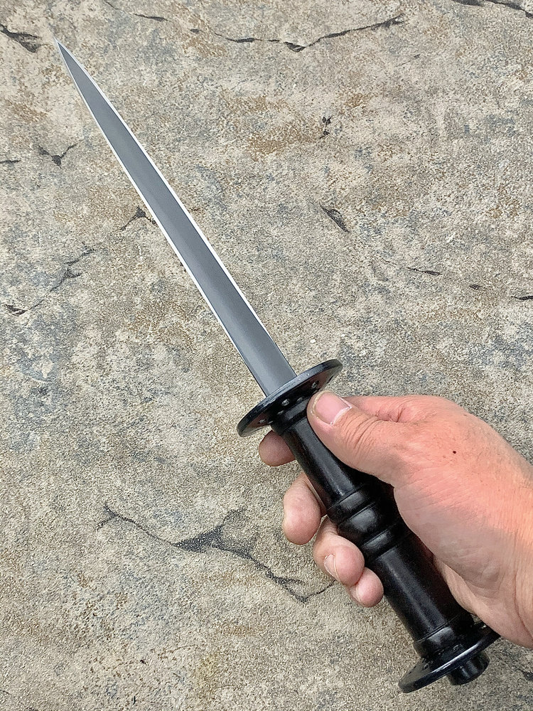 全长:327mm 刃长:198mm 刃宽15mm*15.5mm*15.5mm(三棱型) 刃材:1060 手柄:实木 重量:279g含鞘417g 刀鞘:实木外覆植鞣革 产地:印度 采用1060高碳钢表面黑色涂层,三棱型设计可以最大强度的提升穿透力,圆形护手在战斗中可以很好的保护手,实木手柄在掌心部位隆起可以更好的掌握!刀鞘内部实木外覆植鞣革金属配件发蓝处理可以配于腰间。