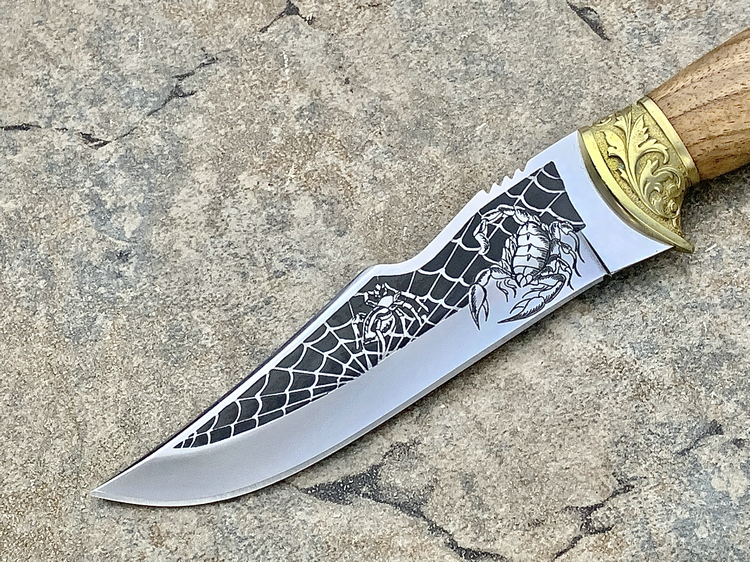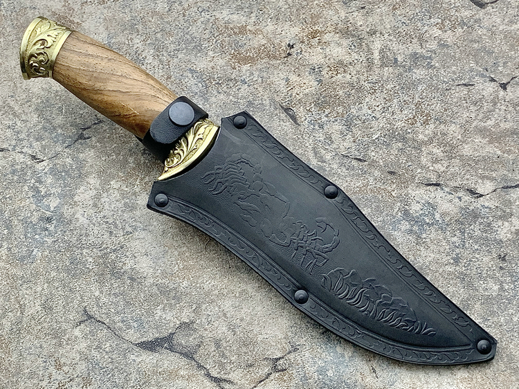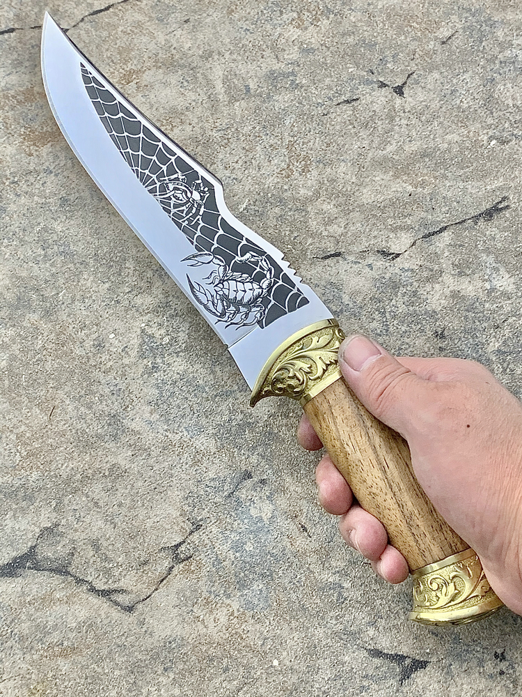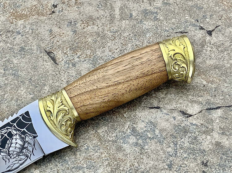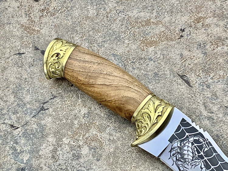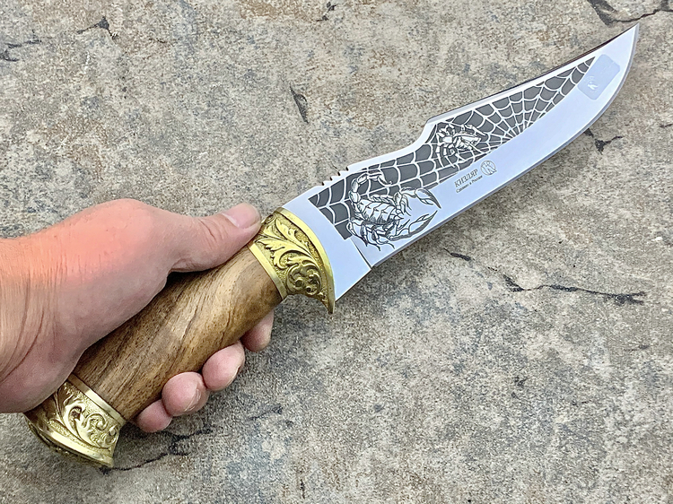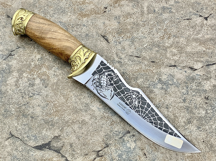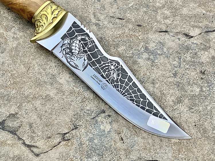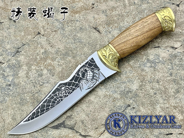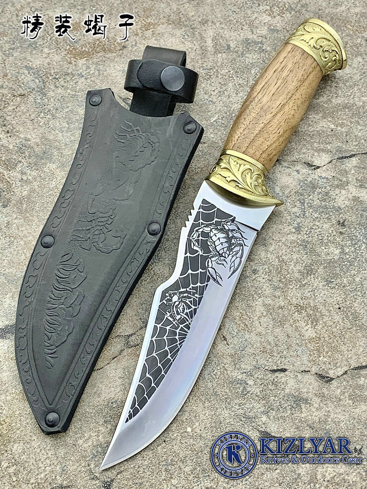 这是一把战斗民族的传统狩猎刀,刃面图案由技艺精湛的画师手工绘制,激光打印机通过聚焦光束绘制而成,绘制深度约为2微米表面有明显凹凸感。Z90耐腐蚀碳素工具钢精致而成,表面镀铬镜面处理。彰显高贵气质。手柄为一体龙骨,藤黄檀柄 黄铜金具,每一支都刻有独立编号,让此刀更加具有收藏价值。真皮刀鞘印有精美图案,保护爱刀的同时又不失美感。kizlyar俄罗斯基兹利亚尔制作手工刀具的历史可以追溯到1990年,并于1995年成功办理了刀具出口凭证。公司将自身的刀具制作方法定位为:将沿用了多个世纪的传统直刀工艺与现代先进冶金技术相融合的思路,以保证可以生产出高于一般品质的优秀刀具。即使到现在,大部分的刀具依旧采用传统的手工制法,并在每一把刀具出厂之前都会有专人负责检查每一个细节,以确保公司实现高水准的产品质量控制标准。kizlyar并不像别的刀具厂,甚至一些有名的刀具制作巨头,将自己的生产线转移到人力相对便宜的第三世界国家,而是从最初的选材到最后的装箱全部都由自己公司独立完成,这在当今的成本效益至上的世界,是相当少见的。如今kizlyar俄罗斯基兹利亚尔已经成长为刀界的明星,并且是俄罗斯特种兵用刀的生产企业(如凤凰、战鹰、秃鹰、海鹰、克服、KO2、指挥官、W-8等被俄罗斯特战部队采用),普京的御用刀厂,其生产的刀具出口到中国、美国、澳大利亚、哈萨克斯坦、白俄罗斯以及欧洲很多国家,得到了使用者的广泛好评!