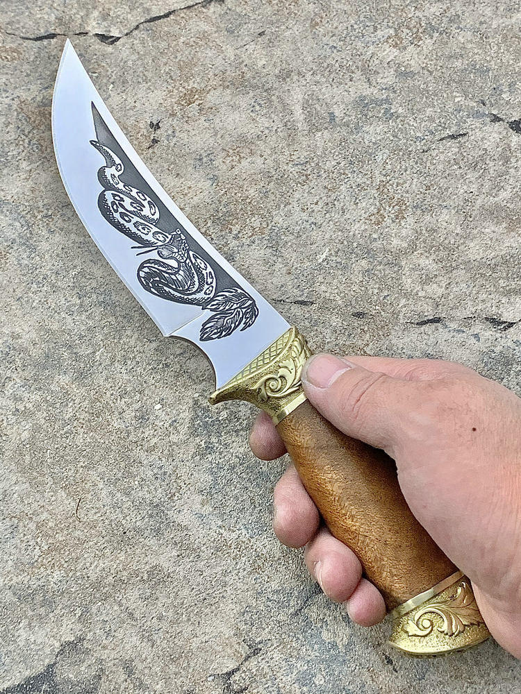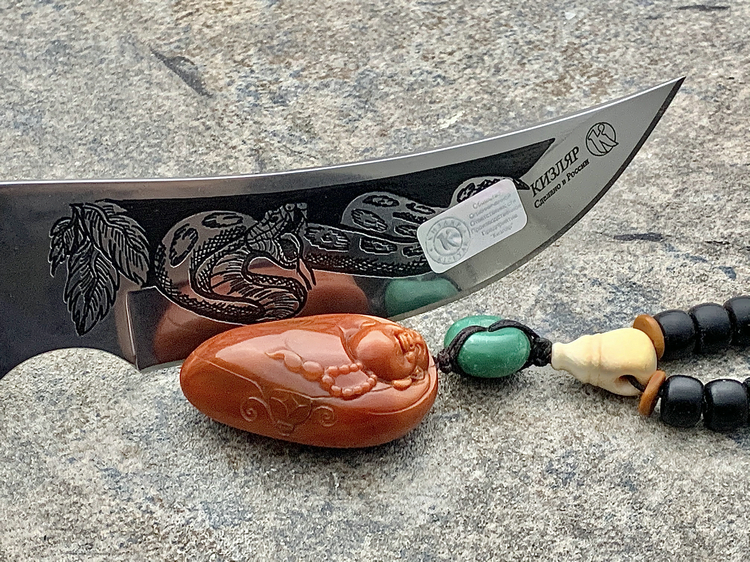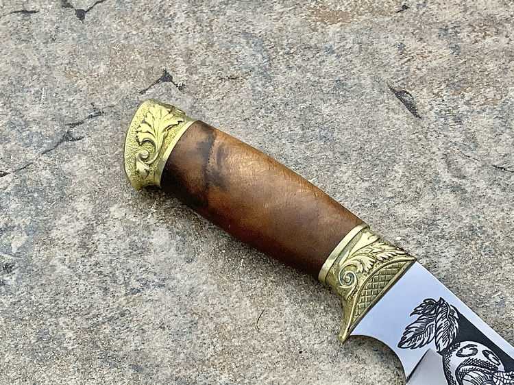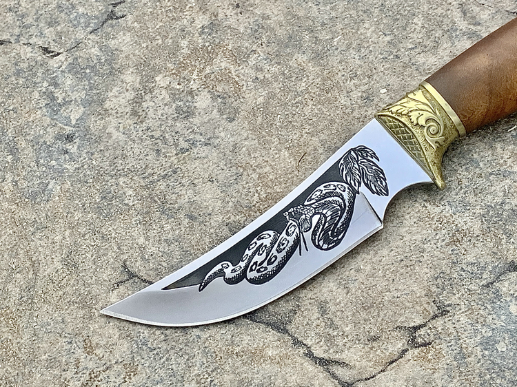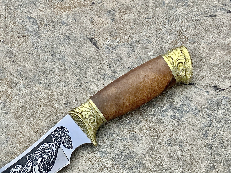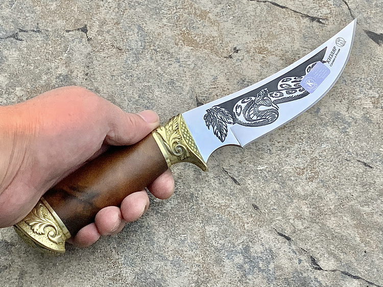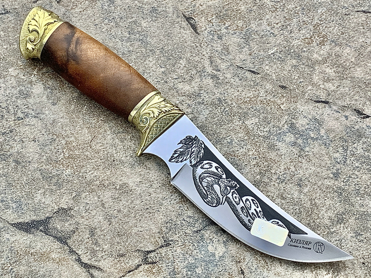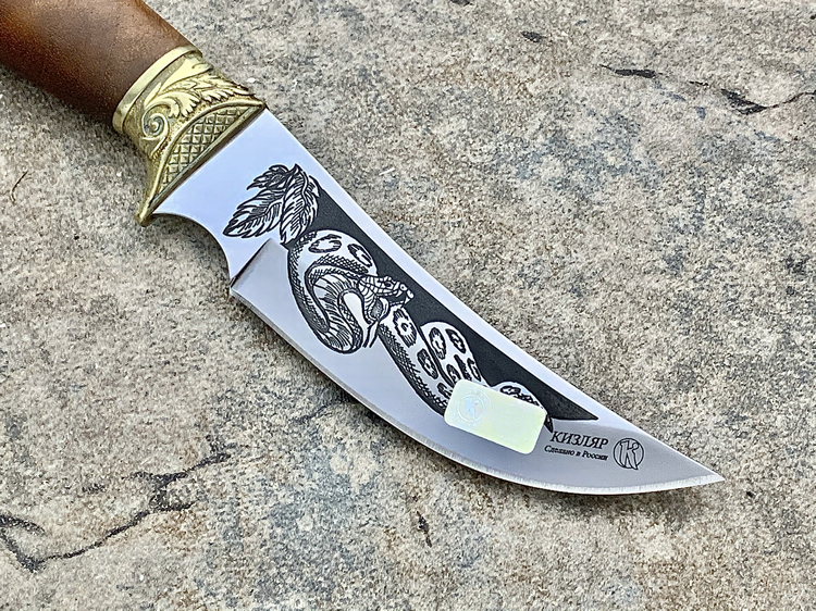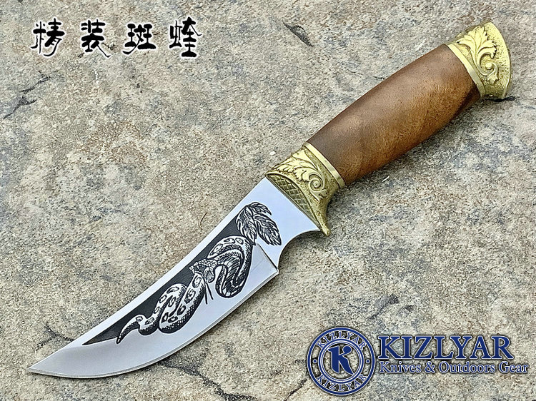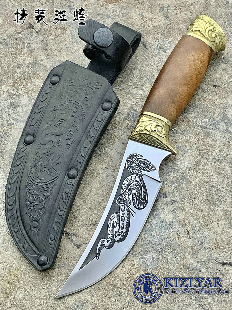 这是一把战斗民族的传统狩猎刀,刃面图案由技艺精湛的画师手工绘制,激光打印机通过聚焦光束绘制而成,绘制深度约为2微米表面有明显凹凸感。Z90耐腐蚀碳素工具钢精致而成,表面镀铬镜面处理。彰显高贵气质。手柄为一体龙骨,藤黄檀柄 黄铜金具,每一支都刻有独立编号,让此刀更加具有收藏价值。真皮刀鞘印有精美图案,保护爱刀的同时又不失美感。kizlyar俄罗斯基兹利亚尔制作手工刀具的历史可以追溯到1990年,并于1995年成功办理了刀具出口凭证。公司将自身的刀具制作方法定位为:将沿用了多个世纪的传统直刀工艺与现代先进冶金技术相融合的思路,以保证可以生产出高于一般品质的优秀刀具。即使到现在,大部分的刀具依旧采用传统的手工制法,并在每一把刀具出厂之前都会有专人负责检查每一个细节,以确保公司实现高水准的产品质量控制标准。kizlyar并不像别的刀具厂,甚至一些有名的刀具制作巨头,将自己的生产线转移到人力相对便宜的第三世界国家,而是从最初的选材到最后的装箱全部都由自己公司独立完成,这在当今的成本效益至上的世界,是相当少见的。如今kizlyar俄罗斯基兹利亚尔已经成长为刀界的明星,并且是俄罗斯特种兵用刀的生产企业(如凤凰、战鹰、秃鹰、海鹰、克服、KO2、指挥官、W-8等被俄罗斯特战部队采用),普京的御用刀厂,其生产的刀具出口到中国、美国、澳大利亚、哈萨克斯坦、白俄罗斯以及欧洲很多国家,得到了使用者的广泛好评!