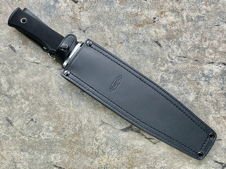这把刀有一个非常漂亮的黑色皮鞘,无论你是站着还是坐着,它都能很好地固定在腰带上。这把刀装在一个结实的防水塑料盒子里,里面有一块DC4磨刀石。