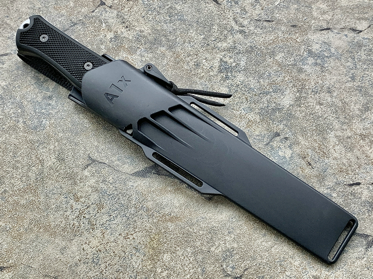 X刀强度的基础在于钴钢核心夹钢,也在于经过深思熟虑的结构,消除了断裂带。加上手形凸边,X刀是一个概念,在安全和舒适性方面完胜世界上的所有刀具。 关于碳化钨涂层版本的几句话:这个表面是我们遇到过的最难的。虽然我们真的试图用我们能找到的最坚硬、最干燥的卷曲桦树来磨光黑色涂层,但我们从未在这个极其坚硬、耐用的表面上成功地打孔。但是,我们不能保证它会永远存在,毕竟,刀锋可以被磨碎,当然可以咬碎表面的钻石或陶瓷石。但你可能从来没有遇到过更坚硬的表面,硬度是2400hv(维氏硬度)或大约HRC 83。 我们投入了大量的精力来设计一个安全的刀鞘,刀鞘的设计决定了刀的使用范围,在这里,我们已经尽了最大的努力,以获得一个安全的刀鞘,方便使用刀。刀鞘有一个运动锁(带拉绳的折叠支架)和一个工作安全细节,允许刀在您决定使用它之前就位。这是一个有点拉绳和支架的做法,但我们喜欢把安全第一-一把丢失的刀是没有用的。因此,运动锁将使刀具能够在没有任何风险的情况下倾斜或倾斜地固定在身体或设备上。