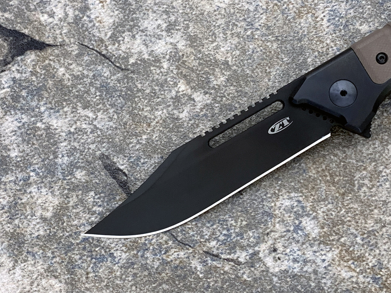 刀片是水滴头搏伊刀型开假刃。CPM 20CV刃材具有优异的硬度和耐磨性,能够承受并保持锋利的刀锋,具有抗冲击的韧性,并且具有所有高钒钢中铬含量最高的优异耐腐蚀性。为了增强刀片保护措施,ZT增加了黑色DLC(类金刚石碳)涂层,陶瓷珠喷砂的非眩光工艺。