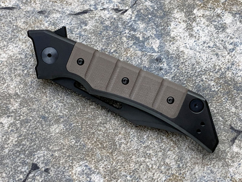 钢质背夹可左右互换,带有黑色Teflon?饰面。手柄上的青铜阳极氧化钛管垫片由两个定制螺钉固定。刀片根部开了一系列的装饰孔,与沿着刀背的止滑槽相呼应,为这把非常漂亮的刀增添了微妙的细节。