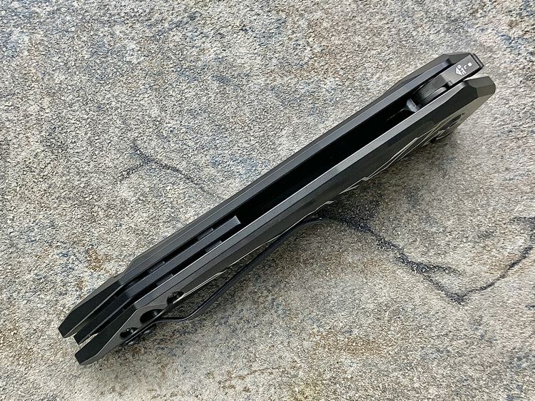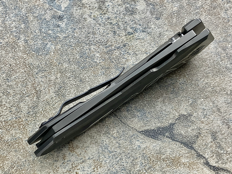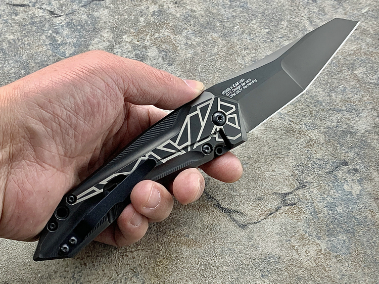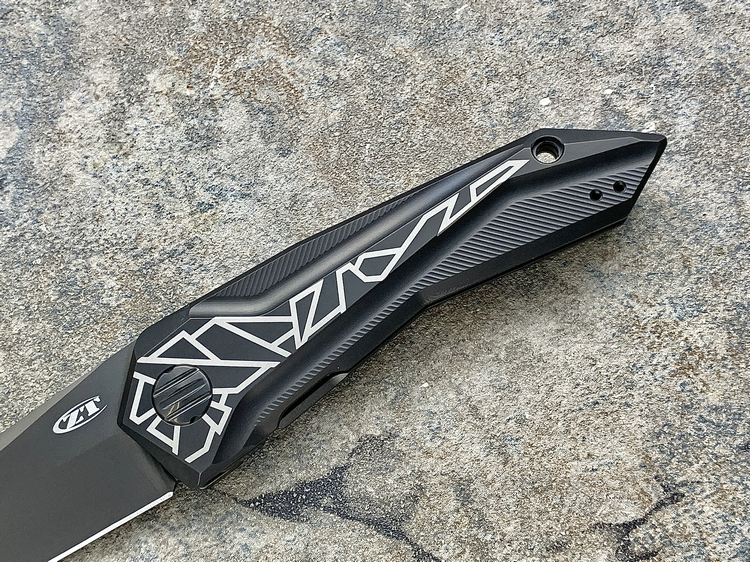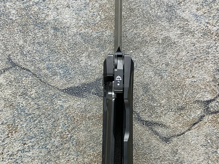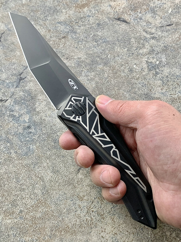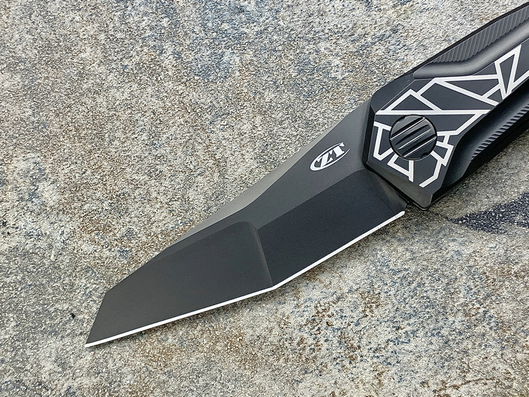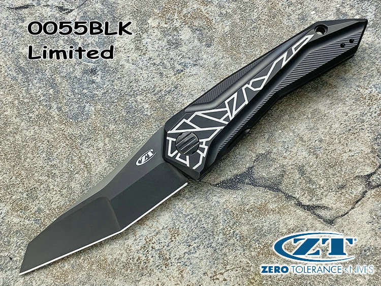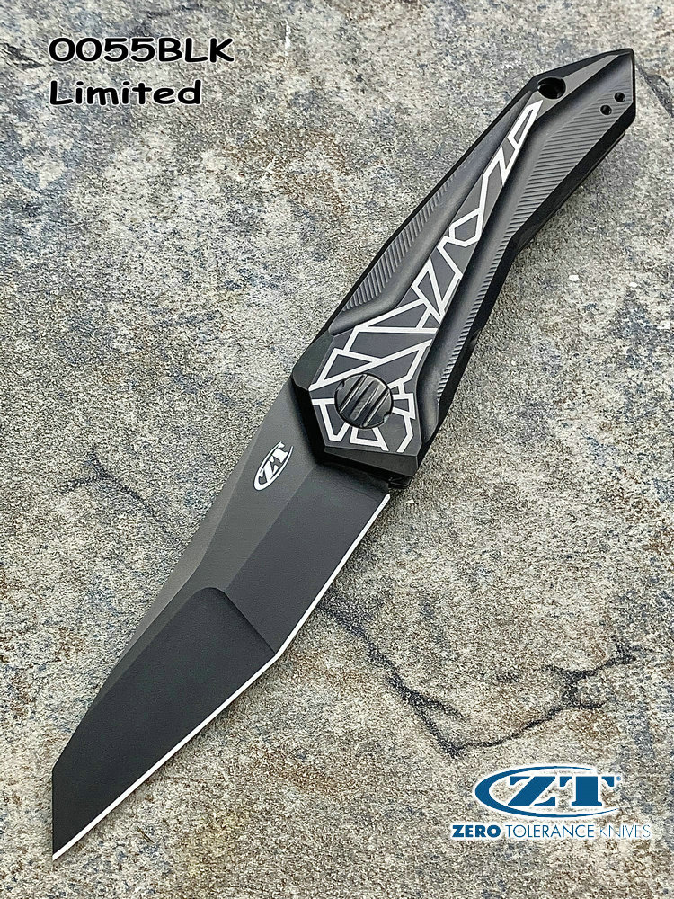 0055BLK具有Gus的SLT隐藏式挡板选项卡。切刀闭合时,挡板被隐藏。准备打开它时,请拉回SLT。弹簧将卡舌向上翻转到位。然后只需拉回选项卡,便像其他ZT一样打开0055BLK。隐藏的SLT可确保没有棘爪沿脊柱或手柄下方弹出,以中断0055BLK的线条流畅。0055BLK的刀片从ZT的KVT滚珠轴承系统的手柄中滑出即可使用。动作类似于两阶段步枪扳机,完全上瘾。我们凭经验说话。