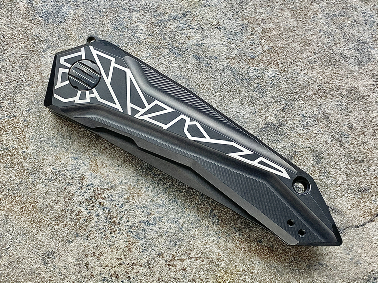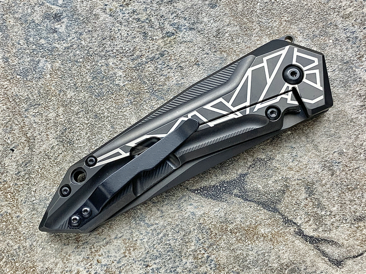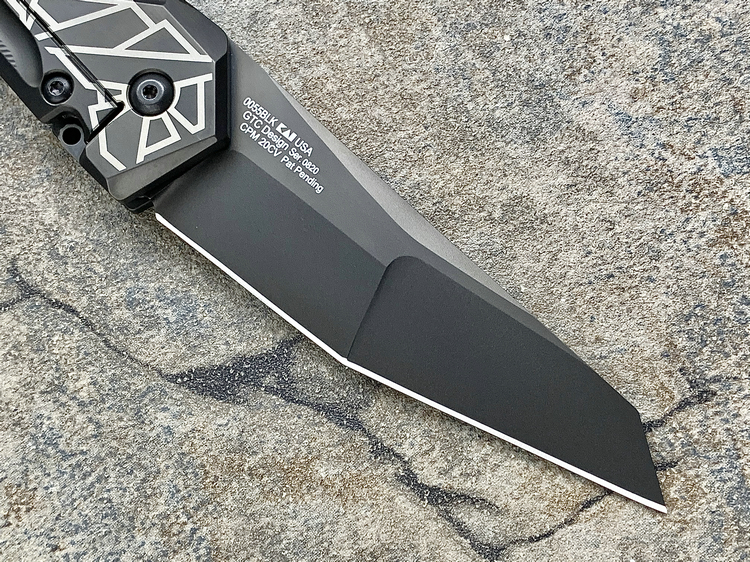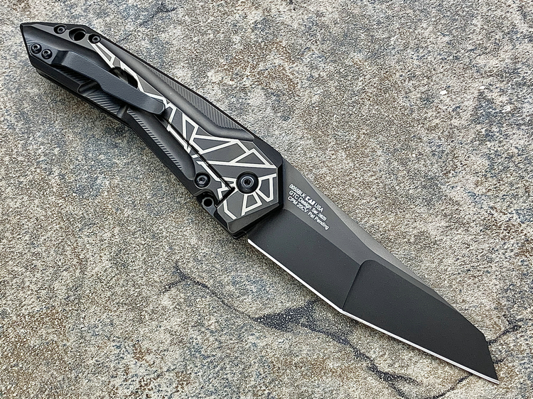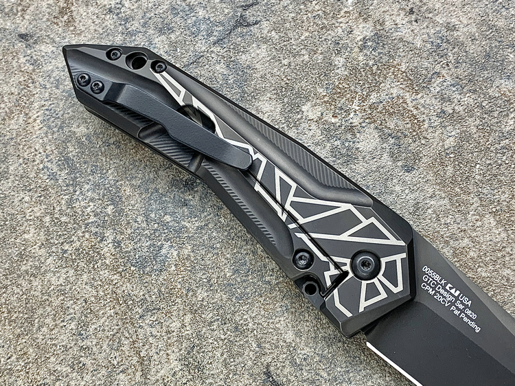 刀片为CPM 20CV不锈钢,该配方可提供增强的韧性和抗边缘崩裂性,而不会损失耐磨性和锋利的,持久的边缘。手柄是3D加工的钛合金,带有钛合金框架锁和硬化的钢制锁杆插件。定制的后挡板是磨砂黑的阳极氧化铝,其余的硬件是黑色。