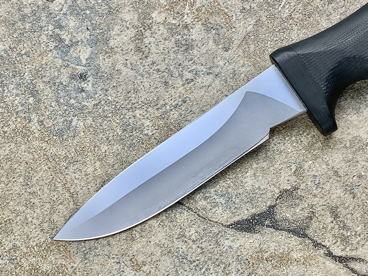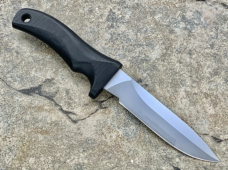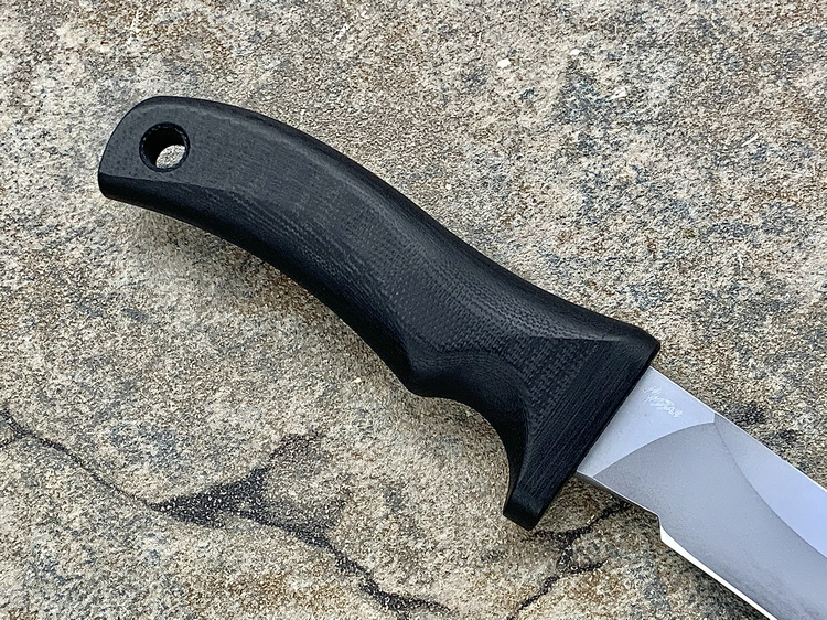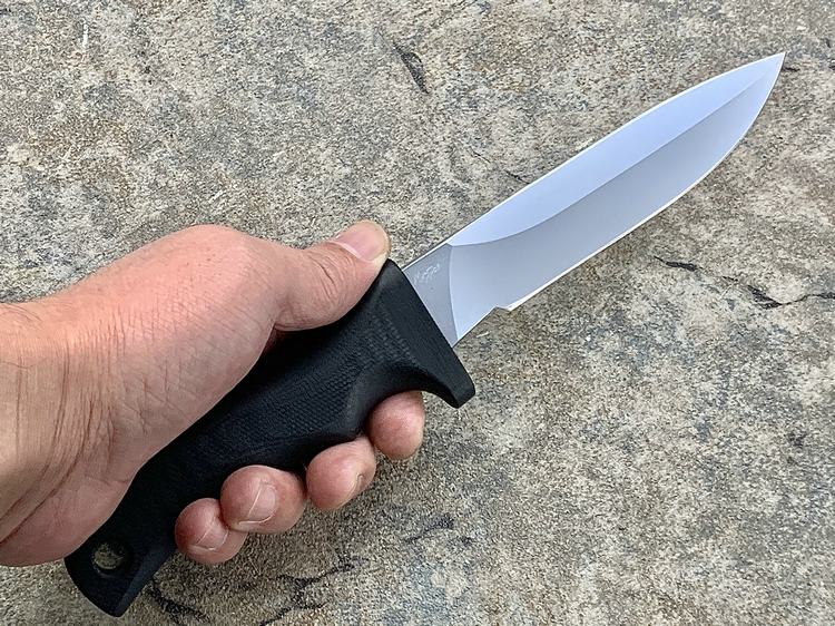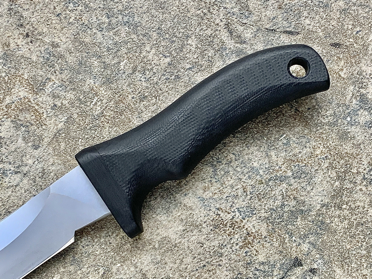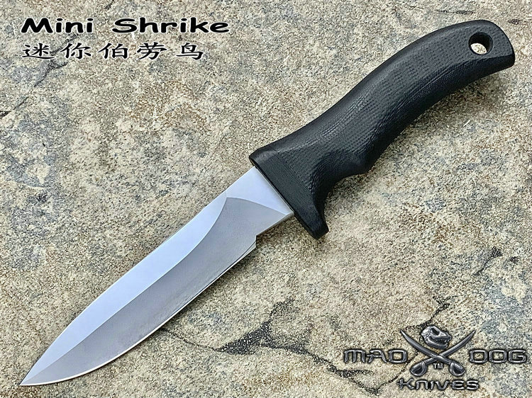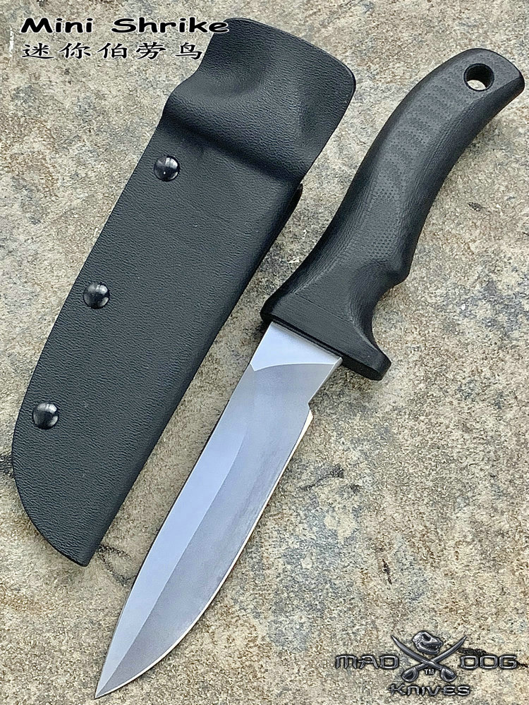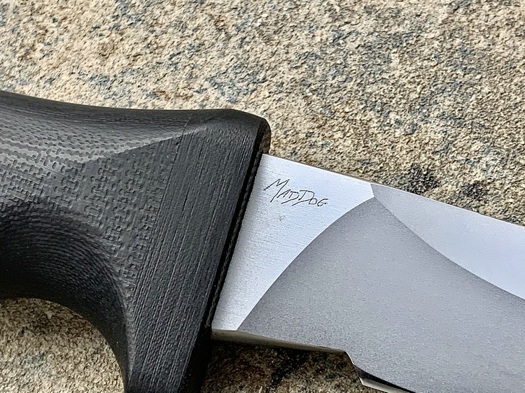 它的手柄符合人体工程学设计,把握极其舒适称手。食指凹槽让使用者即使看不见也能凭手感找到握刃的位置。材料使用特殊的玻璃纤维与环氧基树脂合成来做刃的握柄。此种特殊材质每一平方英寸可承受79000磅的压力(约3600公斤),可以轻易地承受0.45口径子弹的冲击。因此Mad Dog刃的握柄就算很严苛的使用也不会造成损害。此种握柄材质同时也提供了极好的绝缘,每0.001吋可承受1000伏特的电压,因而可以保护持刃者不会在使用刃具时遭受电击。另外这种握柄材质也几乎不受化学物质的渗透及侵蚀。