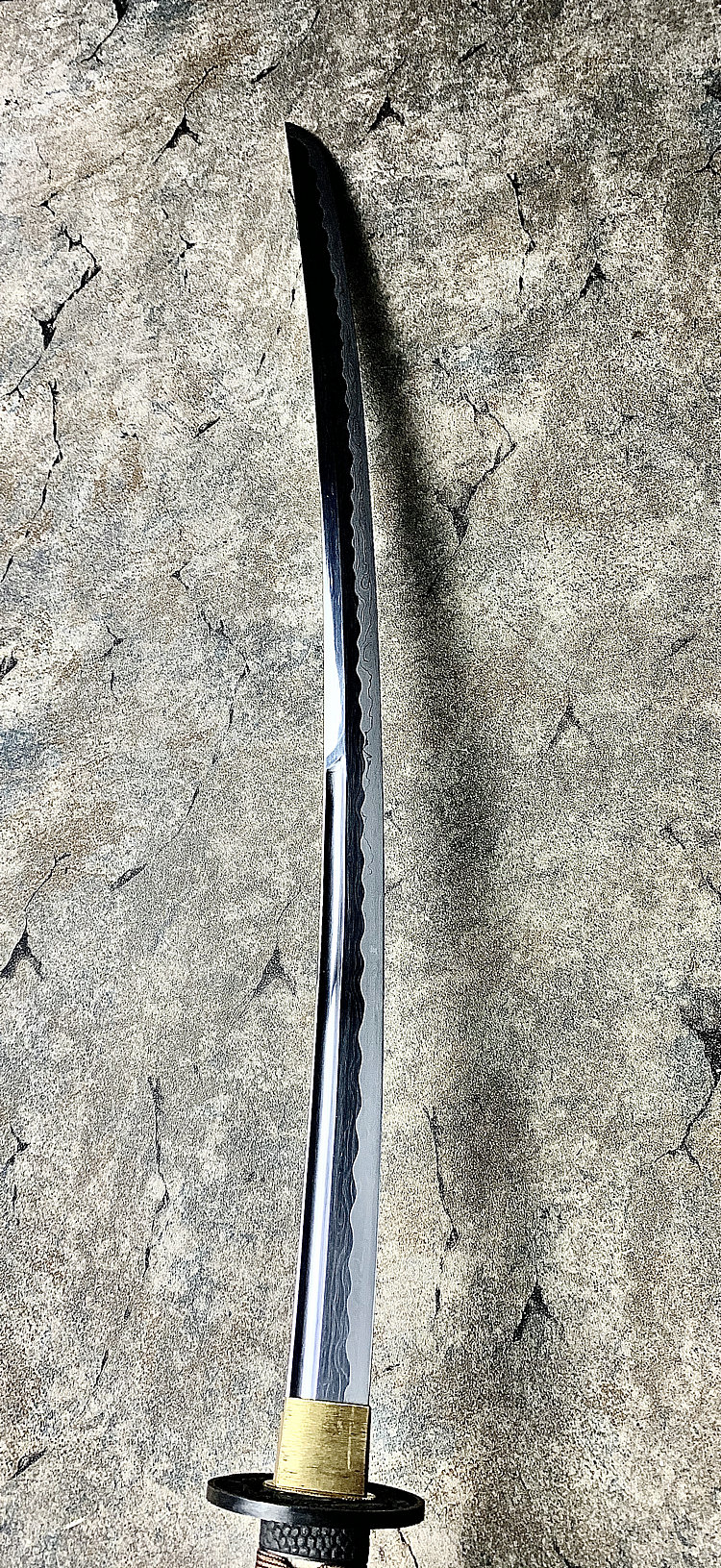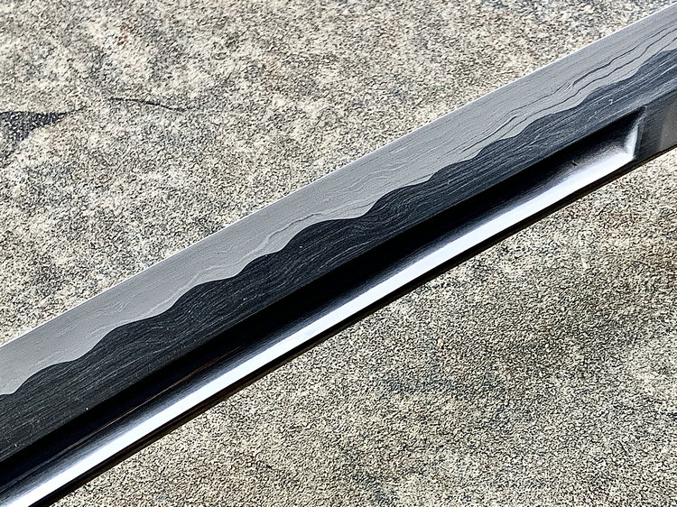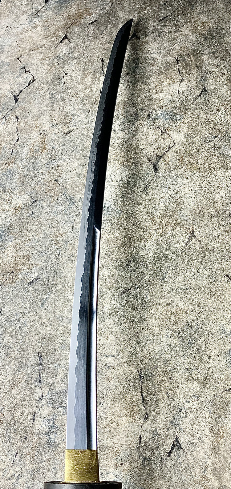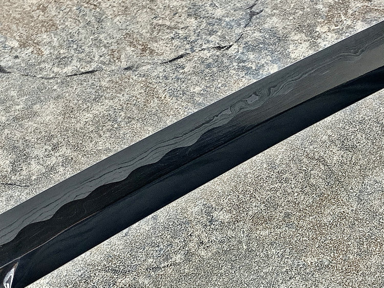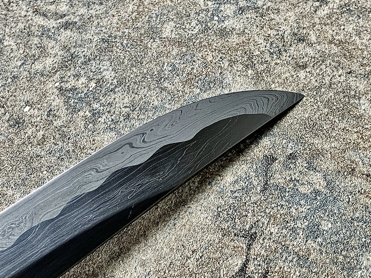 薙首造 刀型凶悍强壮 无横手,刀姿雄壮,大马士革性能卓越,覆土烧刃手工研磨,地肌漂亮,刃纹规整,刀鞘为栗型&瓢箪型鞘,鞘型独特优雅,双色黑梨子地!装具为龙鱼装!