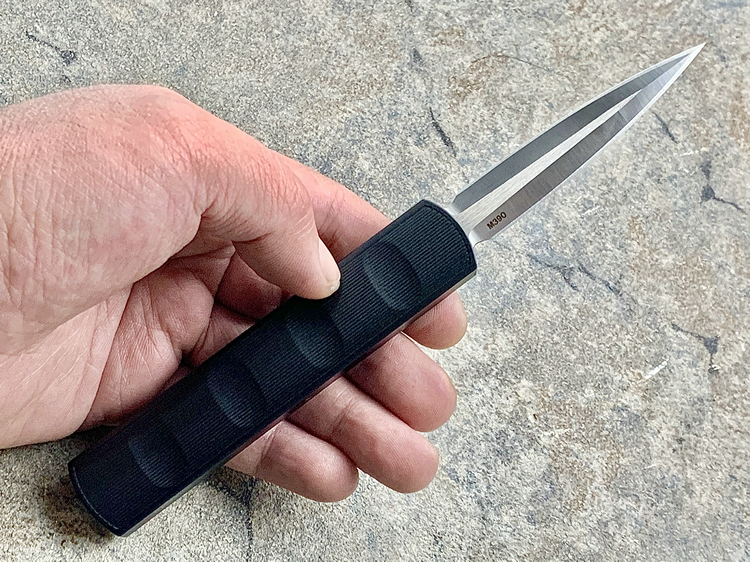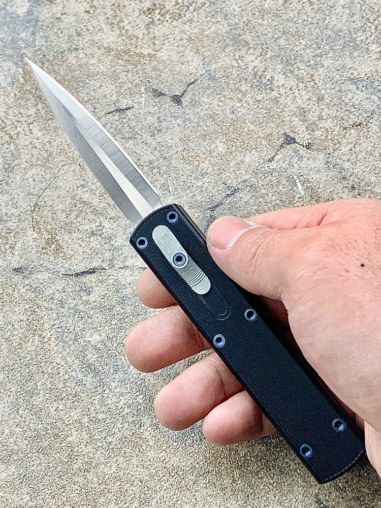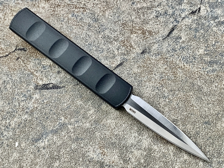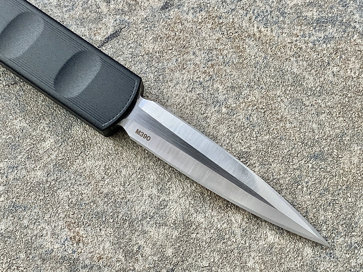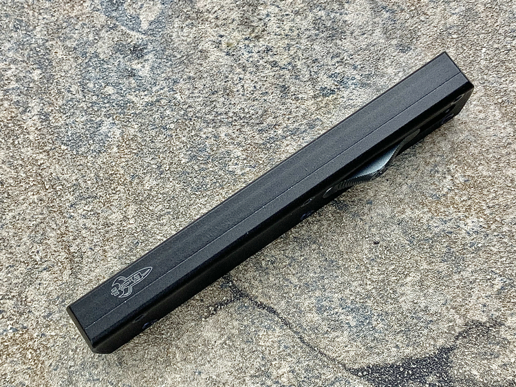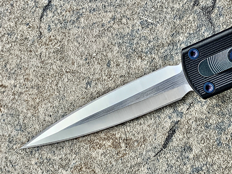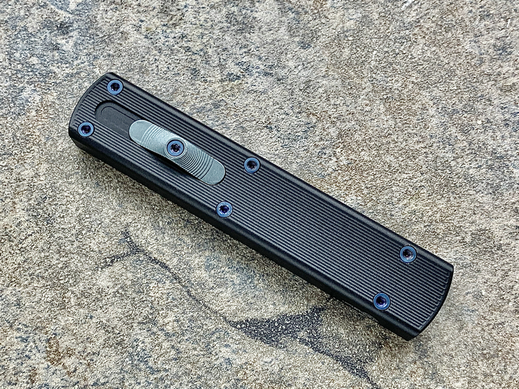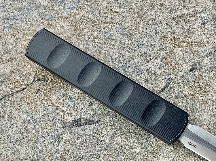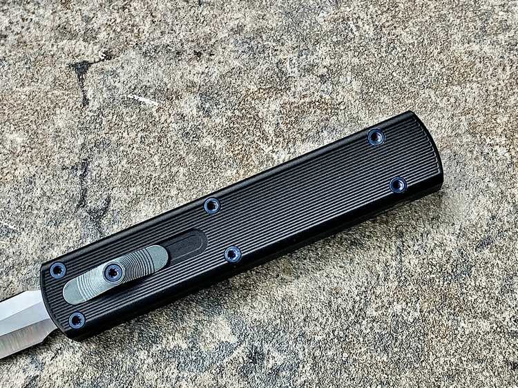 全长:175mm 刃长:71mm 刃厚:2.5mm 刃宽:14.5mm 刃材:M390 硬度:61HRC 柄材:铝合金 闭合:102.5mm 重量:61g产地:美国D Rocket Design火箭设计是一位工程师,作家以及创造者,从1995年开始便开始收集各类素材和知识只做了一款刀,D Rocket Design的设计保持了极简以及便携以及Balance(平衡) and Zen(禅宗)的思维为定位。1997年获得了Oregon Knife Show刀展的最佳新人奖,直到目前作者依然在学习3D打印失蜡浇铸等传统以及更为先进的处理方式用在产品上,以保证产品更具创新。这款产品为”Zulu Spear“非常时尚简约的直跳,用作者的话来说,这个产品没有任何多余的设计和优雅的设计。属于一款半定制的MidTech,刃长71mm并采用M390钢材,形状为祖鲁矛。手柄独特的纹理以利于更好的操控,手柄配色可称为艳绝。黑色铝合金手柄深蓝色螺钉浅蓝色推钮层次感丰富,尤其推钮的颜色为点睛之笔。这款和日常的直跳没有区别。此款产品的稳定性与同等尺寸的微技术相比更加优秀。