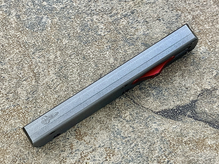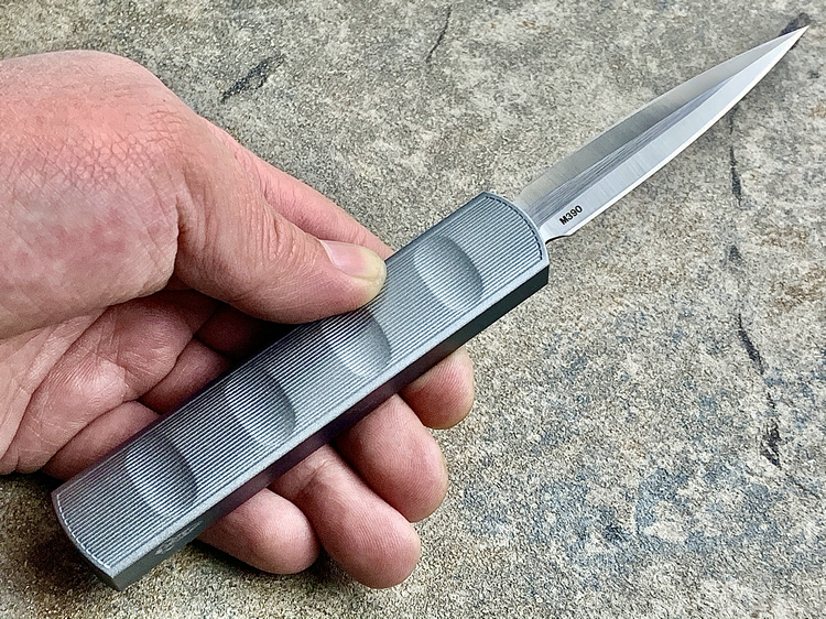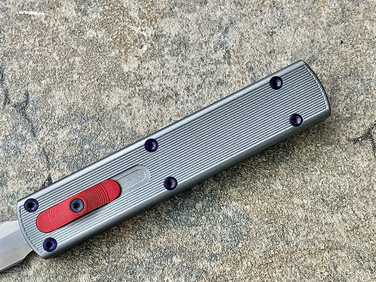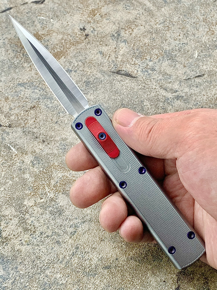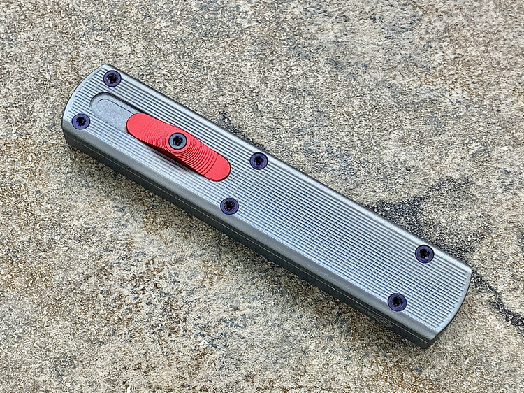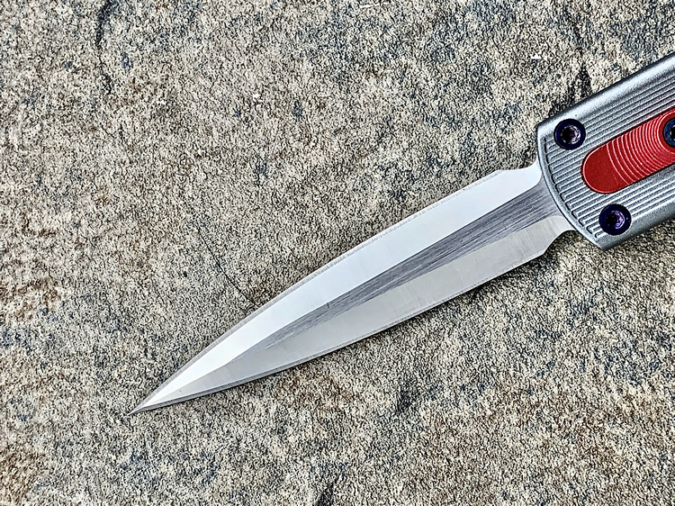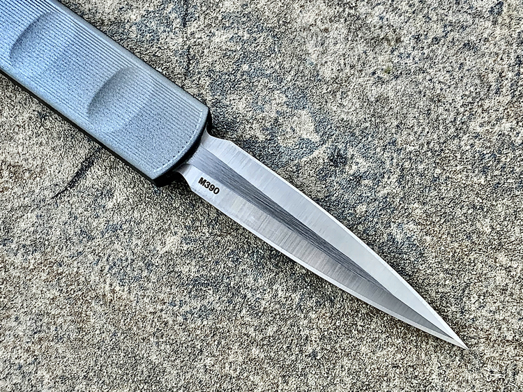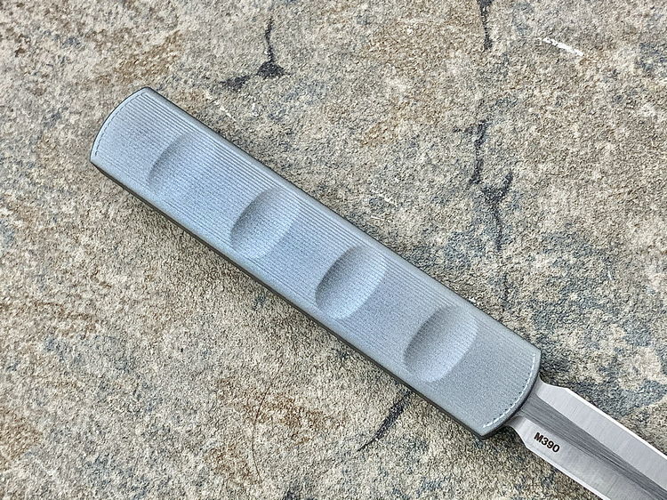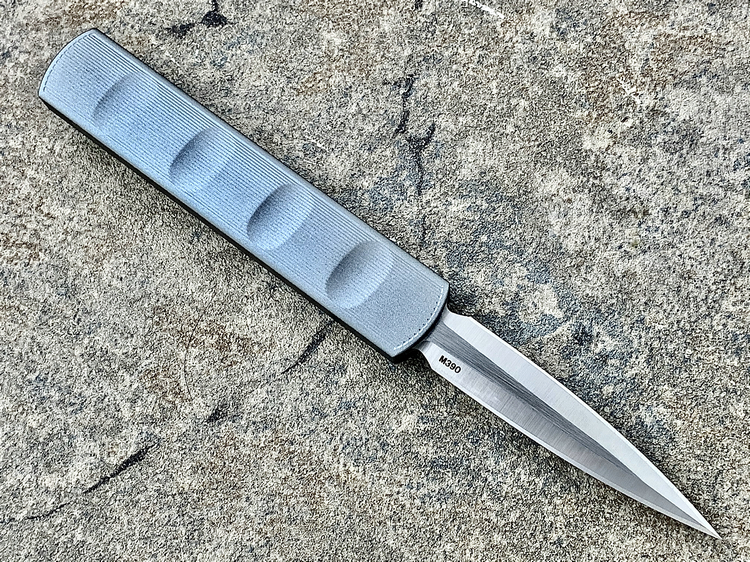 全长:175mm 刃长:71mm 刃厚:2.5mm 刃宽:14.5mm 刃材:M390 硬度:61HRC 柄材:铝合金 闭合:102.5mm 重量:61g产地:美国D Rocket Design火箭设计是一位工程师,作家以及创造者,从1995年开始便开始收集各类素材和知识只做了一款刀,D Rocket Design的设计保持了极简以及便携以及Balance(平衡) and Zen(禅宗)的思维为定位。1997年获得了Oregon Knife Show刀展的最佳新人奖,直到目前作者依然在学习3D打印失蜡浇铸等传统以及更为先进的处理方式用在产品上,以保证产品更具创新。这款产品为”Zulu Spear“非常时尚简约的直跳,用作者的话来说,这个产品没有任何多余的设计和优雅的设计。属于一款半定制的MidTech,刃长71mm并采用M390钢材,形状为祖鲁矛。手柄独特的纹理以利于更好的操控,手柄配色可称为艳绝。灰色铝合金手柄深蓝色螺钉红色推钮层次感丰富,尤其推钮的颜色为点睛之笔。这款和日常的直跳没有区别。此款产品的稳定性与同等尺寸的微技术相比更加优秀。