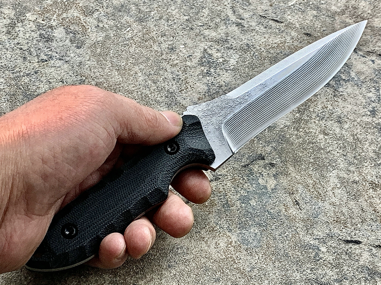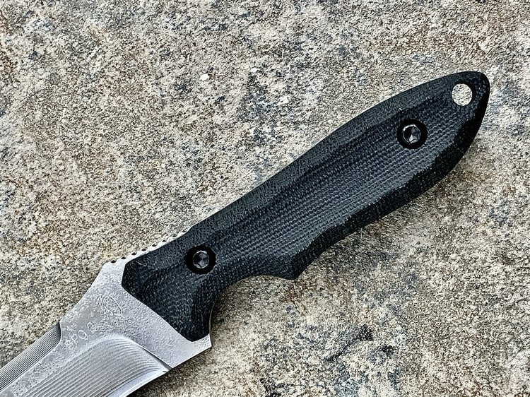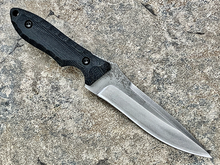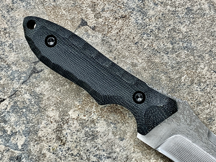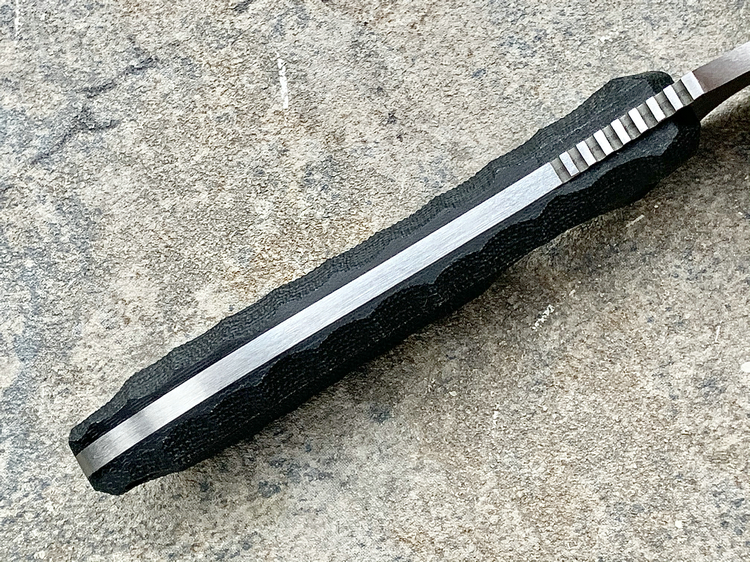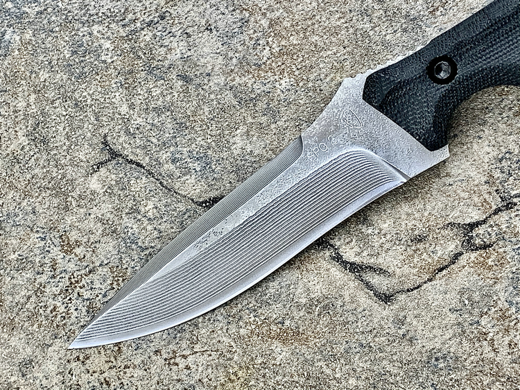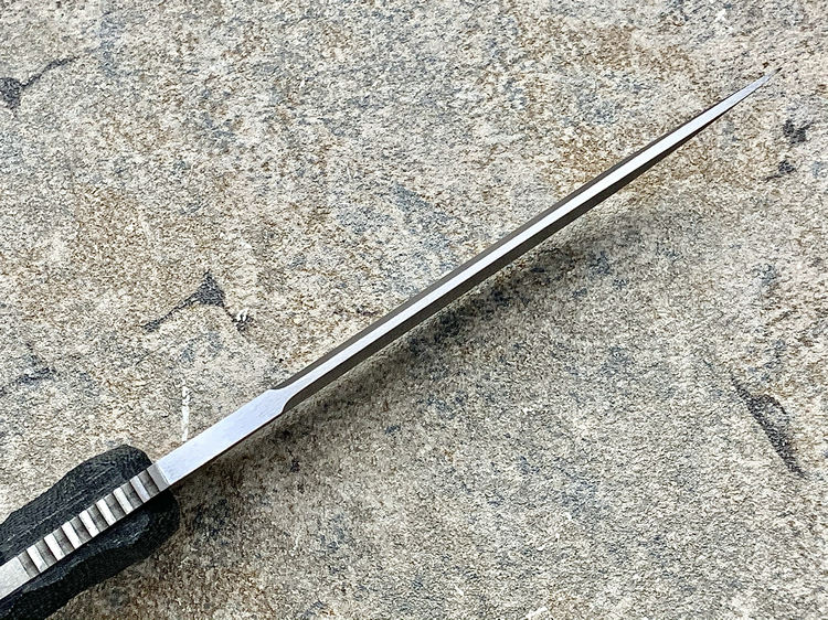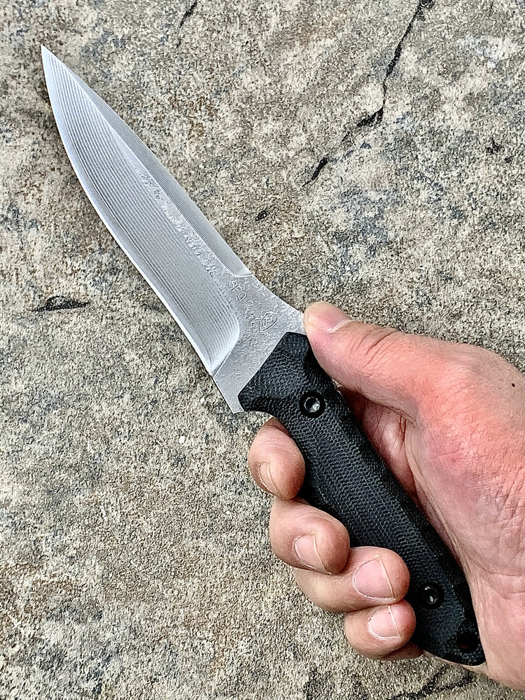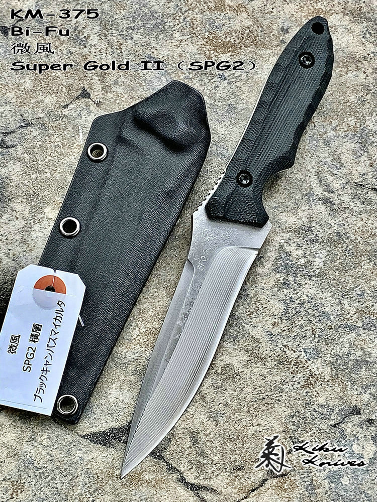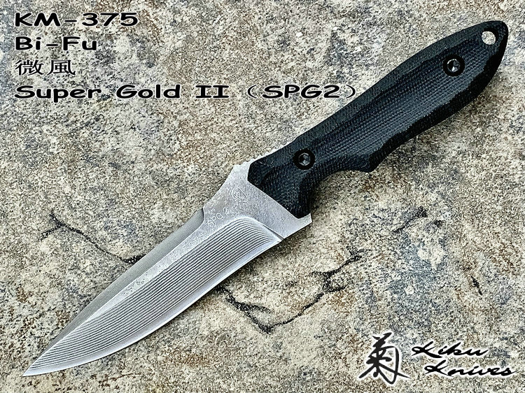 类 型: 直刀全 长: 225mm刃 长: 111mm刃 材: SPGII超级黄金大马士革刃材硬 度: 62HRC刃 厚: 4mm柄 材:米卡塔重 量:157g产 地: 日本刀身使用日本武生特殊钢公司研制开发的改良型粉末高速不锈钢工具钢——SPG2锻造,钢材的出色性能和菊男出色的打磨相映成辉。这款直刀采用层锻式手法锻造,刀身呈现均匀的层叠纹路。刀身采用平磨手法处理,锋利度和切削手感上佳。刀头部分呈现针尖样式,再配上刀背前端可帮助分开肌肉的狭长假刃,让刀具的穿刺能力也同样出色。这款作品刀身表面并没有采用菊男惯用的蚀刻花纹处理,而是进行表面微蚀刻使其呈现海浪纹路。