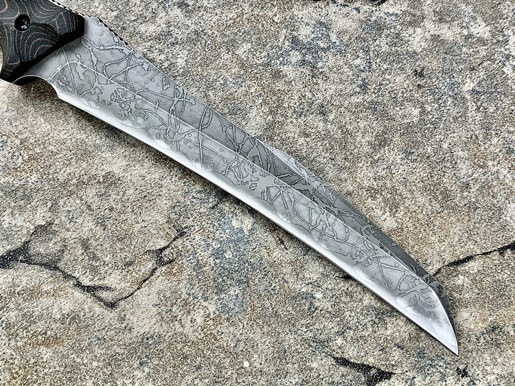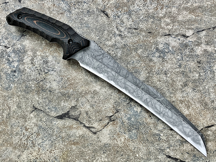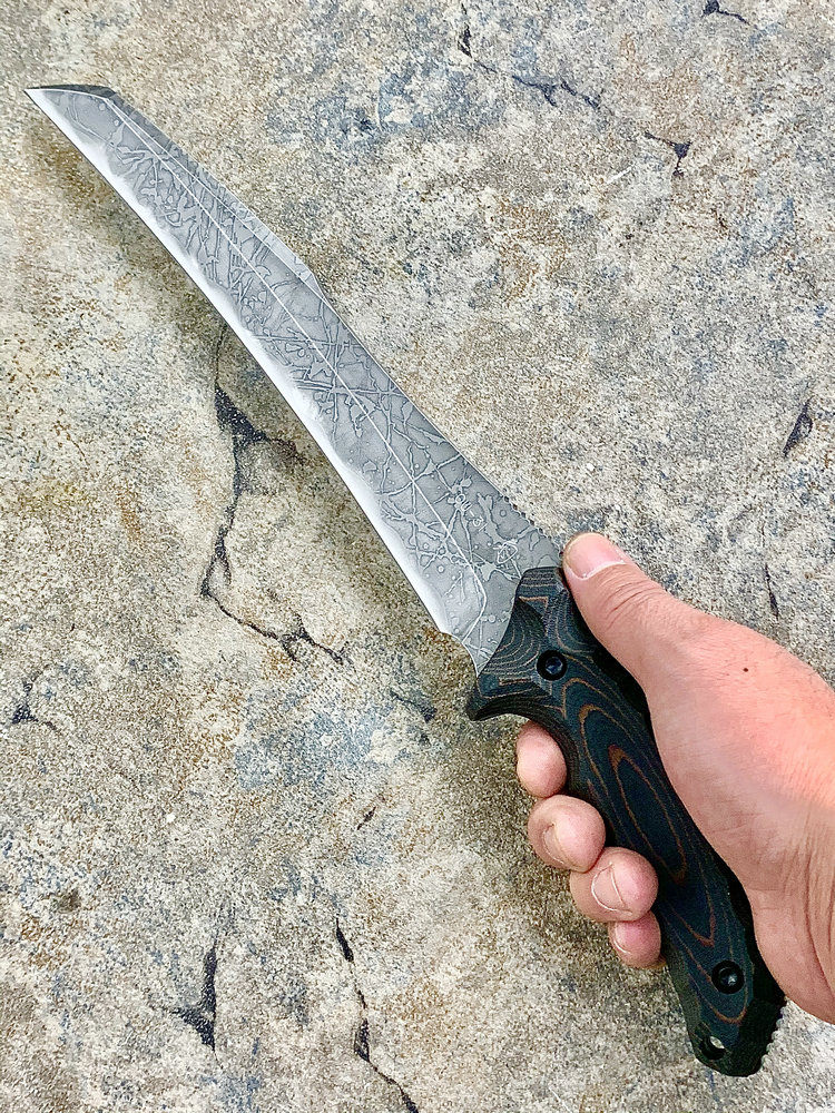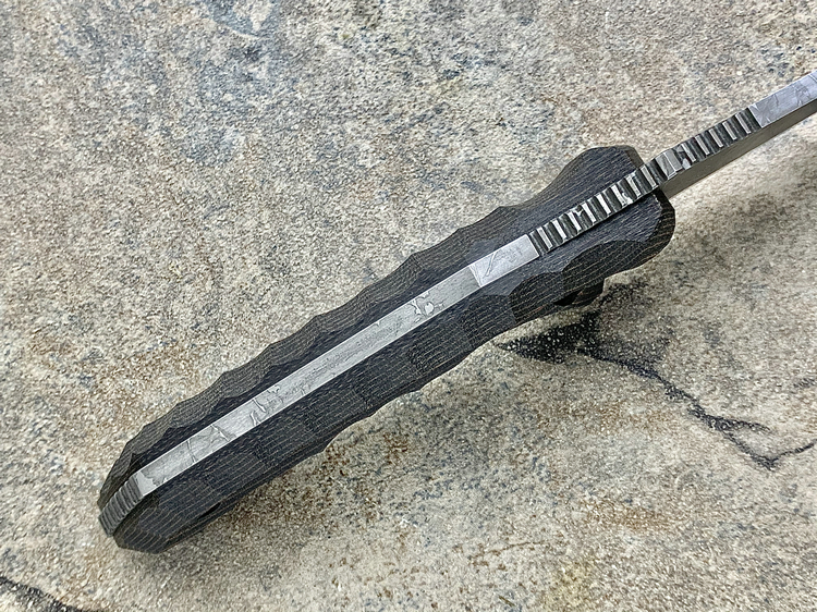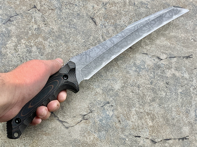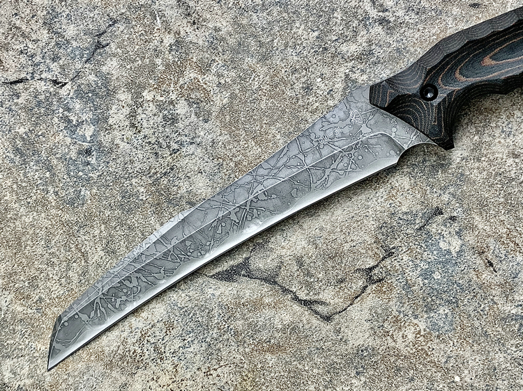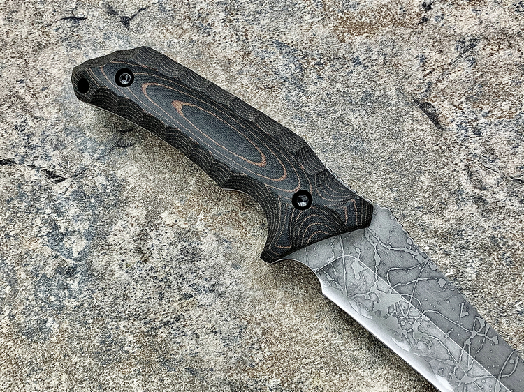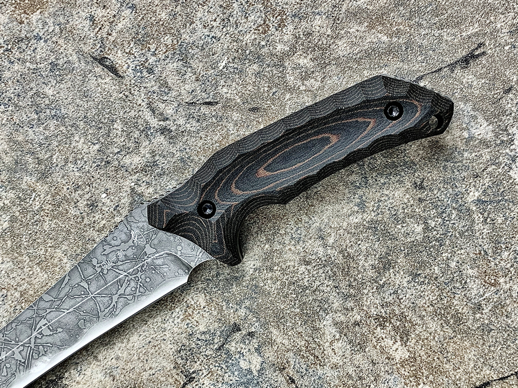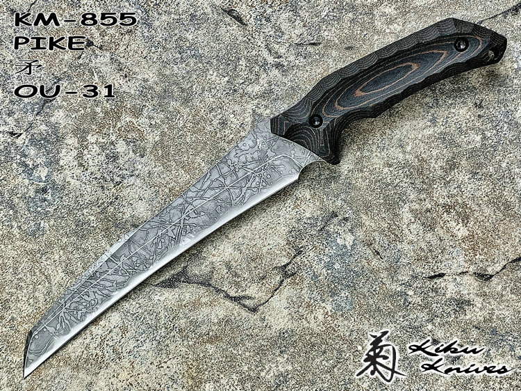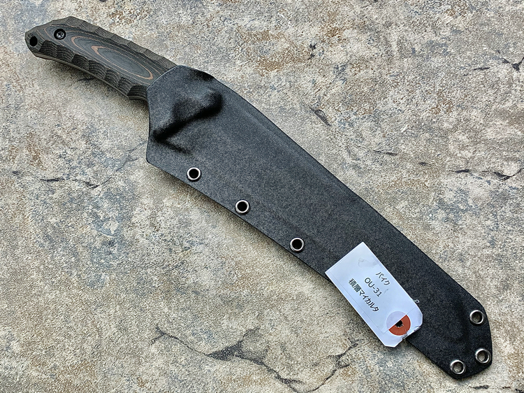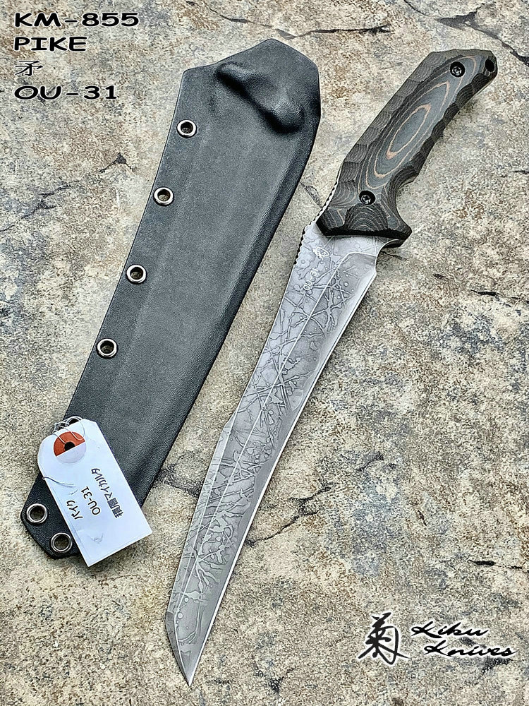 类 型: 直刀全 长: 345mm刃 长: 209mm刃 材: OU-31硬 度: 62HRC刃 厚: 5mm柄 材:米卡塔重 量:339g产 地: 日本PIKE是一把外观非常具有侵略性的直刀。 刀型采用的是日式的Kiridashi刀尖设计,刀尖向下垂落,尖锐而又坚固。 在刀身表面,松田菊男会对刀片进行特殊的工艺处理,也就是我们见到的战术花纹,这种工艺能够防止眩光,耐腐蚀,也能对刀片进行表面保护。 刀身采用平磨研磨处理。 刀背上有一条长长的假刃,降低了穿刺时的阻力。 手柄采用黑红双色米卡塔贴片制成,手柄表面被刻深凹的刻槽纹理,能让抓握更牢固。 刀根处刻有“菊”字标识和OU-31钢的标识。 一体式全龙骨结构,使刀的性能更坚固稳健。 刀背上的滚花凹槽能增强使用时的牵引力,让使用者对切削角度的掌控更精准。 BR>