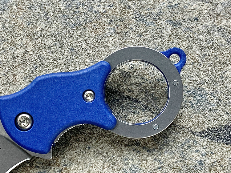在手柄的刀背上,有帮助拇指按压的指槽与滚花凹槽。 在手柄内侧,也有帮助手指抓握的带有锯齿的指槽。 手柄里的指槽与尾环形成了一个反向的S形,抓握起来舒适度更高。 在尾环的最底端,凸出的是手柄贴片制成的伞绳孔。