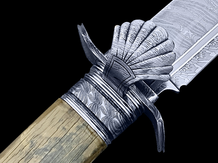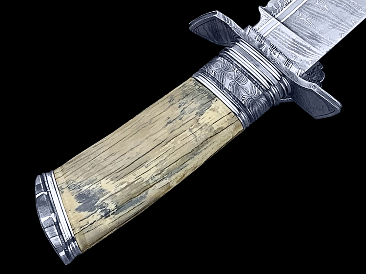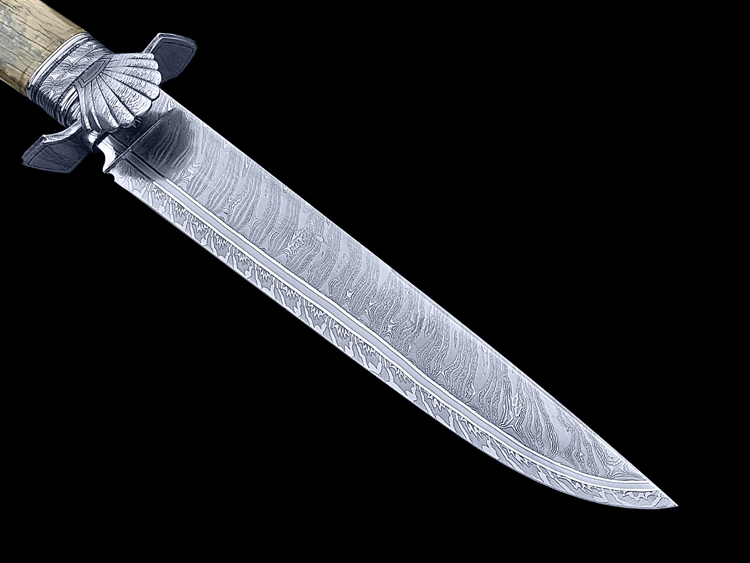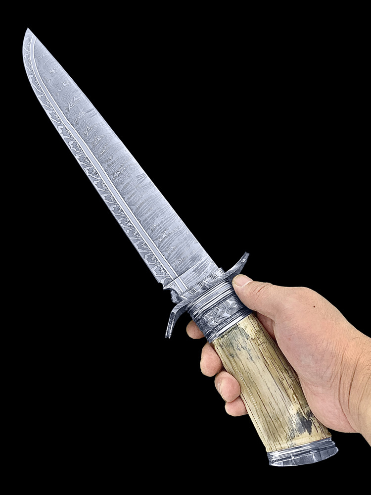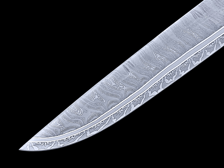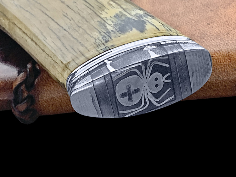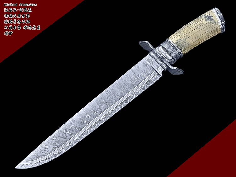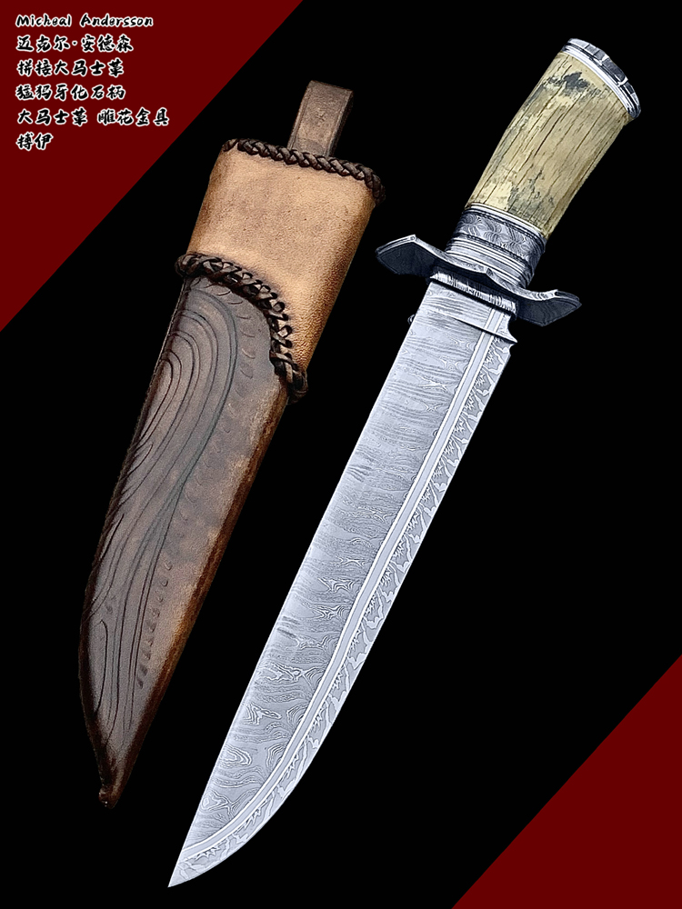 全长:420mm 刃长:261mm 刃宽:43mm 刃厚:4mm 刃材:手工大马士革 硬度:61-62HRC 柄材:大马士革雕花+猛犸牙化石 重量:568g 含鞘767g护手及尾铁:手工大马士革 尾铁蜘蛛图案北欧三杰之一——瑞典顶级刀匠迈克尔 安德森(安德鲁安德森之父,已临近退休)的大马士革猎刀,刀刃采用纯手工锻打(迈克自己锻造,很多北欧刀匠买的现成刀条)三段式大马士革锻打拼接而成,刀柄采用蓝绿猛犸牙贴片,尺寸精道,更配有迈克独有的高端刀鞘,迈克尔安德森尤其喜欢以北欧女神罗斯LOLTH的蜘蛛形象作为自己刀子的图腾,整把刀制作复杂,难度很高。 很多人提到北欧刀,第一想到斯堪刃,第二想到繁琐的拼接大马。由于外观华丽又具有独特风格,如今国内刀匠10个有8个都在做一些北欧形制的小刀,然而我看下来,差距还是很大,我来说说为什么。 首先,除了基本功方面,比如大马锻造(大都是瑞粉大马或者北欧刀条拿来用,几乎没人自锻刀条),自锻刀条的纹路往往决定了这把刀你要表达的整体性,这一点很多刀匠不做考量。 而除了加工的完工度和技艺差距以外。要做好北欧刀,有两个要素很正要——1,整体性,即到底这把刀要表达的风格和刀身的所有细节,形制,装饰,配色,是否搭配,而不是一堆华丽的材料东拼西揍。2,了解北欧文化,北欧三杰,安德森父子也好,罗杰也好,非常注重北欧传统文化里面图腾的概念,无论是神灵(比如蜘蛛,北欧海妖,各种扭转纹装饰)而这些在刀身和刀鞘上需要强烈表现的东西,国内基本是无视的态度,这一点是态度和认真程度上的差距,至少读一读维京海盗,北欧神话这方面的文献和图片,看看北欧地区的一些民族装饰,古刀剑的配饰,这些工作很重要,目前的很多作品也就是常说的“形似而神不似”,希望国内刀匠能在这方面再做更多的思考和改进,而不要急功近利的拼凑一把没有文化底蕴和整体性的工艺刀。