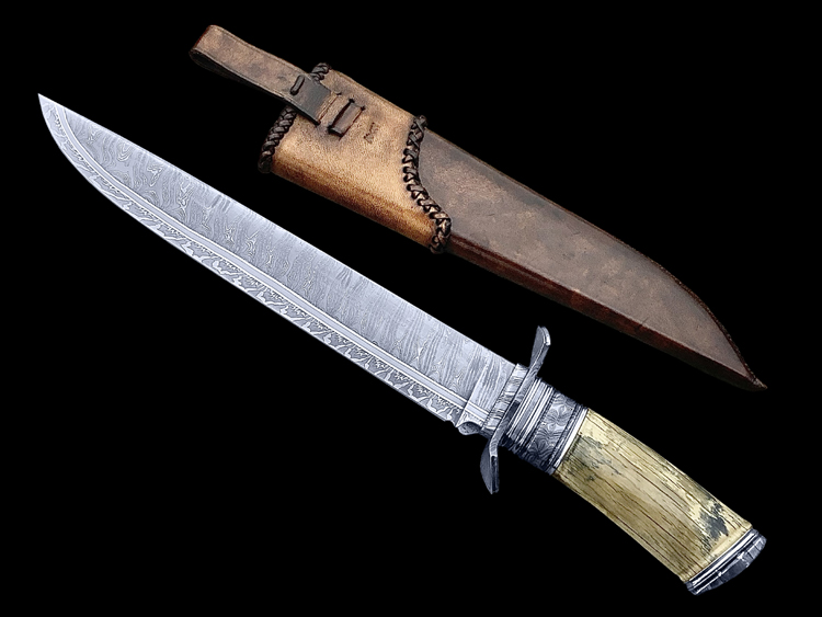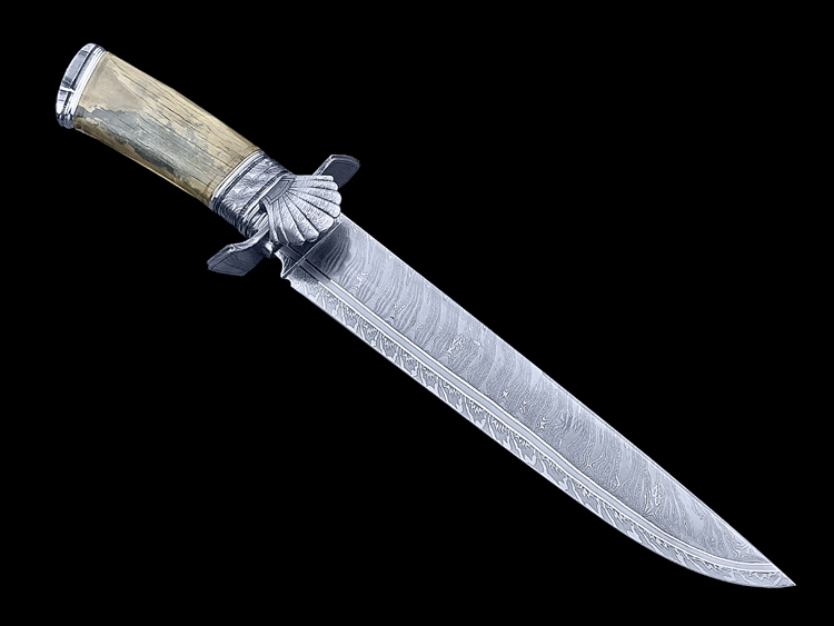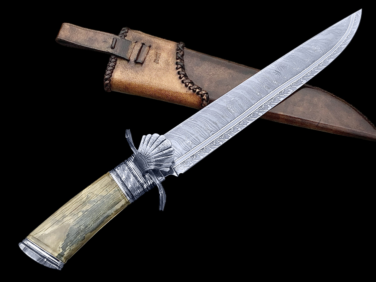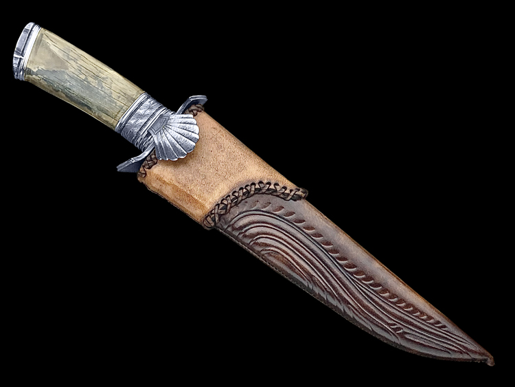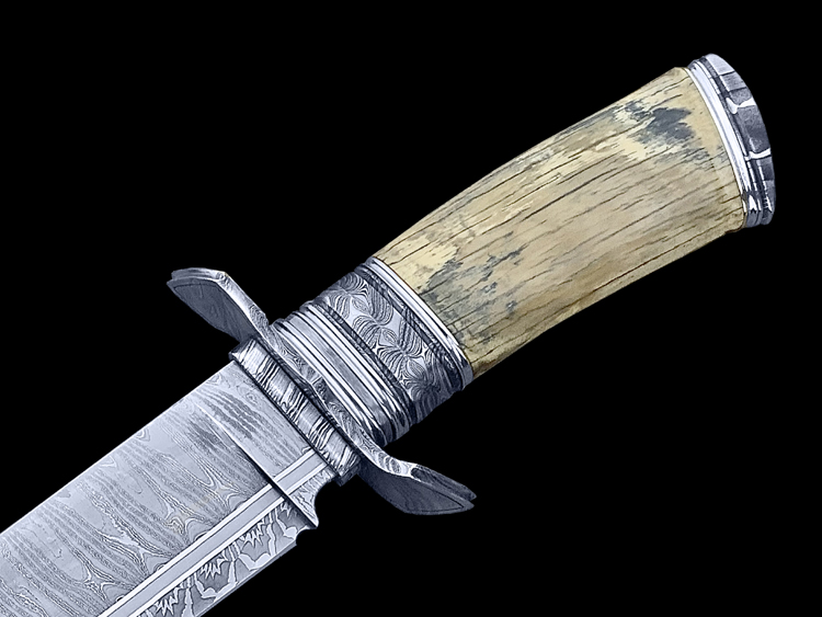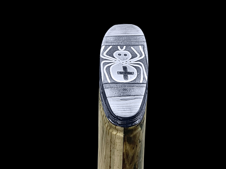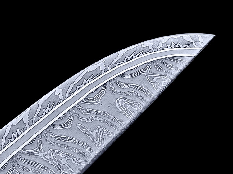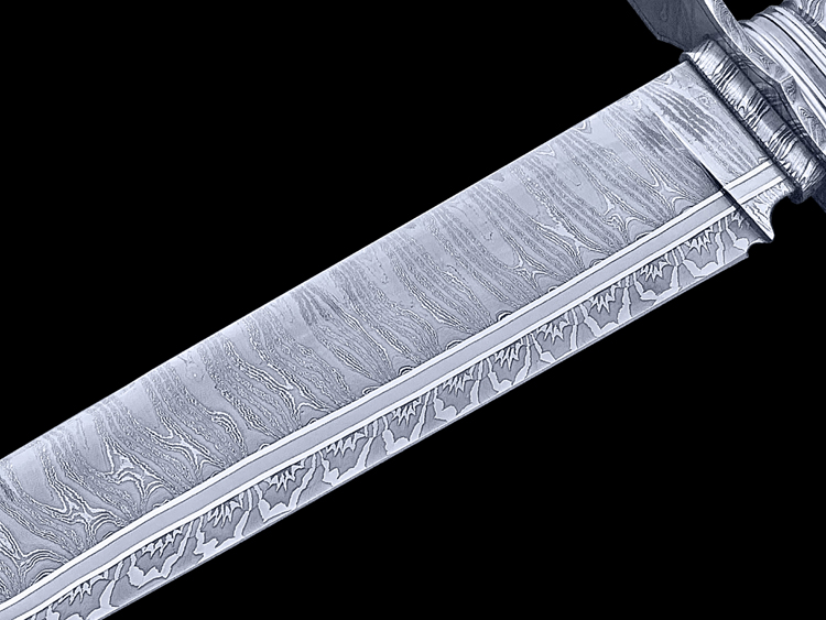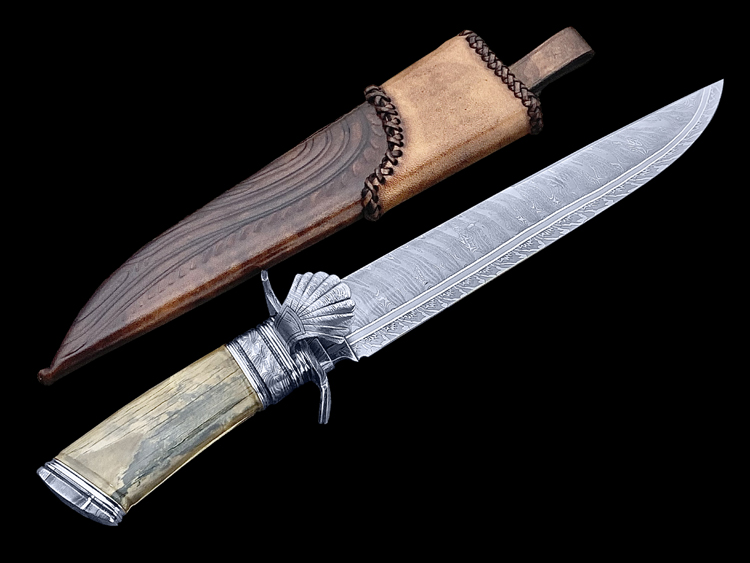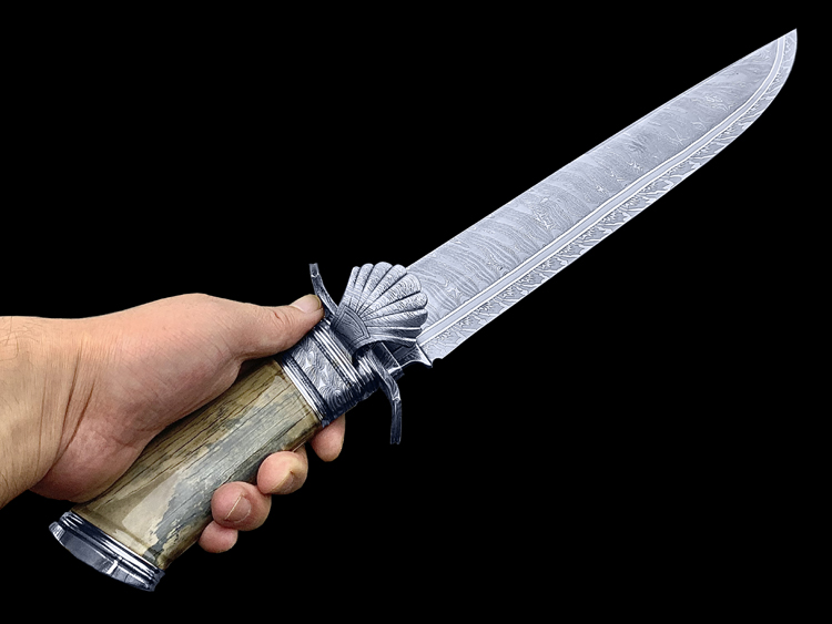 全长:420mm 刃长:261mm 刃宽:43mm 刃厚:4mm 刃材:手工大马士革 硬度:61-62HRC 柄材:大马士革雕花+猛犸牙化石 重量:568g 含鞘767g护手及尾铁:手工大马士革 尾铁蜘蛛图案北欧三杰之一——瑞典顶级刀匠迈克尔 安德森(安德鲁安德森之父,已临近退休)的大马士革猎刀,刀刃采用纯手工锻打(迈克自己锻造,很多北欧刀匠买的现成刀条)三段式大马士革锻打拼接而成,刀柄采用蓝绿猛犸牙贴片,尺寸精道,更配有迈克独有的高端刀鞘,迈克尔安德森尤其喜欢以北欧女神罗斯LOLTH的蜘蛛形象作为自己刀子的图腾,整把刀制作复杂,难度很高。 很多人提到北欧刀,第一想到斯堪刃,第二想到繁琐的拼接大马。由于外观华丽又具有独特风格,如今国内刀匠10个有8个都在做一些北欧形制的小刀,然而我看下来,差距还是很大,我来说说为什么。 首先,除了基本功方面,比如大马锻造(大都是瑞粉大马或者北欧刀条拿来用,几乎没人自锻刀条),自锻刀条的纹路往往决定了这把刀你要表达的整体性,这一点很多刀匠不做考量。 而除了加工的完工度和技艺差距以外。要做好北欧刀,有两个要素很正要——1,整体性,即到底这把刀要表达的风格和刀身的所有细节,形制,装饰,配色,是否搭配,而不是一堆华丽的材料东拼西揍。2,了解北欧文化,北欧三杰,安德森父子也好,罗杰也好,非常注重北欧传统文化里面图腾的概念,无论是神灵(比如蜘蛛,北欧海妖,各种扭转纹装饰)而这些在刀身和刀鞘上需要强烈表现的东西,国内基本是无视的态度,这一点是态度和认真程度上的差距,至少读一读维京海盗,北欧神话这方面的文献和图片,看看北欧地区的一些民族装饰,古刀剑的配饰,这些工作很重要,目前的很多作品也就是常说的“形似而神不似”,希望国内刀匠能在这方面再做更多的思考和改进,而不要急功近利的拼凑一把没有文化底蕴和整体性的工艺刀。