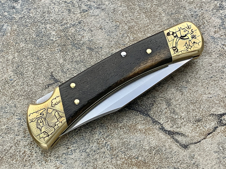 简单描述: BUCK 巴克 0110BRS 手工雕刻-埃及神话 Folding Hunter 黄铜刀枕实木柄 折叠猎人 百年经典110折刀