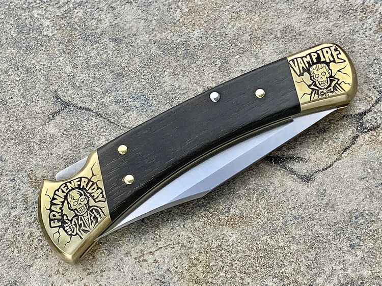 简单描述: BUCK 巴克 0110BRS 手工雕刻-屠杀嘉年华 Folding Hunter 黄铜刀枕实木柄 折叠猎人 百年经典110折刀