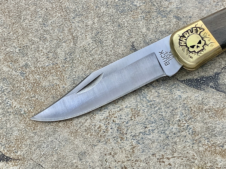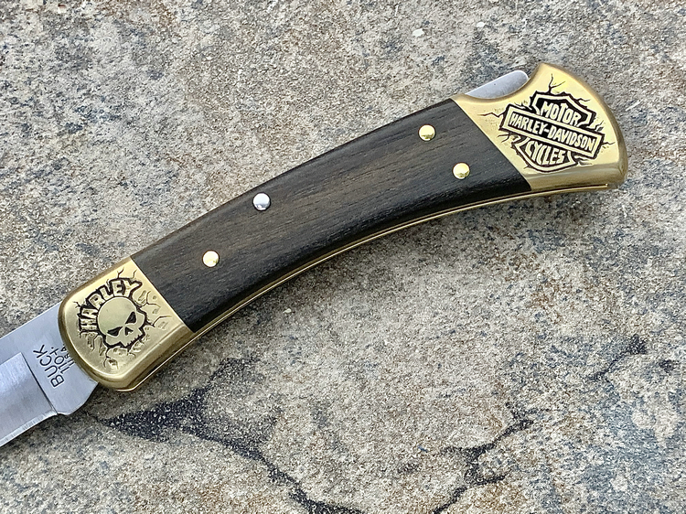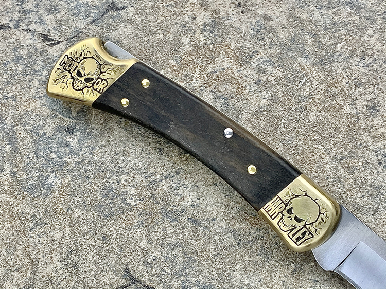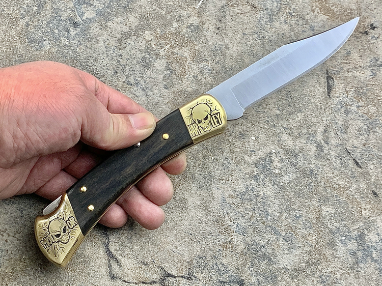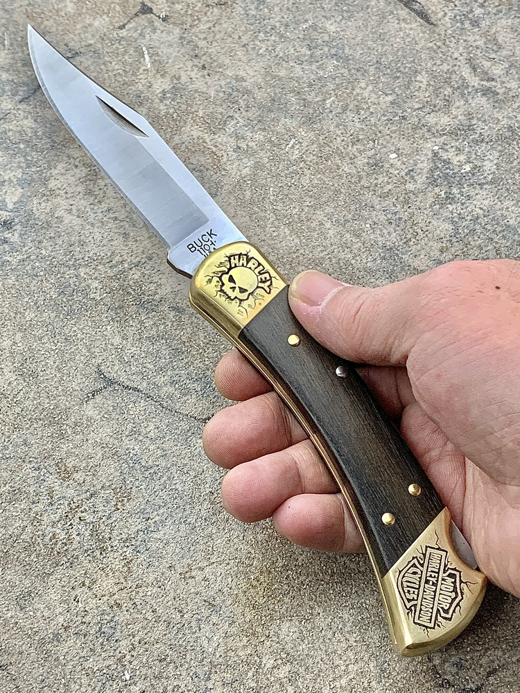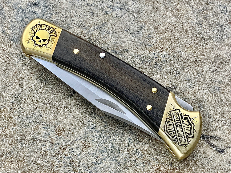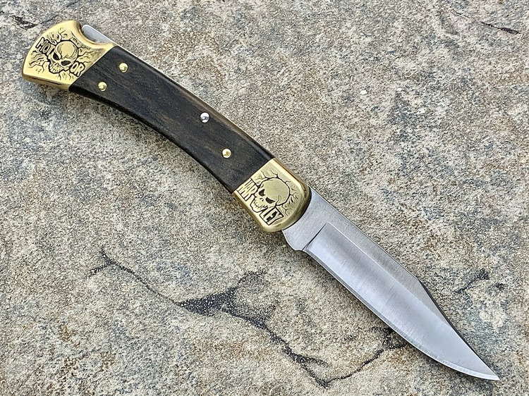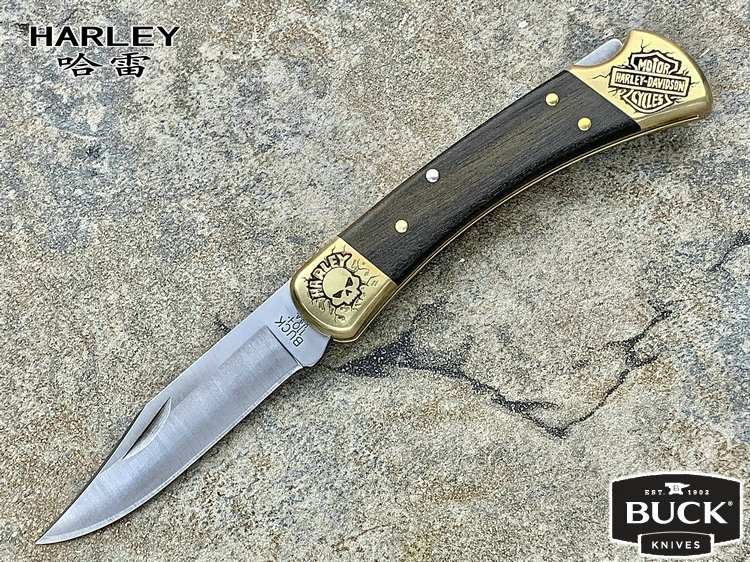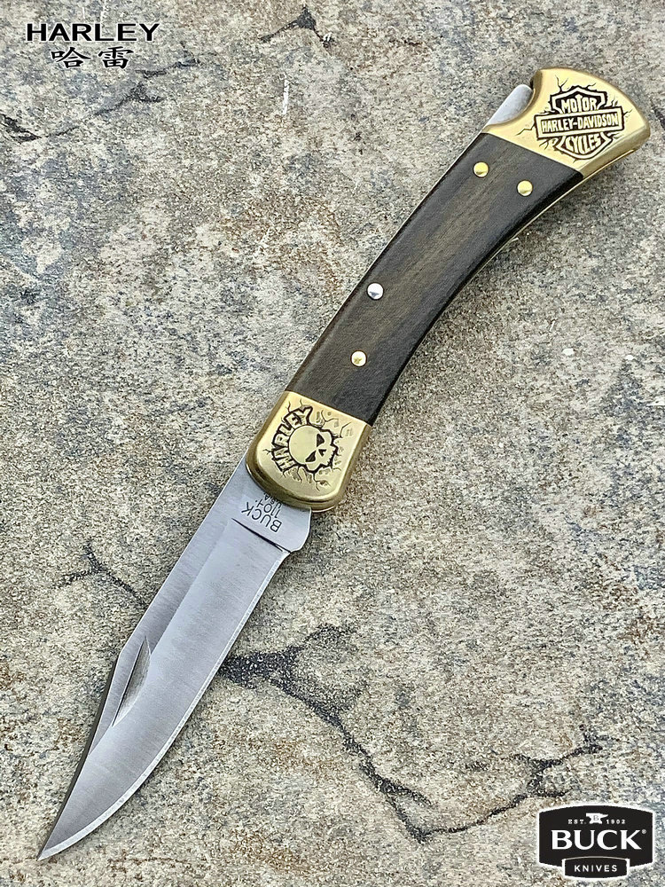 简单描述: BUCK 巴克 0110BRS 手工雕刻-哈雷 Folding Hunter 黄铜刀枕实木柄 折叠猎人 百年经典110折刀