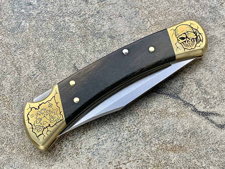 简单描述: BUCK 巴克 0110BRS 手工雕刻-海盗 Folding Hunter 黄铜刀枕实木柄 折叠猎人 百年经典110折刀