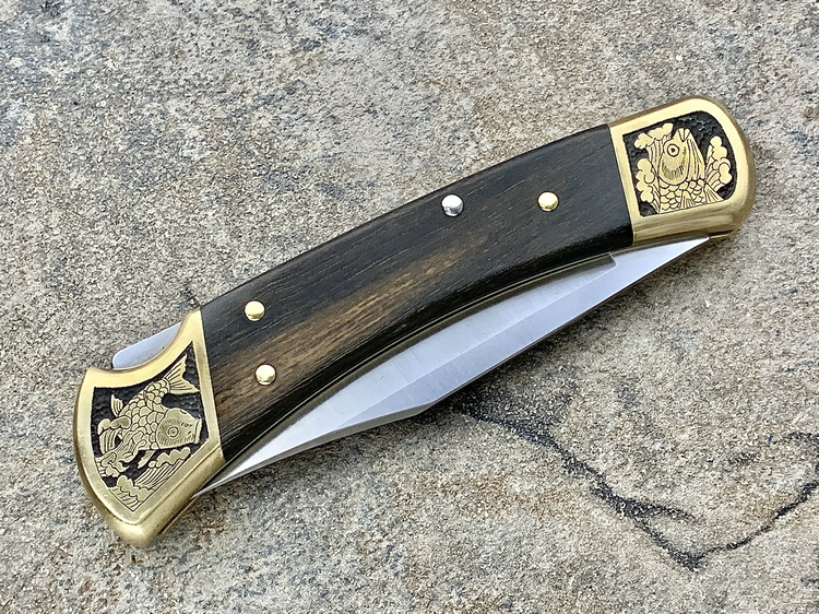 简单描述: BUCK 巴克 0110BRS 手工雕刻-锦鲤 Folding Hunter 黄铜刀枕实木柄 折叠猎人 百年经典110折刀