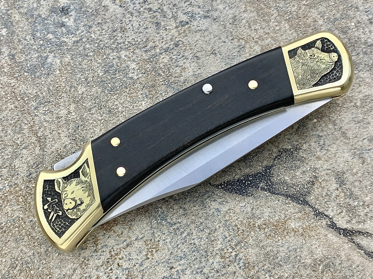 简单描述: BUCK 巴克 0110BRS 手工雕刻-十二生肖(猪) Folding Hunter 黄铜刀枕实木柄 折叠猎人 百年经典110折刀