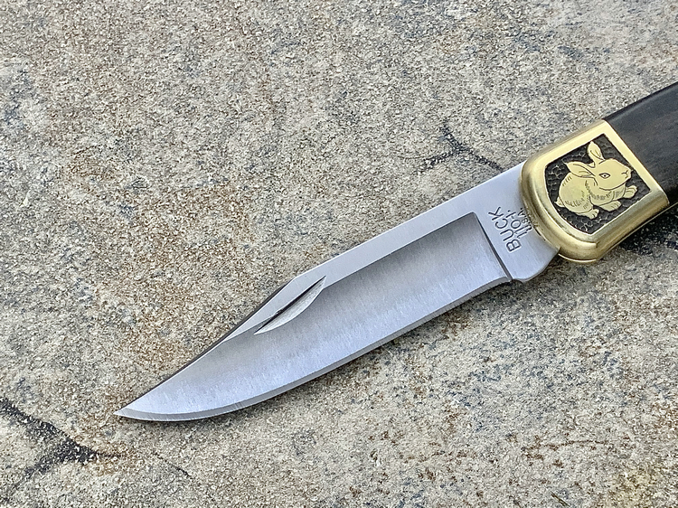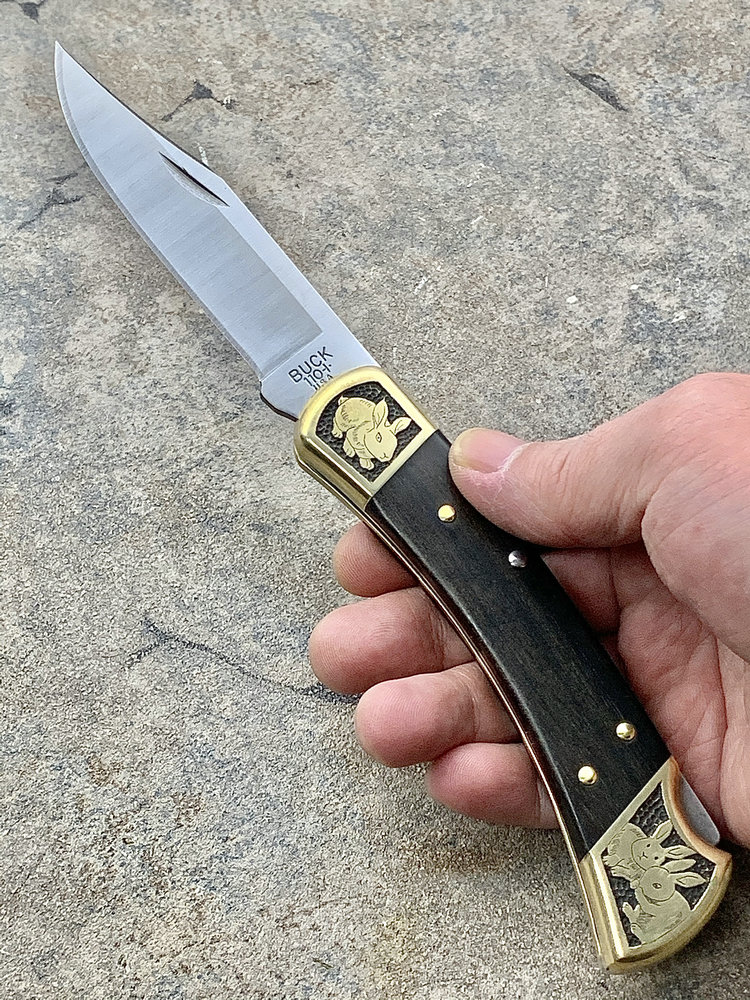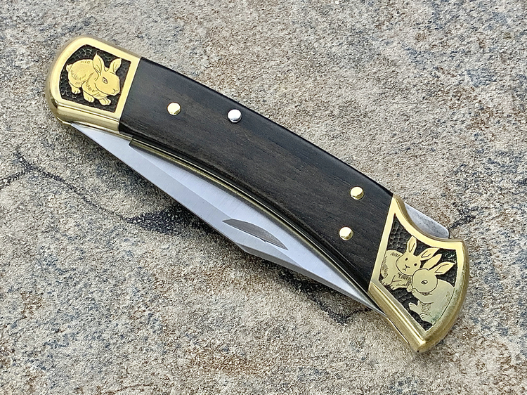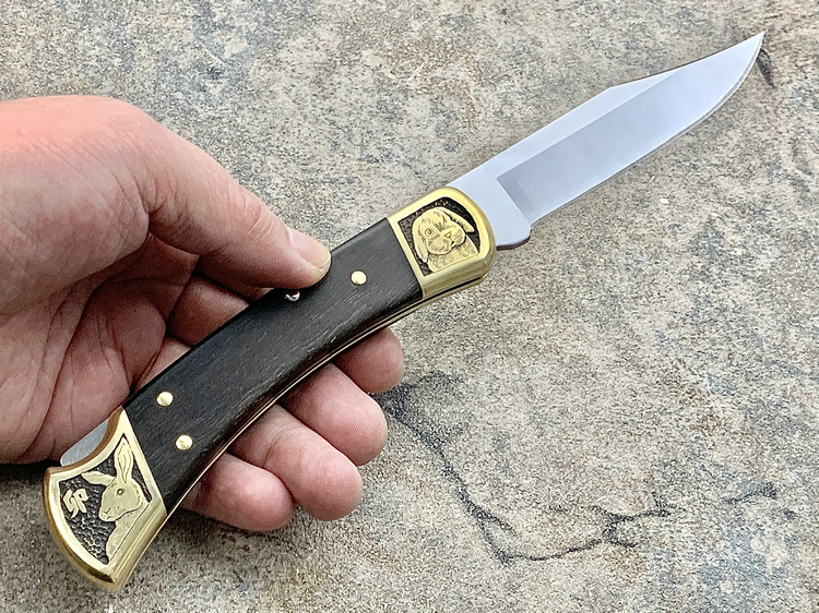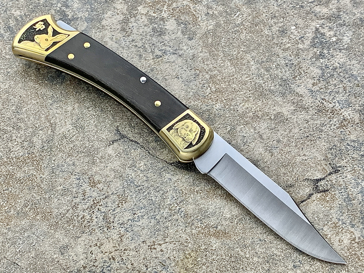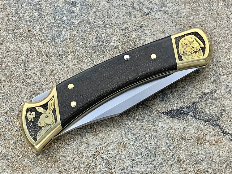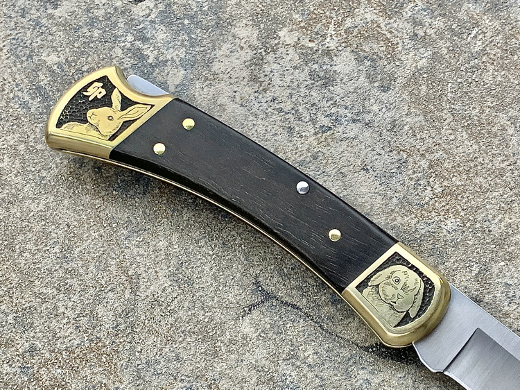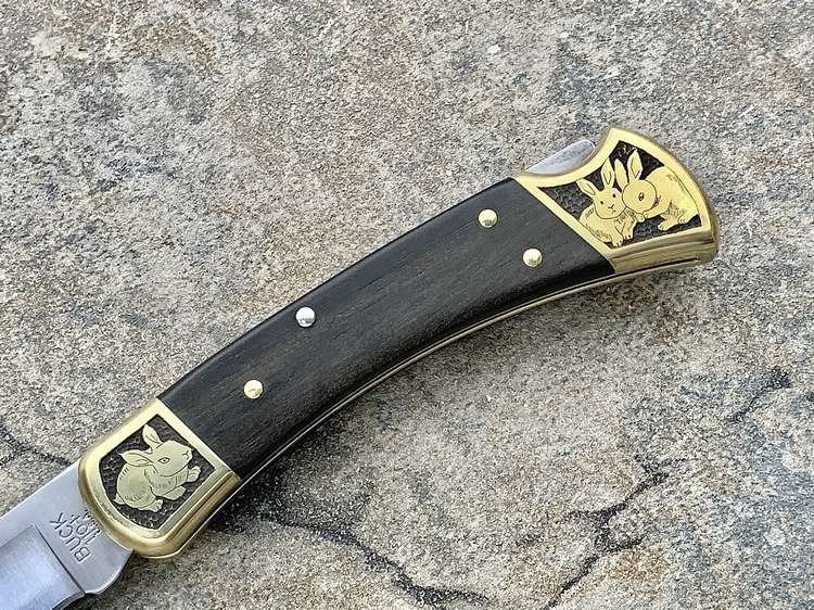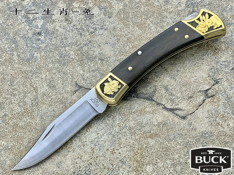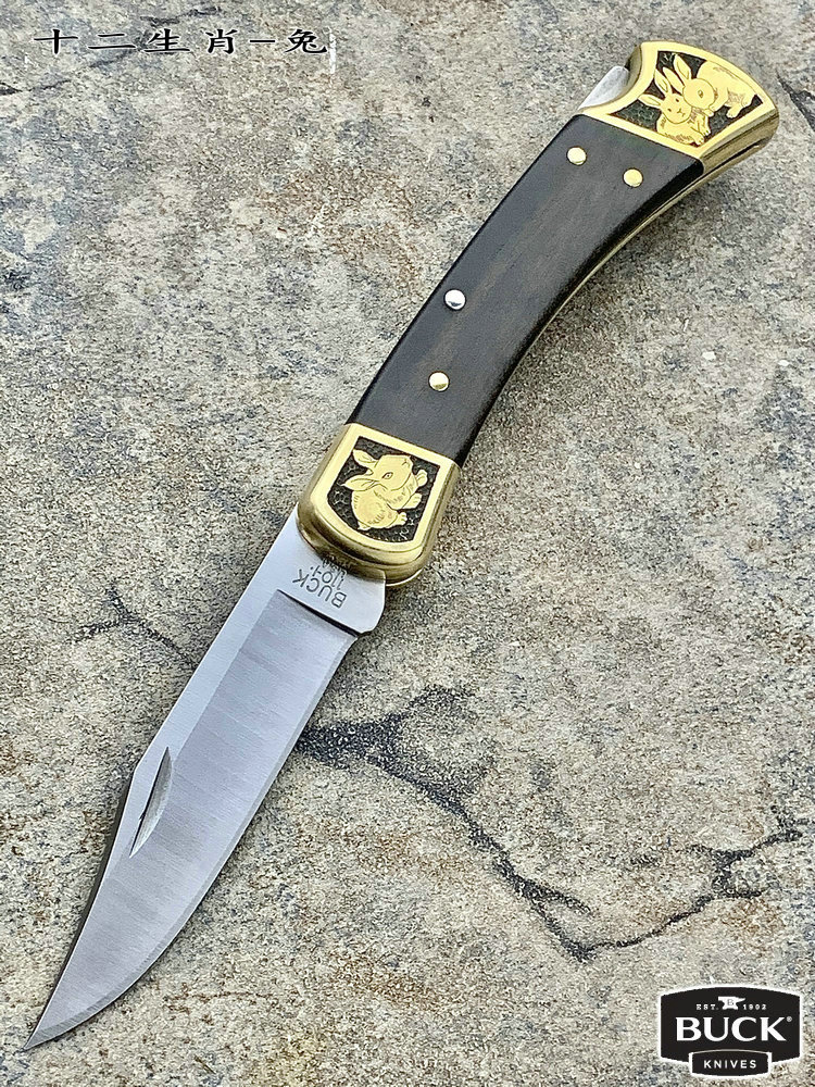 简单描述: BUCK 巴克 0110BRS 手工雕刻-十二生肖(兔) Folding Hunter 黄铜刀枕实木柄 折叠猎人 百年经典110折刀
