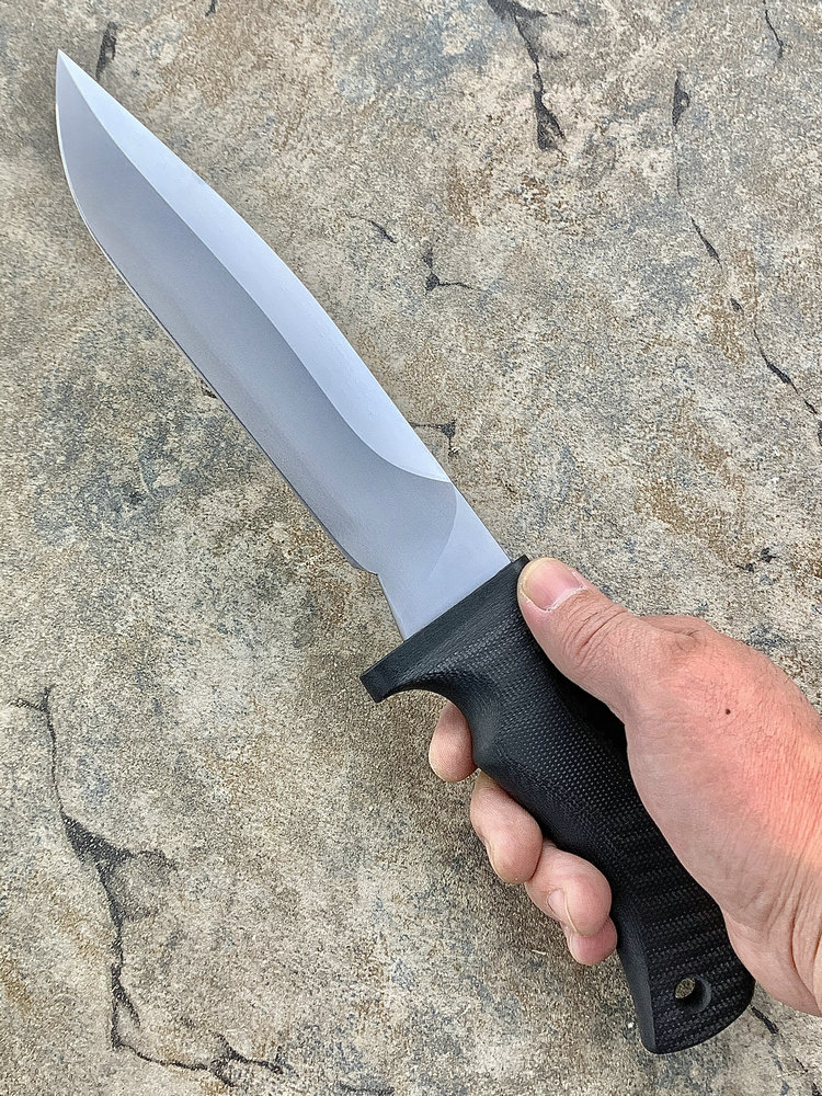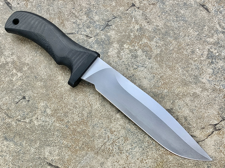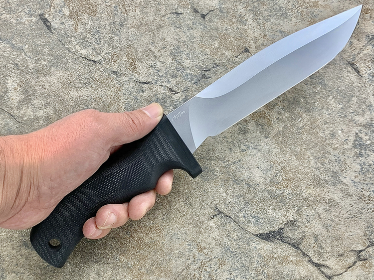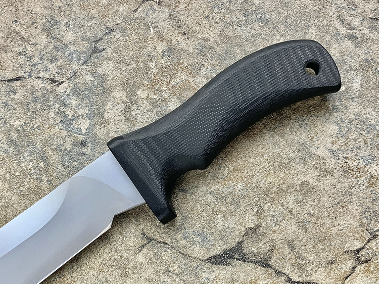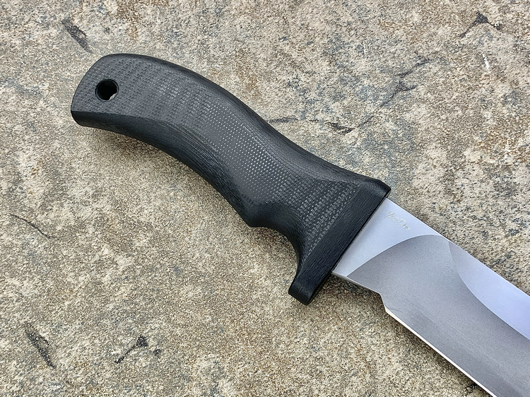 它的手柄符合人体工程学设计,把握极其舒适称手。食指凹槽让使用者即使看不见也能凭手感找到握刀的位置。材料使用特殊的玻璃纤维与环氧基树脂合成来做刀的握柄。此种特殊材质每一平方英寸可承受79000磅的压力(约3600公斤),可以轻易地承受0.45口径子弹的冲击。因此Mad Dog刀的握柄就算很严苛的使用也不会造成损害。此种握柄材质同时也提供了极好的绝缘,每0.001吋可承受1000伏特的电压,因而可以保护持刀者不会在使用刀具时遭受电击。另外这种握柄材质也几乎不受化学物质的渗透及侵蚀。