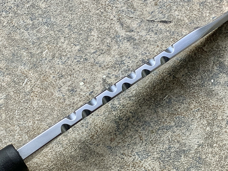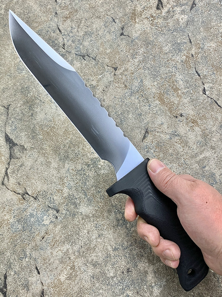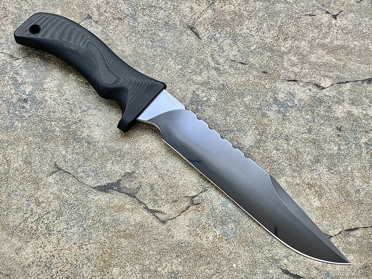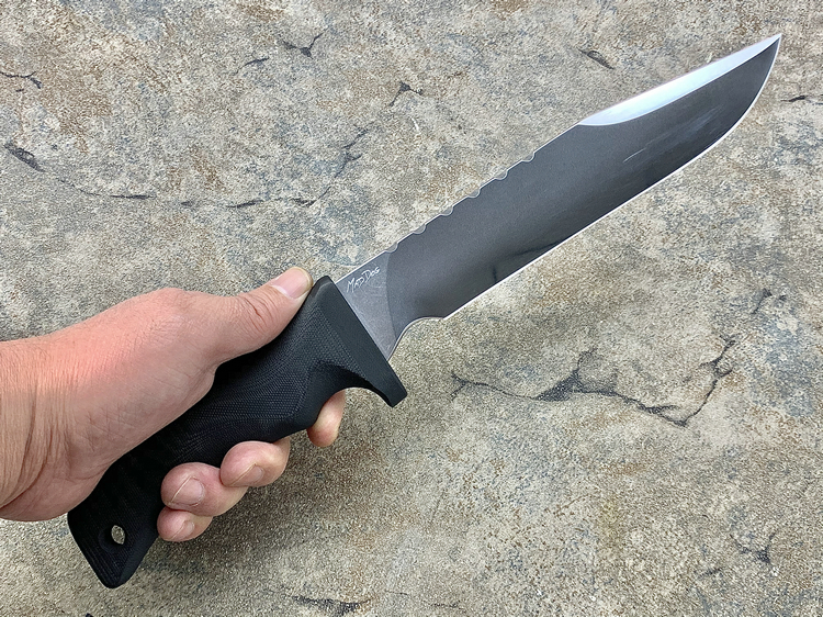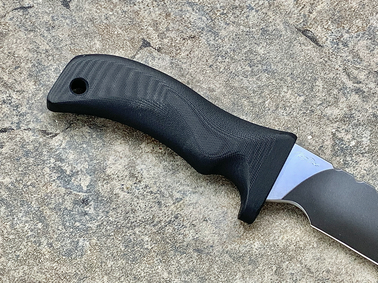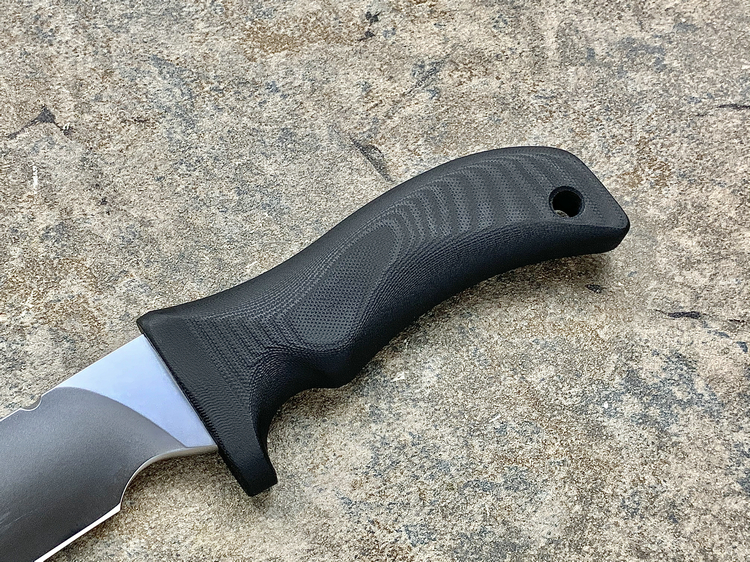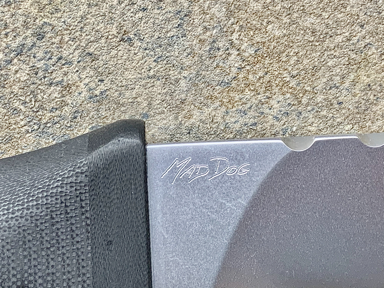 它的手柄符合人体工程学设计,把握极其舒适称手。食指凹槽让使用者即使看不见也能凭手感找到握刀的位置。材料使用特殊的玻璃纤维与环氧基树脂合成来做刀的握柄。此种特殊材质每一平方英寸可承受79000磅的压力(约3600公斤),可以轻易地承受0.45口径子弹的冲击。因此Mad Dog刀的握柄就算很严苛的使用也不会造成损害。此种握柄材质同时也提供了极好的绝缘,每0.001吋可承受1000伏特的电压,因而可以保护持刀者不会在使用刀具时遭受电击。另外这种握柄材质也几乎不受化学物质的渗透及侵蚀。
