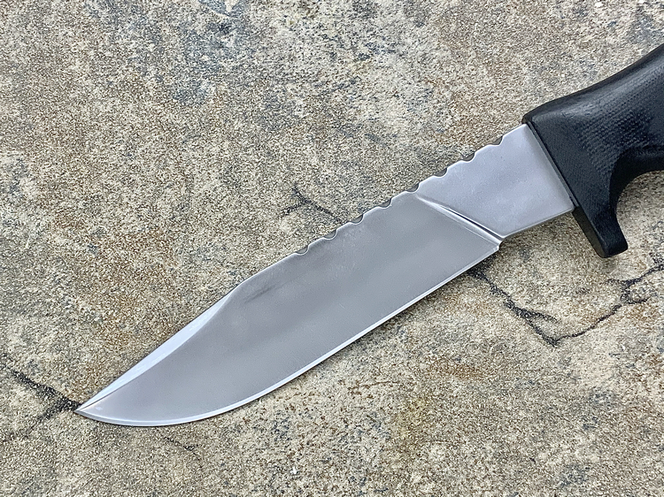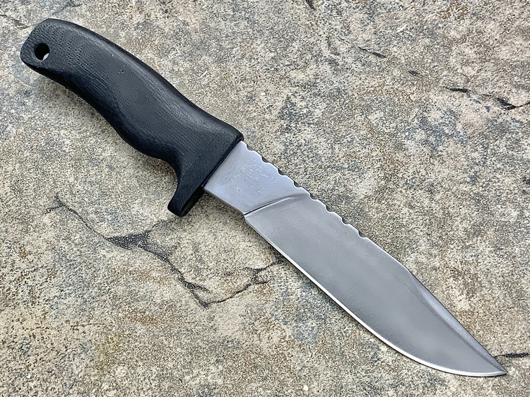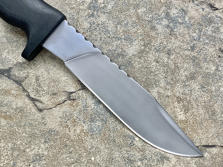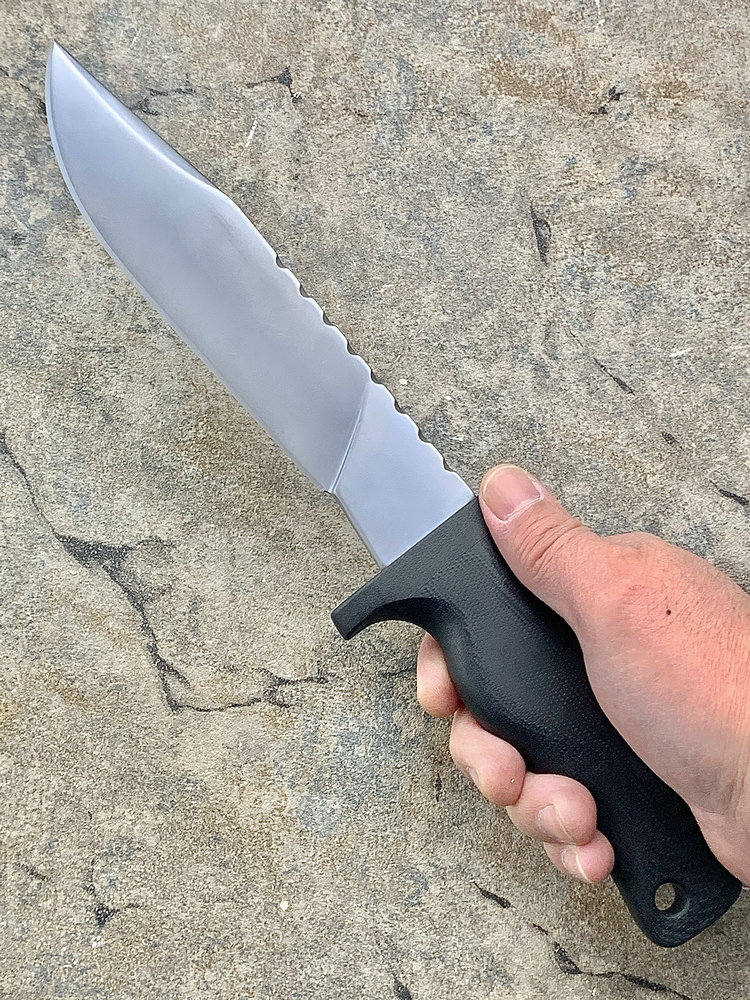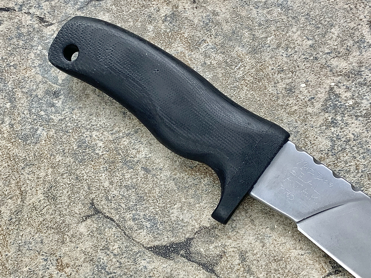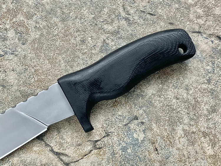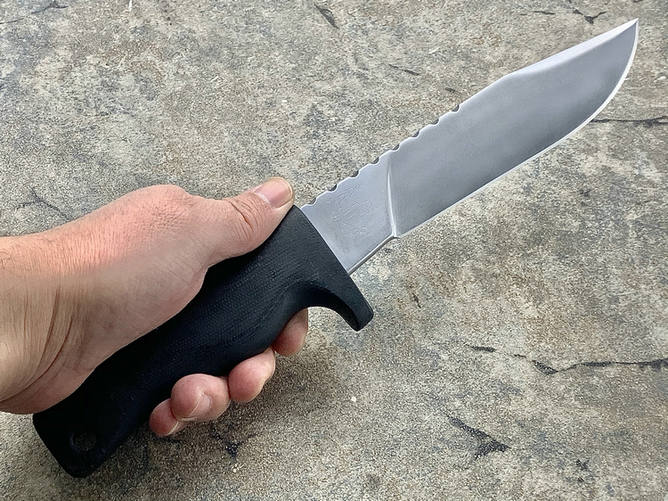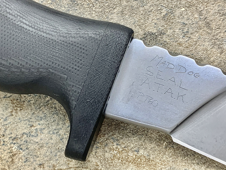 它的手柄符合人体工程学设计,把握极其舒适称手。食指凹槽让使用者即使看不见也能凭手感找到握刀的位置。材料使用特殊的玻璃纤维与环氧基树脂合成来做刀的握柄。此种特殊材质每一平方英寸可承受79000磅的压力(约3600公斤),可以轻易地承受0.45口径子弹的冲击。因此Mad Dog刀的握柄就算很严苛的使用也不会造成损害。此种握柄材质同时也提供了极好的绝缘,每0.001吋可承受1000伏特的电压,因而可以保护持刀者不会在使用刀具时遭受电击。另外这种握柄材质也几乎不受化学物质的渗透及侵蚀。