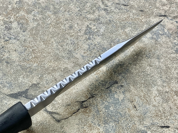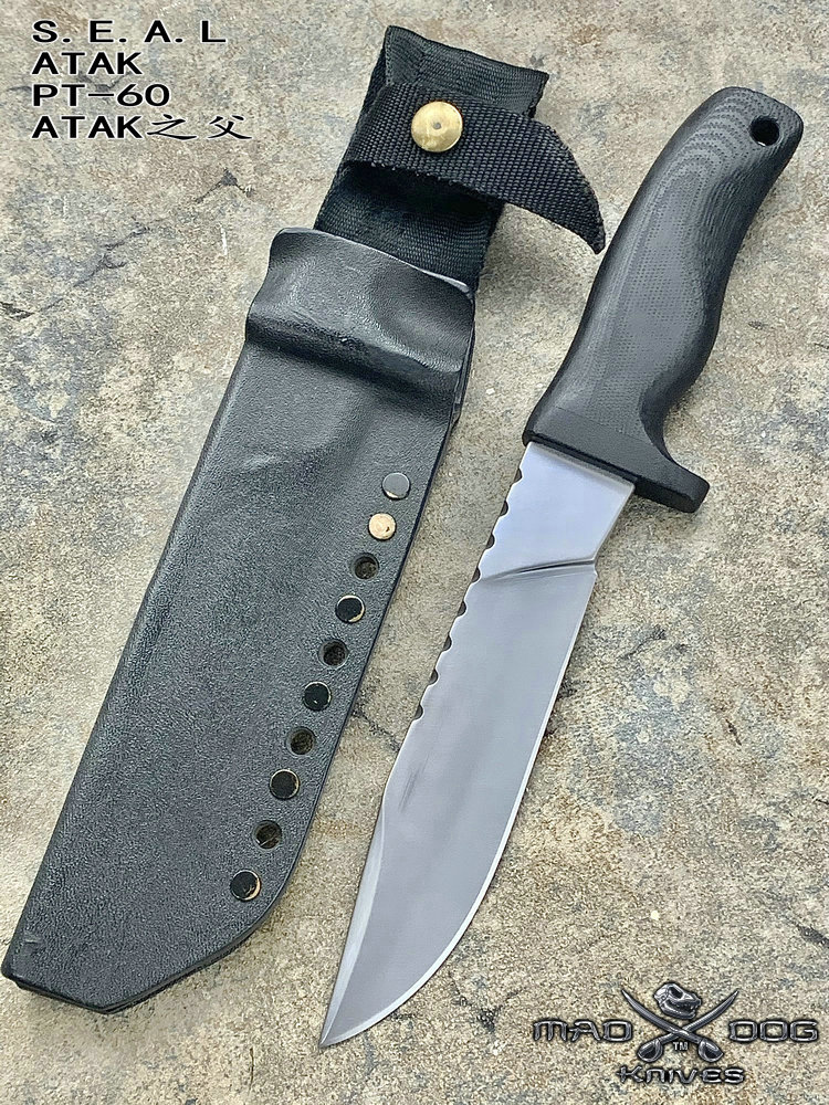 所有Mad Dog刀子及刀鞘系统都是以手工制作而成。Mad Dog钢材刀都是使用一种叫Starrett 496-O1的高碳工具钢,最独特的是它的热处理方式,先经过硬化(Hardened)然后再选择性回火(selectively tempered)而成。每个部分的热处理都不一样,刀锋部分的硬度是63-67HRC,在刀背部分则是50-55HRC,刀尖部分是59-61HRC,手柄部分48-52HRC,整刀分为4个部分处理,这种科学的方法成为分段热处理。这种方法可以使刀具既有很高的硬度又有较强的韧性,劈砍,穿刺,切割,撬砸等,能适应各种高强度工作。